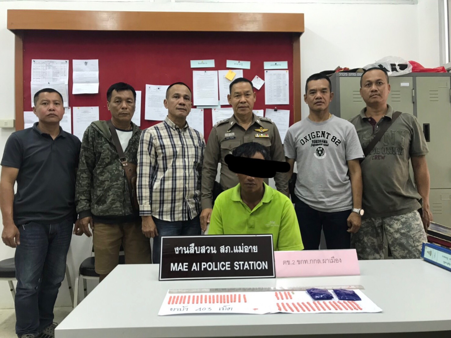 ร.ต.อ.ประพันธ์ โถงาม จึงได้แสดงตัวเป็นพง.ปปส.และแสดงบัตร ให้ดูแล้ว ได้ขอทำการตรวจค้นตัว นายกั๊ดฯ ได้ยินยอมให้ตรวจค้นโดยดี ก่อนตรวจค้นได้แสดงความบริสุทธิ์ให้ นายกั๊ดฯ ดูแล้วจึงได้ตรวจค้น ผลการตรวจค้นพบของกลางยาบ้า อยู่ในกระเป๋ากางเกงหน้าด้านซ้ายที่ผู้ต้องหาสวมใส่ เจ้าหน้าที่ชุดจับกุมได้ตรวจยึดไว้และได้สอบถาม นายกั๊ดฯ รับว่า ยาบ้าดังกล่าวเป็นของตนเอง เจ้าหน้าที่จึงได้สอบถามถึงเอกสารบัตรประจำตัวประชาชน หรือ หลักฐานแสดงฐานะบุคคล ซึ่ง นายกั๊ดฯ ไม่มีแสดงต่อเจ้าหน้าที่ จากการซักถาม นายกั๊ดฯ รับสารภาพว่า ตนเป็นบุคคลต่างด้าวได้เข้ามาประเทศไทย มาจาก เมืองยอน ประเทศเมียนมา และได้จับกุม นายกั๊ด ไม่ทราบนามสกุล อายุ 37 ปี ที่อยู่ เมืองยอน ประเทศเมียนมา ข้อหา “มียาเสพติดให้โทษ ยาบ้าหรือเมทแอมเฟตามีน ไว้ในความครอบครองเพื่อจำหน่าย โดยไม่รับอนุญาตและเสพยาเสพติด โดยไม่ได้รับอนุญาตและเป็นบุคคลต่างด้าวเข้ามาและอยู่ในราชอาณาจักรโดยไม่ได้รับอนุญาต ”พบยาบ้า เม็ดสีส้มกลมแบน ประทับอักษร wy จำนวน 200 เม็ด รวมยาบ้า 200 เม็ด บรรจุอยู่ถุงพลาสติกน้ำเงิน จำนวน 1 ถุงและยาบ้า เม็ดสีส้มกลมแบน ประทับอักษร wy จำนวน 201 เม็ด และเม็ดสีเขียว จำนวน 2 เม็ด รวมยาบ้า 203 เม็ด บรรจุอยู่ถุงพลาสติกน้ำเงิน จำนวน 1 ถุง รวมของกลาง ทั้งหมด 403 เม็ด และทำการตรวจปัสสาวะของ นายกั๊ด ไม่ทราบนามสกุล จากโรงพยาบาลแม่อายผลการตรวจพบสารเมทแอมเฟตามิน จึงได้นำตัวส่งพนักงานสอบสวนสถานีตำรวจภูธรแม่อายเพื่อดำเนินคดีตามกฏหมายแล้ว