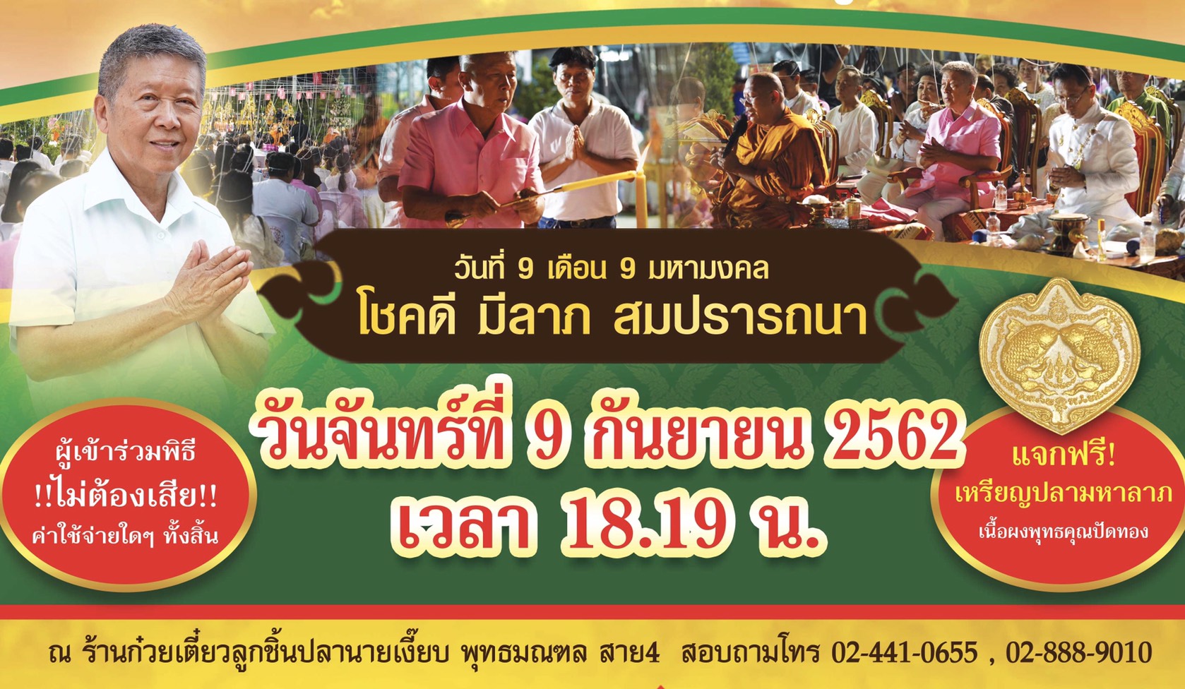 วันที่ 9 เดือน 9 พิธีสวดนพเคราะห์ตำรับหลวงพูล ณ ร้านก๋วยเตี๋ยว ลูกชิ้นปลานายเงี๊ยบ พุทธมณฑลสาย 4 แจกฟรี เหรียญปลามหาลาภ เนื้อผงพุทธคุณปัดทอง ผู้เข้าร่วมพิธี ไม่ต้องเสียค่าใช้จ่ายใดๆทั้งสิ้น