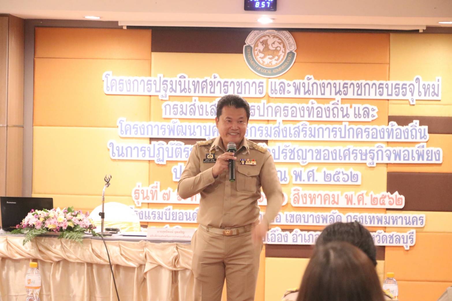 อธิบดี สถ. กล่าวว่า วันนี้มีความยินดีเป็นอย่างยิ่งที่ได้มีโอกาสมาพบปะผู้เข้ารับการฝึกอบรมโครงการปฐมนิเทศข้าราชการและพนักงานราชการบรรจุใหม่กรมส่งเสริมการปกครองท้องถิ่น และโครงการพัฒนาบุคลากรกรมส่งเสริมการปกครองท้องถิ่นในการปฏิบัติราชการบนหลักปรัชญาของเศรษฐกิจพอเพียง (รุ่นที่ 7) ประจำปีงบประมาณ พ.ศ. ๒๕๖2 ในวันนี้ ก็ขอแสดงความยินดีและขอต้อนรับทุกท่านเข้าสู่ครอบครัวของกรมส่งเสริมการปกครองท้องถิ่น (สถ.) ซึ่งกรมส่งเสริมการปกครองท้องถิ่นเป็นหน่วยงานหลักในการส่งเสริมสนับสนุน ให้คำปรึกษา และแนะนำองค์กรปกครองส่วนท้องถิ่น (อปท.) ให้มีความเข้มแข็งและมีการบริหารจัดการที่ดี เพื่อให้เกิดประโยชน์สุขต่อประชาชน ครอบคลุม ทั้งในเรื่องการบริหารงาน การบริหารการเงินการคลัง การจัดทำยุทธศาสตร์และแผนพัฒนาและการบริหารงานบุคคล ภายใต้วิสัยทัศน์ “องค์กรปกครองส่วนท้องถิ่นจัดบริการสาธารณะตามมาตรฐานไม่น้อยกว่าร้อยละ 70 ได้อย่างทั่วถึง เพื่อให้ประชาชนมีคุณภาพชีวิตที่ดี ภายในปี 2565” นอกจากนั้นกรมส่งเสริมการปกครองท้องถิ่นยังเป็นหน่วยงานสำคัญในการนำนโยบายต่างๆ ของรัฐบาล และกระทรวงมหาดไทย ไปสู่การปฏิบัติ เป็นหน่วยงานในการสนับสนุนการดำเนินงานของส่วนราชการต่างๆ เพื่อเชื่อมประสานกับ อปท.