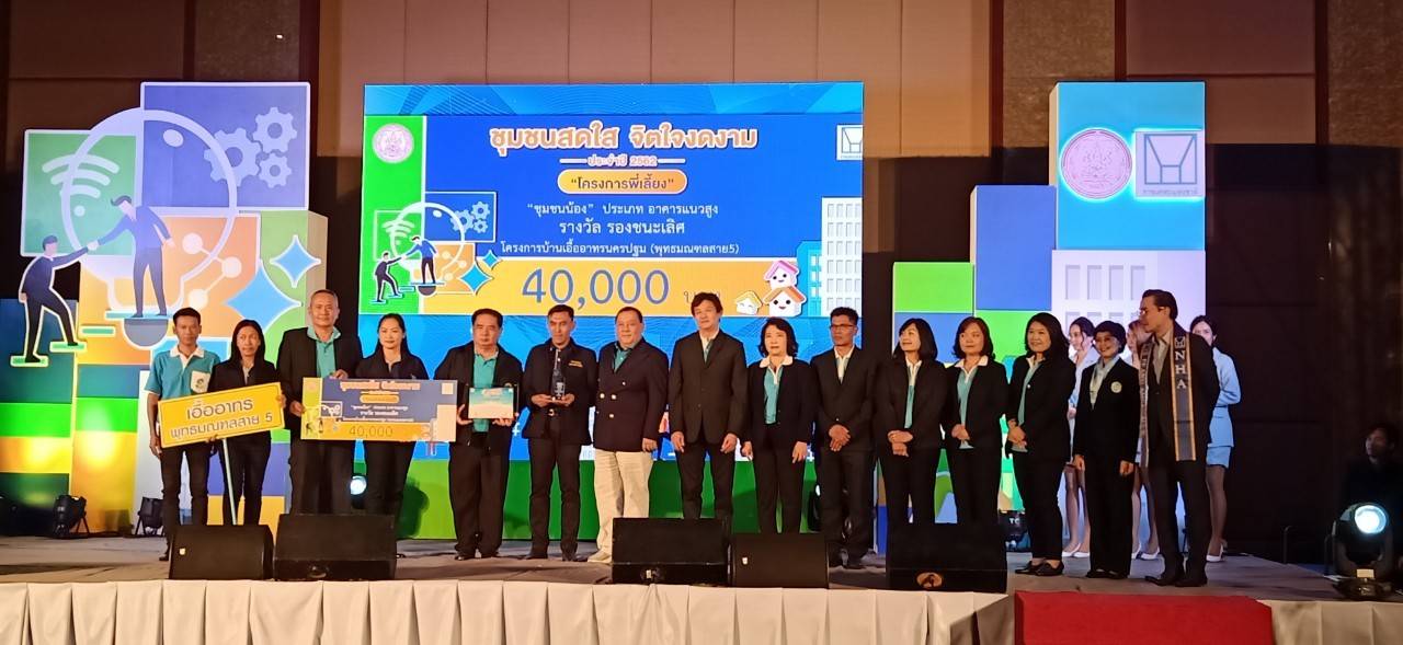 โดยทั้งประเทศที่รับใด้คัดเลือกในรอบสุดท้ายมี4ชุมชน…ชุมชนบ้านเอื้ออาทรนครปฐม (พุทธมณฑล สาย 5)…ได้รับรางวัลรองชนะเลิศ ถ้วยรางวัลพร้อมด้วยเงินสด 40,000บาท.. รับรางวัล จาก นายจุติ ไกรฤกษ์ รัฐมนตรีกระทรวงพัฒนาสังคมและความมั่นคงของมนุษย์ ภายในงานมีการเปิดตัวแอมบัสเดอร์คนใหม่ของการเคหะแห่งชาติ นายเมทะนี (มีโน่)บุรณศิริ พร้อมกันนี้นายจำรัส ตั้งตระกูลธรรม นายกเทศมนตรีเมืองไร่ขิง ในฐานะผุ้นำท้องถิ่น ร่วมรับรางวัลพร้อมกับ นายสมยศ อินทกุล ประธานชุมชนบ้านเอื้ออาทรนครปฐม (พุทธมณฑล สาย 5) นายประจวบ เถียวทวี สมาชิกสภาเทศบาลเมืองไร่ขิง เขต3 ชาวชุมชนชุมชนบ้านเอื้ออาทรนครปฐม (พุทธมณฑล สาย 5) กรรมการนิติบุคคล+กรรมการชุมชน พี่น้องในชุมชน ร่วมเป็นกองเชียร์ และแสดงความยินดี