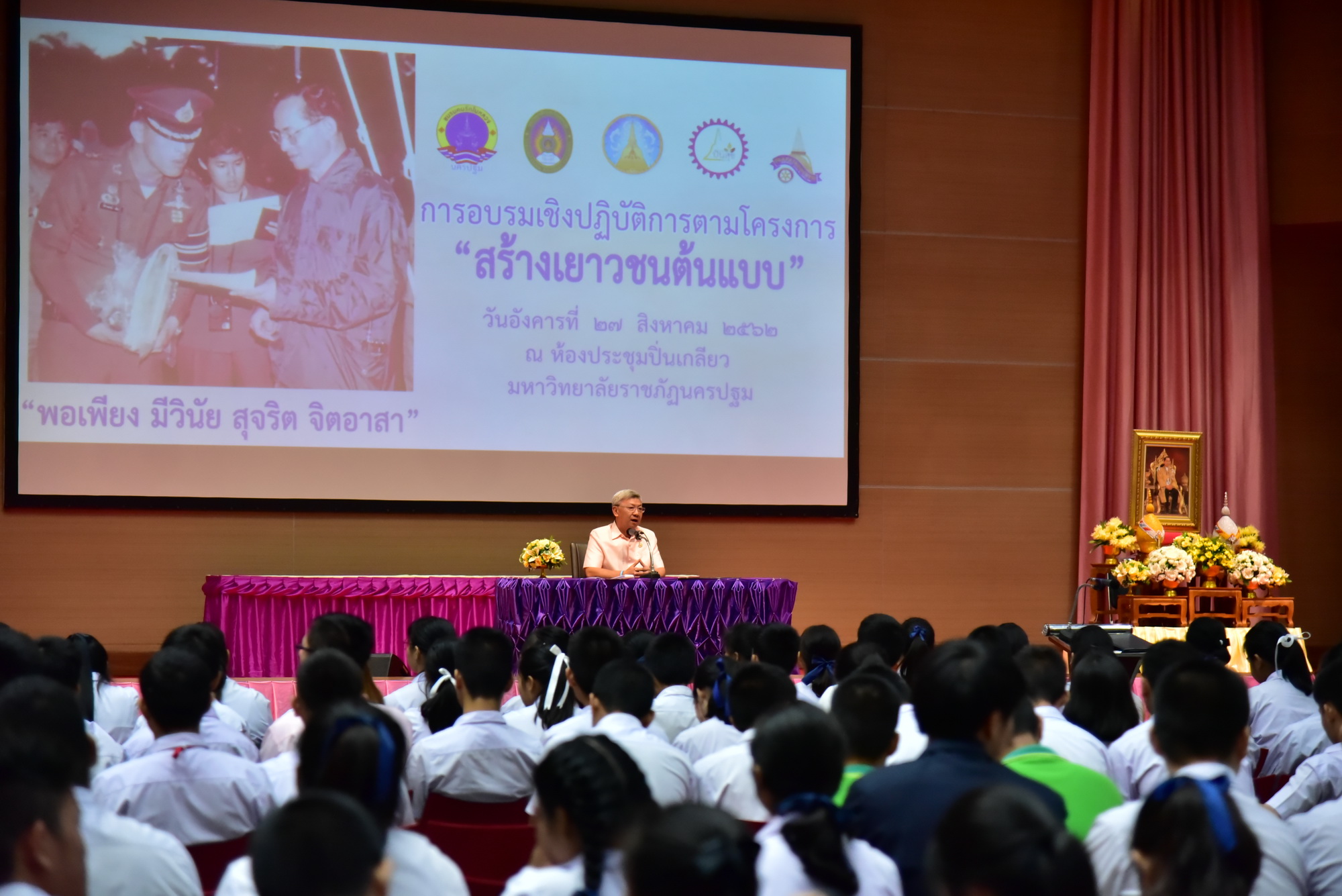 วันที่ 27 สิงหาคม 2562 ที่ห้องประชุมปิ่นเกลียว มหาวิทยาลัยราชภัฏนครปฐม นายชาญนะ เอี่ยมแสง ผู้ว่าราชการจังหวัดนครปฐม เป็นประธานเปิดโครงการ “สร้างเยาวชนต้นแบบ” ชมรมคนรักในหลวงจังหวัดนครปฐม โดยนางยุพิน ดุษิยามี ประธานชมรมคนรักในหลวงจังหวัดนครปฐม กล่าวว่า การจัดโครงการ “สร้างเยาวชนต้นแบบ” ชมรมคนรักในหลวงจังหวัดนครปฐมได้จัดมาแล้ว 4 ครั้ง ครั้งที่ 1-4 จัดร่วมกับคณะกรรมการจริยธรรมประจำจังหวัดนครปฐม สำหรับครั้งนี้ เป็นครั้งที่ 5 จัดร่วมกับสำนักศิลปะและวัฒนธรรมมหาวิทยาลัยราชภัฏนครปฐม และมูลนิธิปันสุข เพื่อให้เยาวชนมุ่งมั่น ปฏิบัติตนในการขับเคลื่อนคุณธรรมตามแผนแม่บทคุณธรรมแห่งชาติ ว่าด้วยเรื่อง “พอเพียง มีวินัย สุจริต และจิตอาสา” ตามนโยบายของรัฐบาล โดยคัดเลือกเยาวชนที่มีคุณลักษณะผู้นำ จากสถานศึกษา 26 สถาบัน และครูที่ปรึกษาสถาบันละ 1คน รวมทั้งสิ้น 300 คน เข้าร่วมโครงการเพื่อเฉลิมพระเกียรติสถาบันพระมหากษัตริย์ ตอบสนองพระราชกระแสพระบาทสมเด็จพระบรมชนกาธิเบศร มหาภูมิพลอดุลยเดชมหาราช บรมนาถบพิตร ที่ทรงรับสั่งว่า “ช่วยกันสร้างคนดีให้บ้านเมือง” และสนองพระราชปณิธานพระบาทสมเด็จพระวชิรเกล้าเจ้าอยู่หัว “จิตอาสา เราทำความดีด้วยหัวใจ”