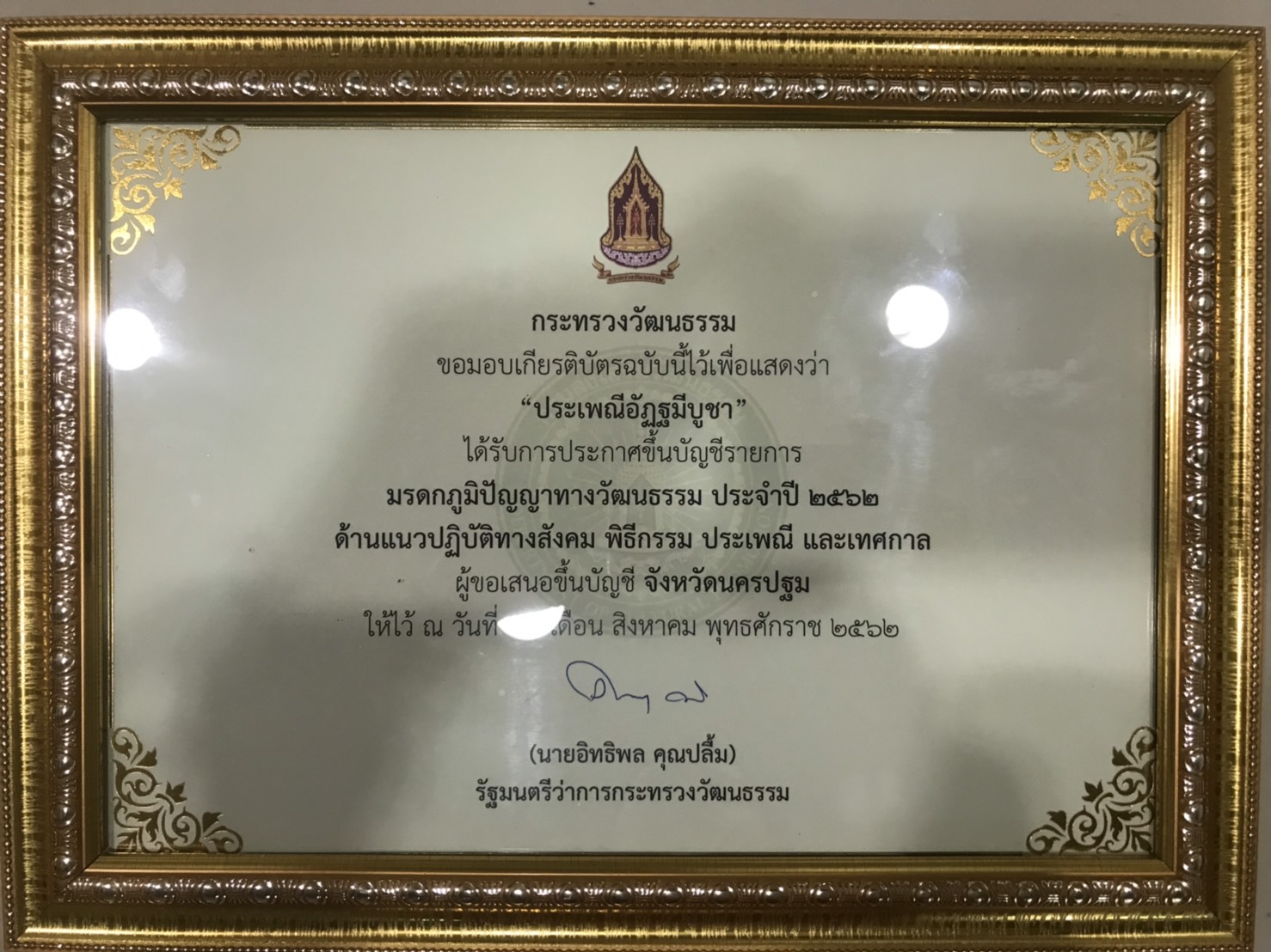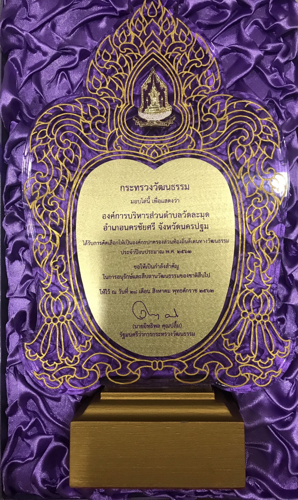 ประเพณีอัฏฐมีบูชา อบต.วัดละมุด ได้รับรางวัลด้านแนวปฏิบัติทางสังคม พิธีกรรม ประเพณี และงานเทศกาล ในงานประกาศขึ้นบัญชีมรดกภูมิปัญญาทางวัฒธรรมและพิธียกย่องเชิดชูเกียรติภาคีเครือข่ายทางวัฒนธรรมประจำปี พ.ศ. 2562