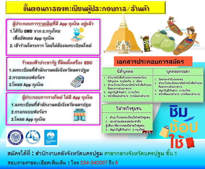 จึงขอเชิญชวน ผู้ประกอบการรายใหม่ และร้านธงฟ้าประชารัฐ ที่ติดตั้งเครื่อง EDC ที่ยังไม่มี Application “ถุงเงิน” สามารถลงทะเบียนเพื่อรองรับมาตรการดังกล่าว ได้ที่ สำนักงานคลังจังหวัดนครปฐม ศาลากลางจังหวัดนครปฐม ชั้น 1 ตั้งแต่บัดนี้เป็นต้นไป จนถึงวันที่ 20 กันยายน 2562 เวลา 08.30 – 16.30 น. ทุกวัน ไม่เว้นวันหยุดราชการ ในส่วนของผู้ประกอบการรายเดิมที่มี Application “ถุงเงิน” อยู่แล้ว จะได้รับ SMS จากธนาคารกรุงไทย เพื่ออัพเดท Application “ถุงเงิน” เข้าร่วมโครงการ โดยไม่ต้องลงทะเบียนใหม่