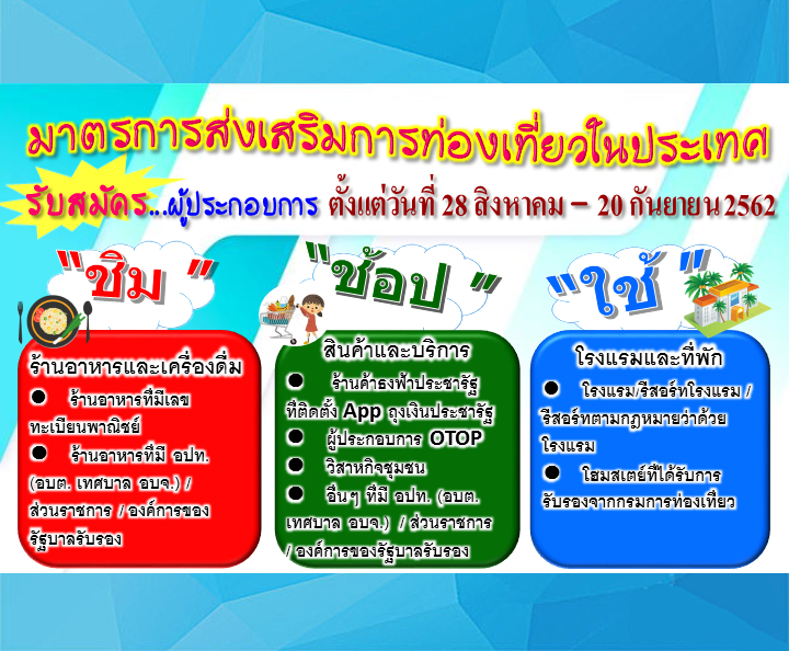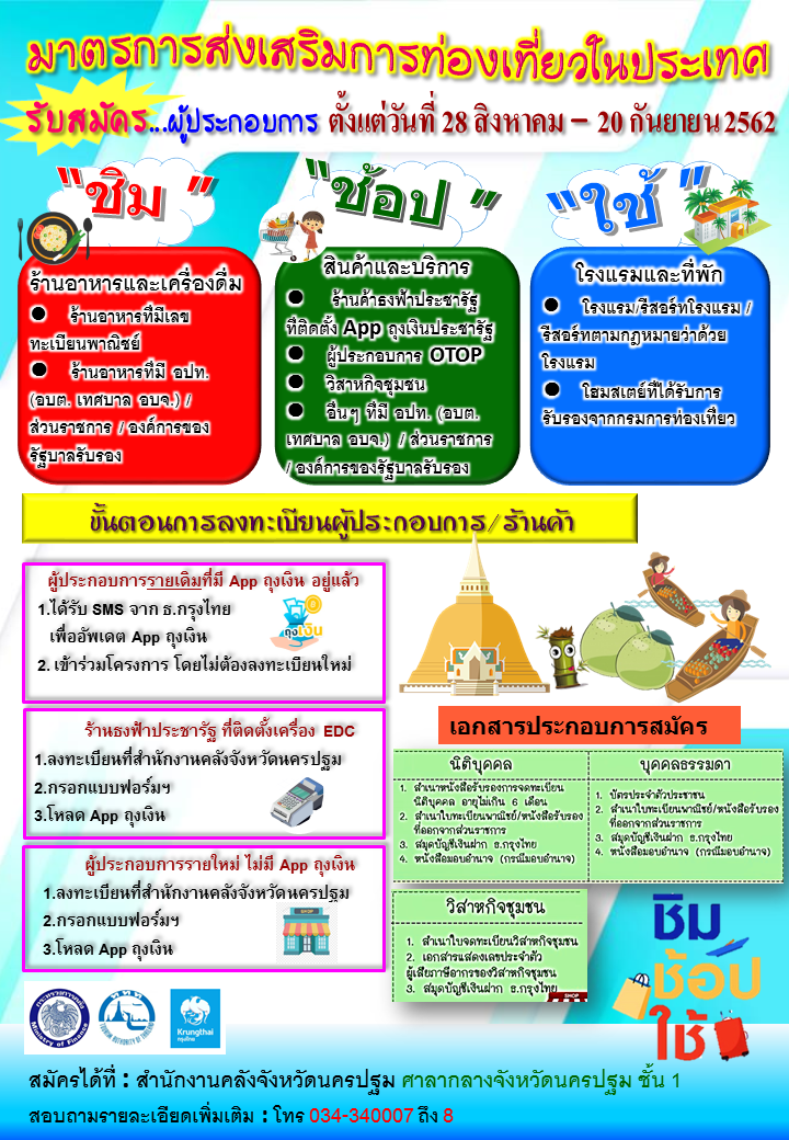 สำนักงานคลังจังหวัดนครปฐม ขอเชิญผู้ประกอบการรายใหม่ และร้านธงฟ้าประชารัฐ ลงทะเบียน Application “ถุงเงิน” เพื่อรองรับมาตรการส่งเสริมการท่องเที่ยวในประเทศ “ชิม ช้อป ใช้” ตั้งแต่บัดนี้เป็นต้นไปจนถึงวันที่ 20 กันยายน 2562