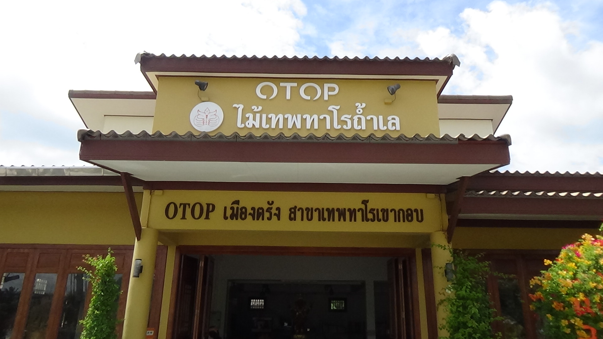 ที่ศูนย์โอทอป เลขที่ 78/2 หมู่ที่ 1 ตำบลเขากอบ อำเภอห้วยยอด จังหวัดตรัง เป็นที่ตั้งของกลุ่มผลิตภัณฑ์ไม้เทพธาโร ถ้ำเลเขากอบ นายสุภาพ พลการ ประธานกลุ่มผลิตภัณฑ์ไม้เทพธาโรถ้ำเลเขากอบ กล่าวว่า ได้ทำผลิตภัณฑ์แกะสลักจากไม้เทพธาโร ซึ่งถือว่าเป็นไม้มงคล และมีกลิ่นหอม เป็นที่นิยมชื่นชอบของนักท่องเที่ยว นิยมหาซื้อไปเป็นของขวัญของฝาก ให้กับผู้ที่เคารพนับถือกันเป็นจำนวนมาก โดยมีการแกะสลักในรูปแบบต่างๆ เช่น พระพุทธรูป พญานาค พระพิฆเนศ เทพเจ้ากวนอู และที่ประชาชนและนักท่องเที่ยวใจให้ความสนใจมาซื้ออย่างต่อเนื่อง คือ พะยูน เนื่องจากพะยูนนั้นเป็นสัตว์สัญลักษณ์ประจำจังหวัดตรัง