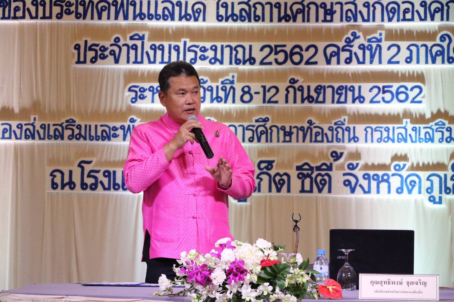 เมื่อวันที่ 9 กันยายน 2562 นายสุทธิพงษ์ จุลเจริญ อธิบดีกรมส่งเสริมการปกครองท้องถิ่น เป็นประธานเปิดโครงการประชุมสัมมนาเชิงปฏิบัติการเพื่อพัฒนาศักยภาพครูสู่การบูรณาการเรียนรู้ตามแนวทางของประเทศฟินแลนด์ ในสถานศึกษาสังกัดองค์กรปกครองส่วนท้องถิ่น ประจำปีงบประมาณ 2562 โดยมี นายนพพร อัจฉริยวนิช เอกอัคราชทูต ณ กรุงเฮลซิงกิ ประเทศฟินแลนด์ Mrs. Saara Marvala Mrs. Laura Sinnemaki และ Mrs.Pirjo Levaniemi คณะครูจาก Kuoppanummi School ประเทศฟินแลนด์ นางสาวสมใจ สุวรรณศุภพนา นายกเทศมนตรีนครภูเก็ต ผู้บริหารเทศบาลนครภูเก็ต ผู้อำนวยการสถานศึกษา ครู และบุคลากรทางการศึกษาในสังกัดองค์กรปกครองส่วนท้องถิ่น เข้าร่วม ณ โรงแรมรอยัลภูเก็ต ซิตี้ อำเภอเมืองภูเก็ต จังหวัดภูเก็ต