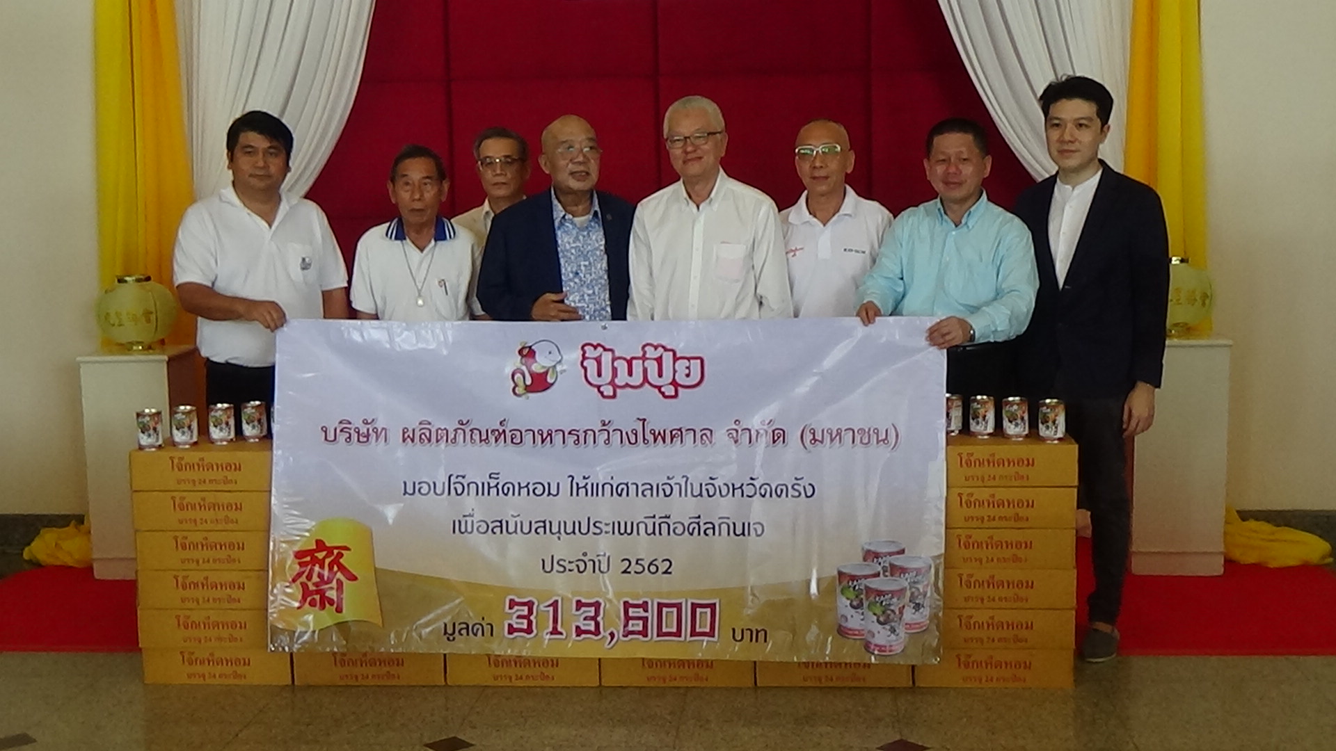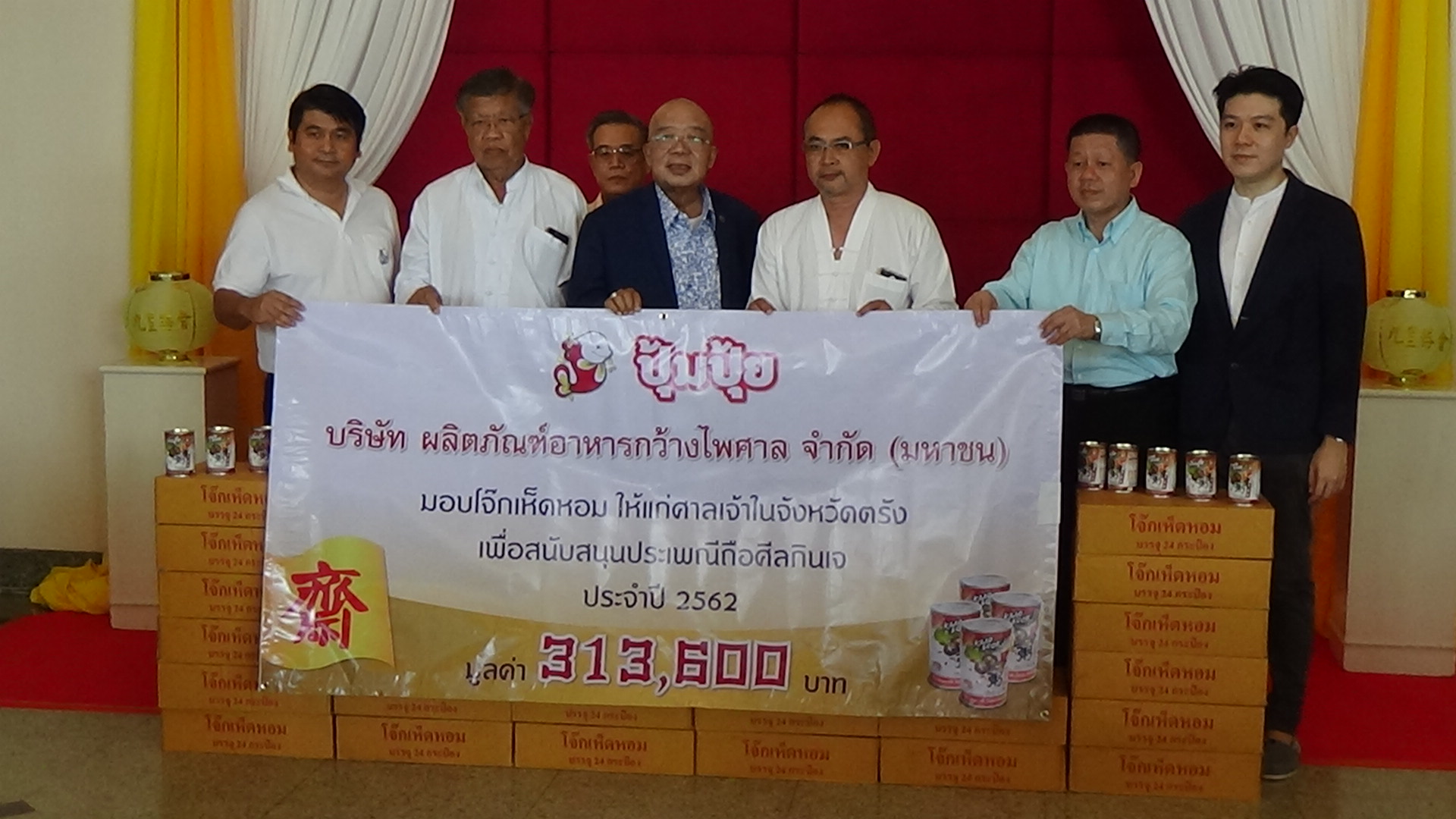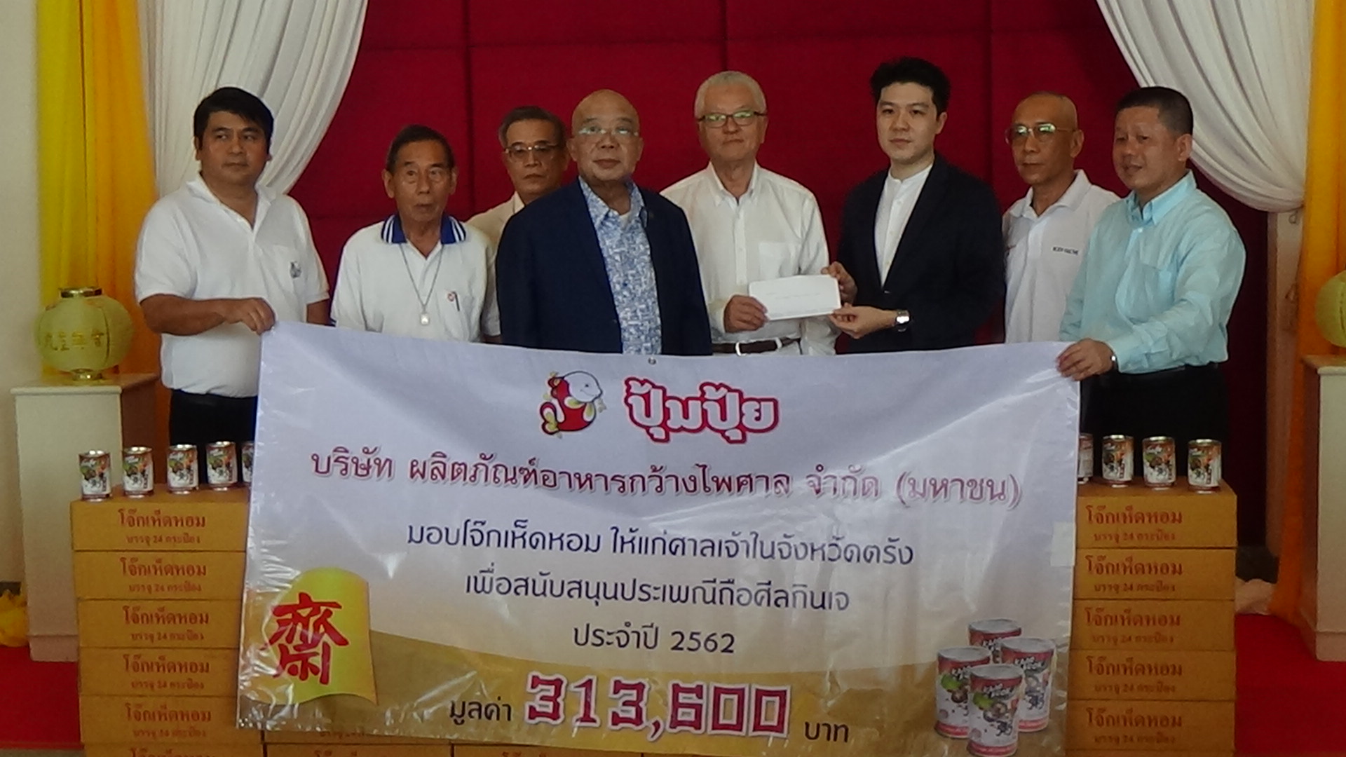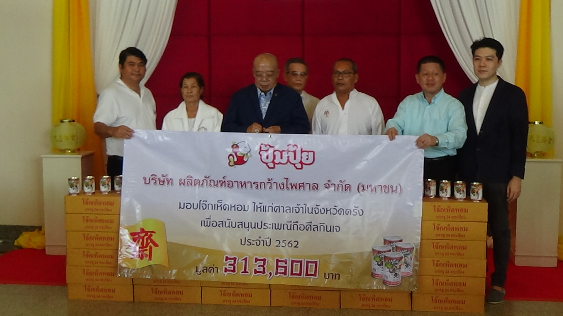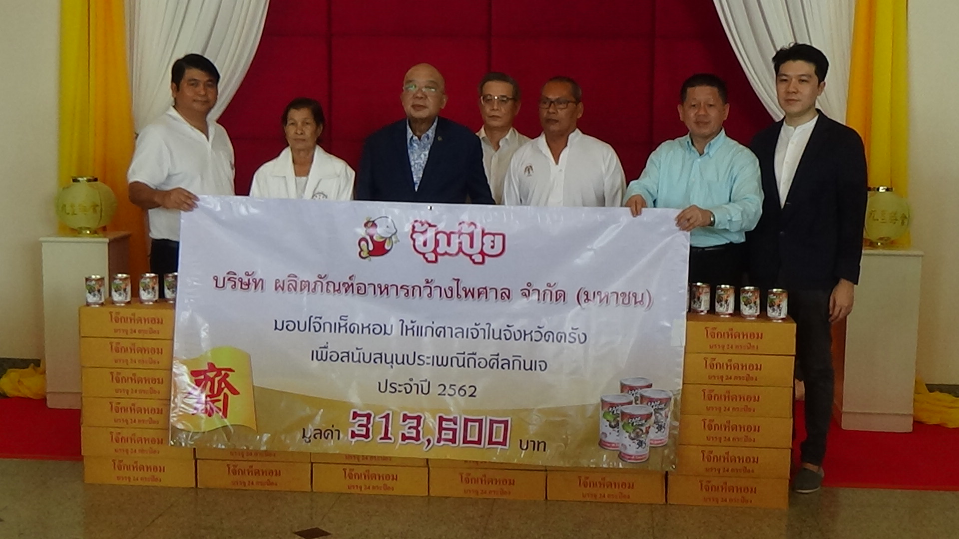 บริษัทผลิตภัณฑ์อาหารกว้างไพศาลจำกัด (มหาชน) มอบผลิตภัณฑ์โจ๊กสำเร็จรูป รสเห็ดหอม มูลค่ารวม 313,600 บาท ให้แก่ผู้แทนจาก 10 ศาลเจ้าในจังหวัดตรัง เพื่อส่งเสริมเทศกาลถือศีลกินเจ