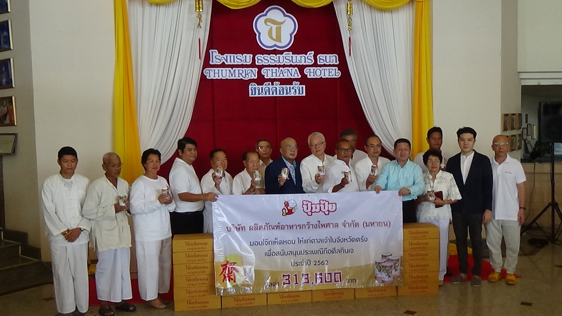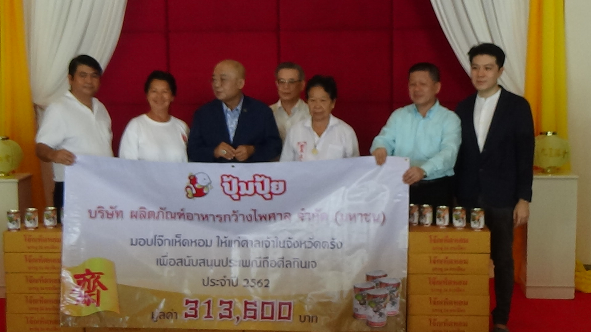 ทั้งนี้ได้มอบโจ๊กสำเร็จรูป รสเห็ดหอม มูลค่ารวม 313,600 บาท ให้แก่ผู้แทนจาก 10 ศาลเจ้าในจังหวัดตรัง ประกอบด้วยศาลเจ้าพ่อหมื่นราม ศาลเจ้กิวอ่องเอี่ย ศาลเจ้าไต่เซี่ยฮุดโจ้ว ศาลดจ้าพ่อเสือ ศาลเจ้ากิวอ่องไต่เต่ ห้วยยอด ศาลเจ้ากวนอิมเก็ง ศาลเจ้าเล่าแปะกงทุ่งยาว (สหธรรมทุ่งยาว) ศาลเจ้าเห้งเจียไต่เซี่ยฮุ้ดโจ้ว ศาลเจ้าอ๊ามส่ามอ๋องฮู้เต้าโบ้งเก้ง และศาลเจ้าเปากง เพื่อสนับสนุนประเพณีถือศีลกินเจจังหวัดตรัง ประจำปี 2562 ซึ่งตรงกับวัน28 กันยายน -7 ตุลาคม 2562