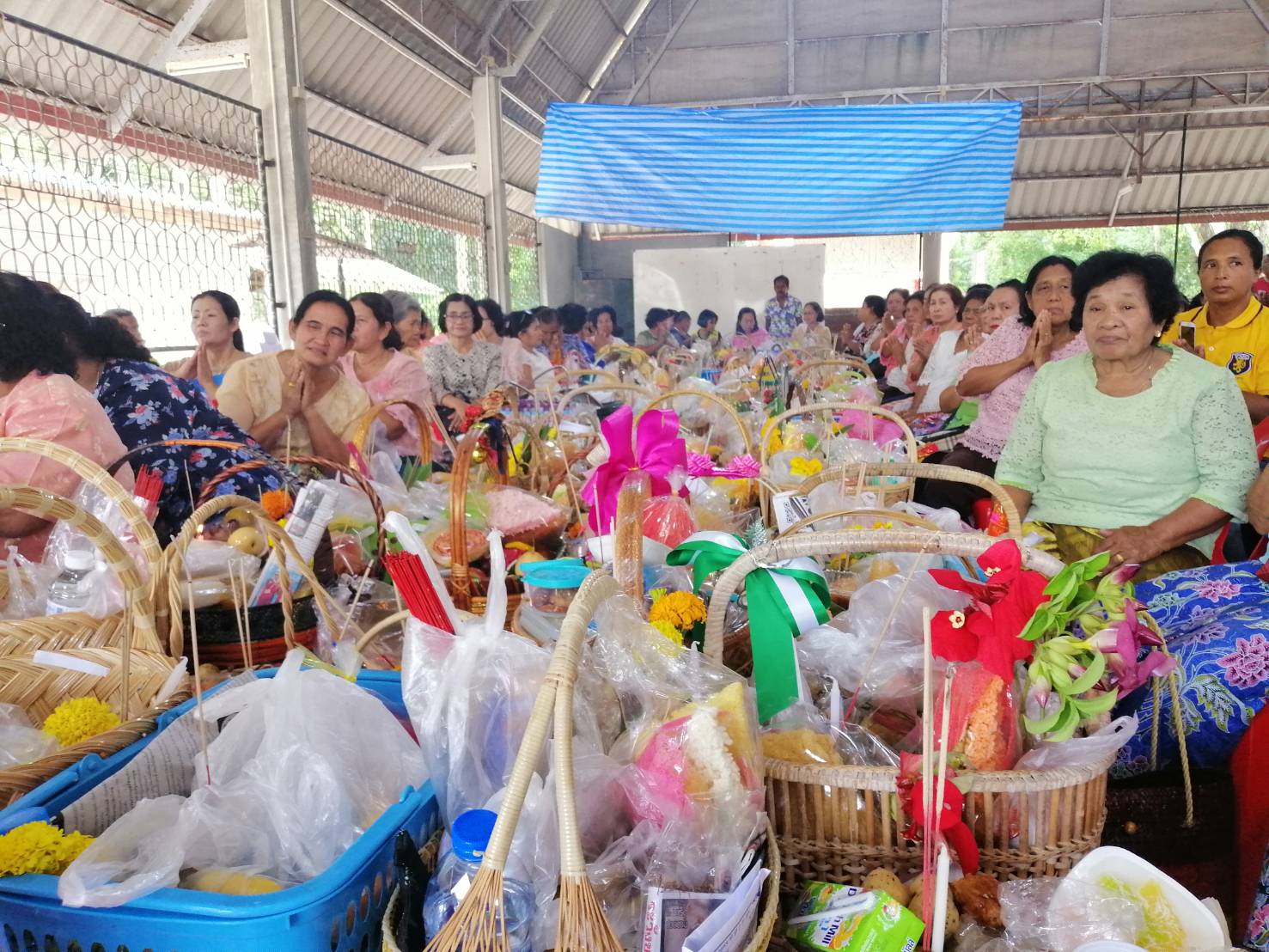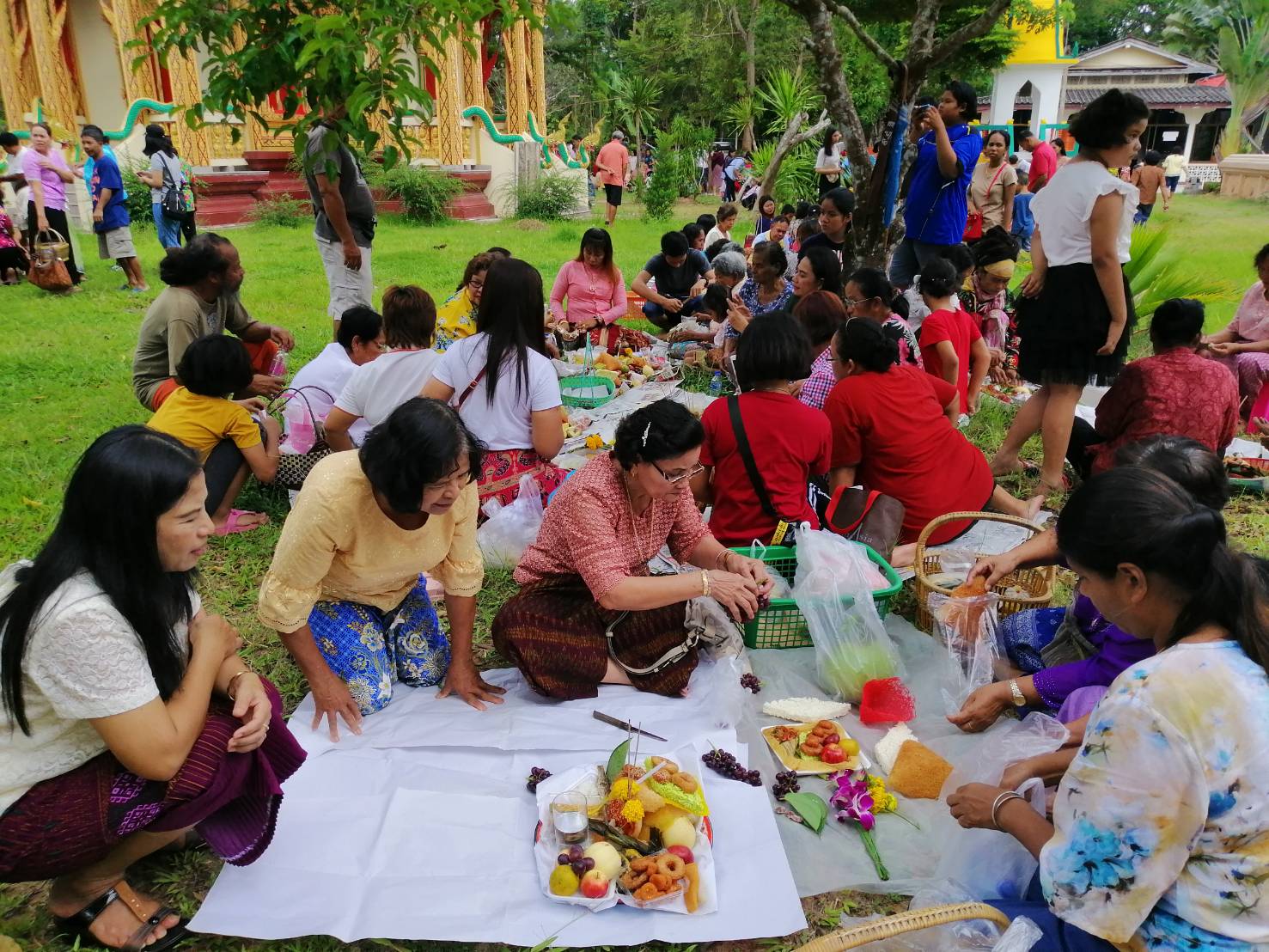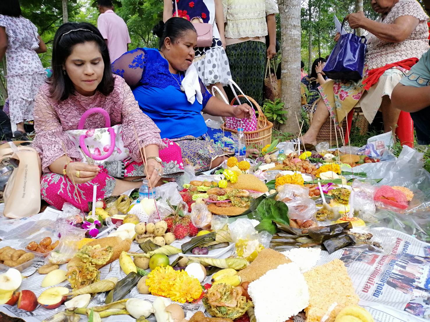 สำหรับอาหารคาวหวานที่นำมาทำบุญในวันนี้ โดยเป็นสิ่งที่ขาดไม่ได้ คือ ขนมลา ขนมพอง ขนมบ้า ขนมดีซัม หรือขนมรู และขนมกง เพราะมีความเชื่อที่ว่า ขนมทั้ง 5 อย่างเป็นสัญลักษณ์แทนสิ่งของเครื่องใช้ซึ่งผู้ล่วงลับไปแล้วสามารถนำไปใช้เป็นยานพาหนะ เครื่องนุ่งห่ม เครื่องประดับ เงินทอง และของเล่นตามประเพณี นอกจากนั้น ยังได้มีการนำอาหารอีกส่วนหนึ่งไปตั้งบริเวณรอบนอกวัดเพื่อเป็นการตั้งเปรต หรือสัมภเวสีอย่างละเล็กอย่างละน้อย หรือตามความเชื่อที่เรียกว่า การตั้งเปรต ก่อนที่จะมีการถวายสังฆทานแก่พระสงฆ์ พร้อมกับกรวดน้ำให้แก่บรรพบุรุษผู้ล่วงลับ ถือเป็นการทำส่งบรรพบุรุษผู้ล่วงลับอย่างสมบูรณ์