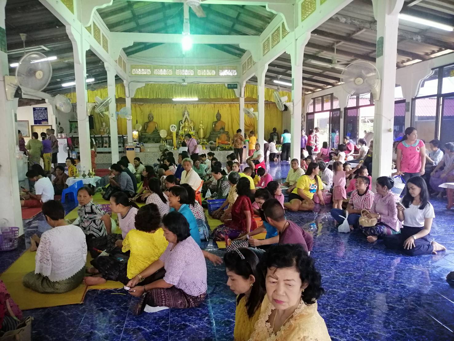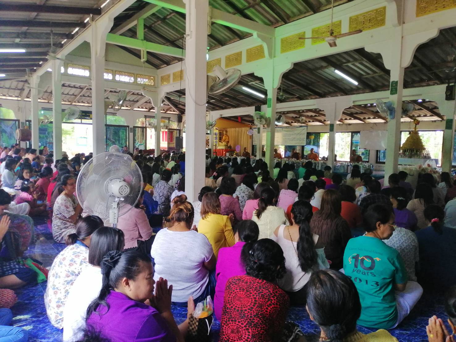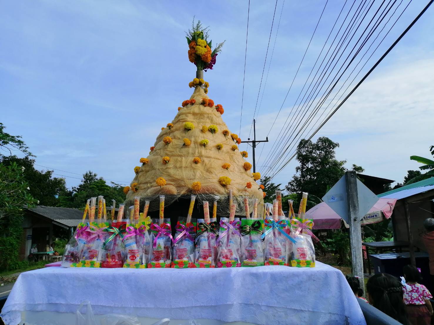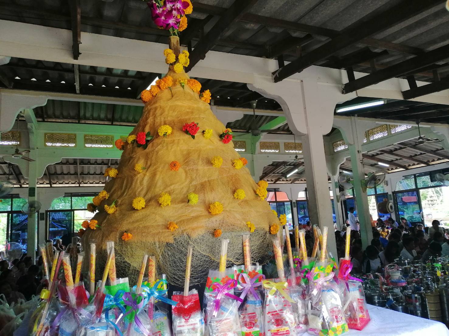สำหรับอาหารคาวหวานที่นำมาทำบุญในวันนี้ โดยเป็นสิ่งที่ขาดไม่ได้ คือ ขนมลา ขนมพอง ขนมบ้า ขนมดีซัม หรือขนมรู และขนมกง เพราะมีความเชื่อที่ว่า ขนมทั้ง 5 อย่างเป็นสัญลักษณ์แทนสิ่งของเครื่องใช้ซึ่งผู้ล่วงลับไปแล้วสามารถนำไปใช้เป็นยานพาหนะ เครื่องนุ่งห่ม เครื่องประดับ เงินทอง และของเล่นตามประเพณี นอกจากนั้น ยังได้มีการนำอาหารอีกส่วนหนึ่งไปตั้งบริเวณรอบนอกวัดเพื่อเป็นการตั้งเปรต หรือสัมภเวสีอย่างละเล็กอย่างละน้อย หรือตามความเชื่อที่เรียกว่า การตั้งเปรต ก่อนที่จะมีการถวายสังฆทานแก่พระสงฆ์ พร้อมกับกรวดน้ำให้แก่บรรพบุรุษผู้ล่วงลับ ถือเป็นการทำส่งบรรพบุรุษผู้ล่วงลับอย่างสมบูรณ์