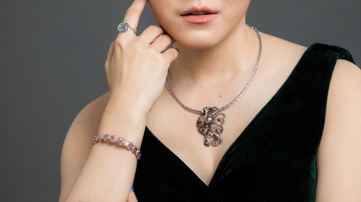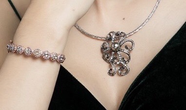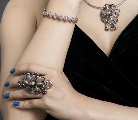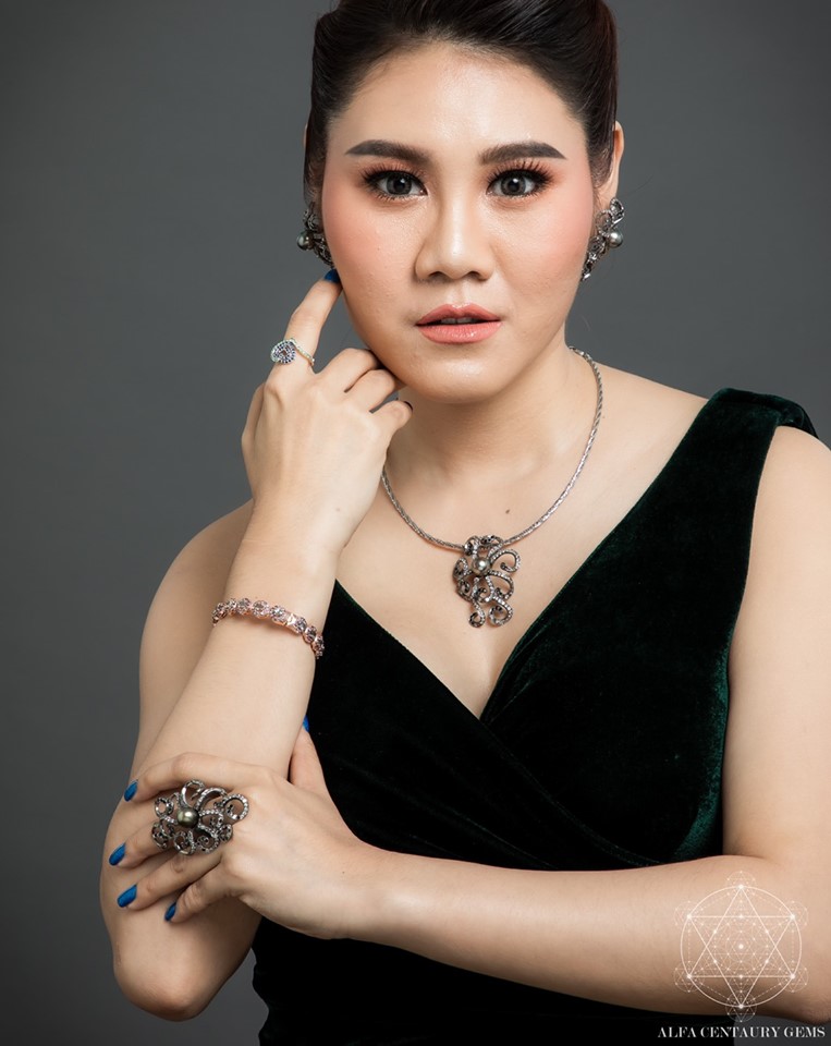โดยเฉพาะต่างหูที่ใช้ไข่มุกตาฮิติร่วมกับเพชร จะยิ่งดึงดูดออร่าออกมาได้ถึงขีดสุด ตัวเรือนประดับด้วย WHITE TOPAZ BLACK SPINAL SMOKE QUARTZ