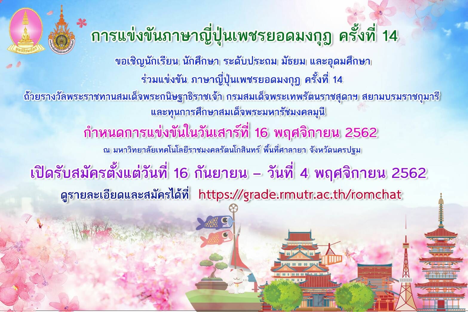 มูลนิธิร่มฉัตร ร่วมกับมหาวิทยาลัยเทคโนโลยีราชมงคลรัตนโกสินทร์ จัดการแข่งขันภาษาญี่ปุ่นเพชรยอดมงกุฎ ครั้งที่ 14 ขอเชิญนักเรียน นิสิต นักศึกษา ระดับชั้นประถมศึกษา มัธยมศึกษา และอุดมศึกษา เข้าร่วมแข่งขันถ้วยพระราชทานสมเด็จพระกนิษฐาธิราชเจ้า กรมสมเด็จพระเทพรัตนราชสุดาฯ สยามบรมราชกุมารี และทุนการศึกษาอื่น ๆ กำหนดสอบแข่งขันวันเสาร์ ที่ 16 พฤศจิกายน 2562 ณ มหาวิทยาลัยเทคโนโลยีราชมงคลรัตนโกสินทร์ พื้นที่ศาลายา จังหวัดนครปฐม