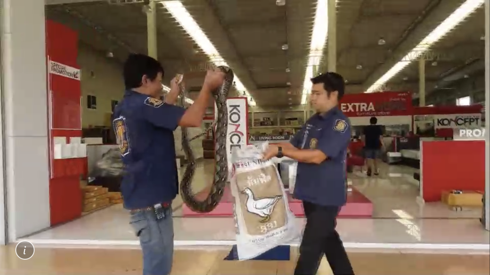 สุพรรณบุรี เหลือมยาวเกือบ 4 เมตร บุกร้านเฟอร์นิเจอร์กินนกพิราบกัดกู้ภัยเจ็บ