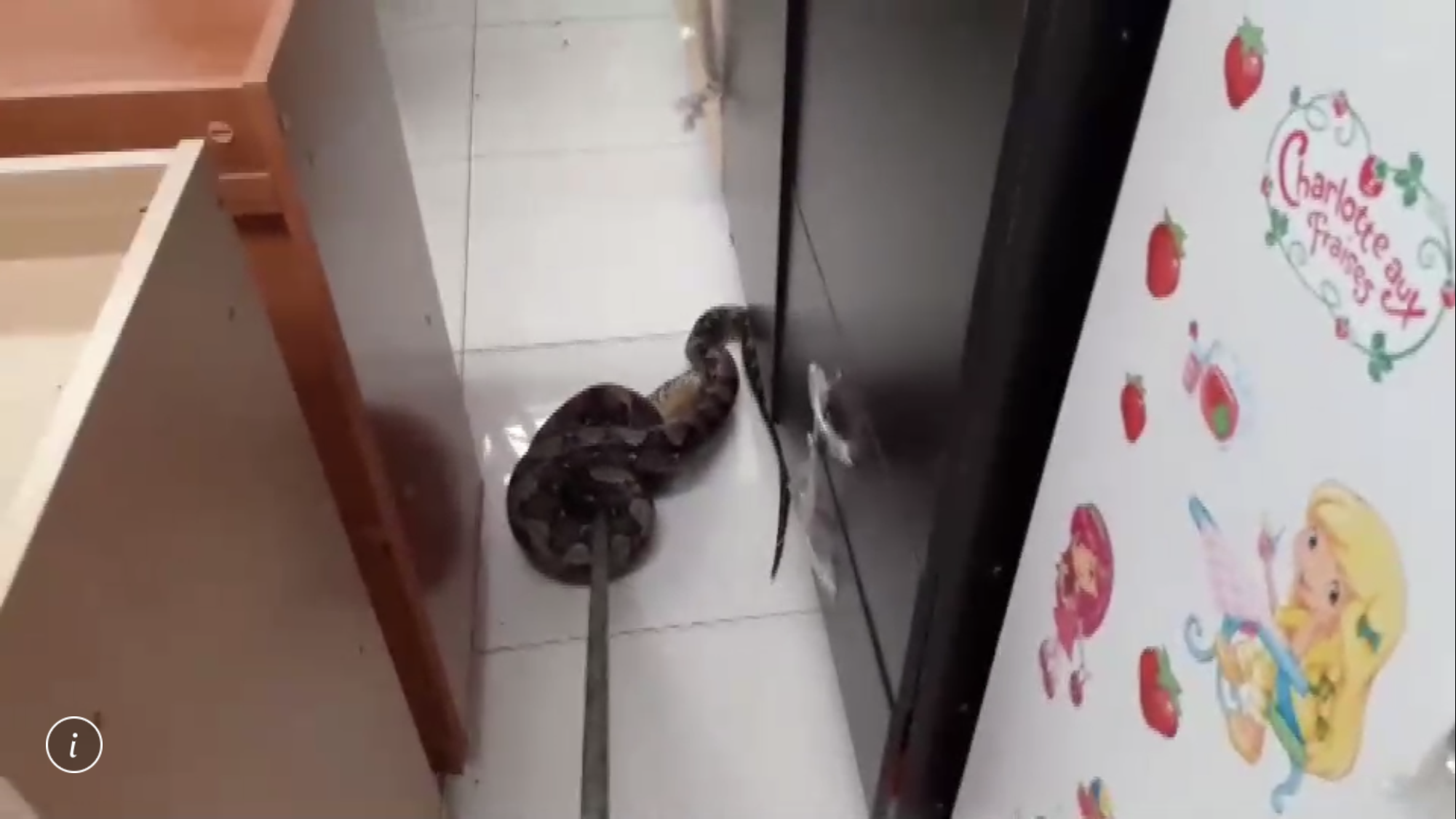 พบเจ้าของร้านและพนักงานของร้านทั้งชายหญิงจำนวนหนึ่งกำลังแหงนหน้าดูเจ้างูเหลือมที่นอนราบกินนกพิราบอยู่บนโครงหลังสูงจากพื้นประมาณ 16 เมตรเจ้าหน้าที่ไม่รอช้ารีบใช้บันไดต่อตัวปีนขึ้นไปใช้อุปกรณ์จับแต่เจ้างูเหลือมพยายามต่อสู้ไม่ยอมให้จับได้โดยง่ายใช้เวลาประมาณ 15 นาทีจึงสามารถจับเอาไว้ได้จึงนำตัวลงมาด้านหน้าร้าน