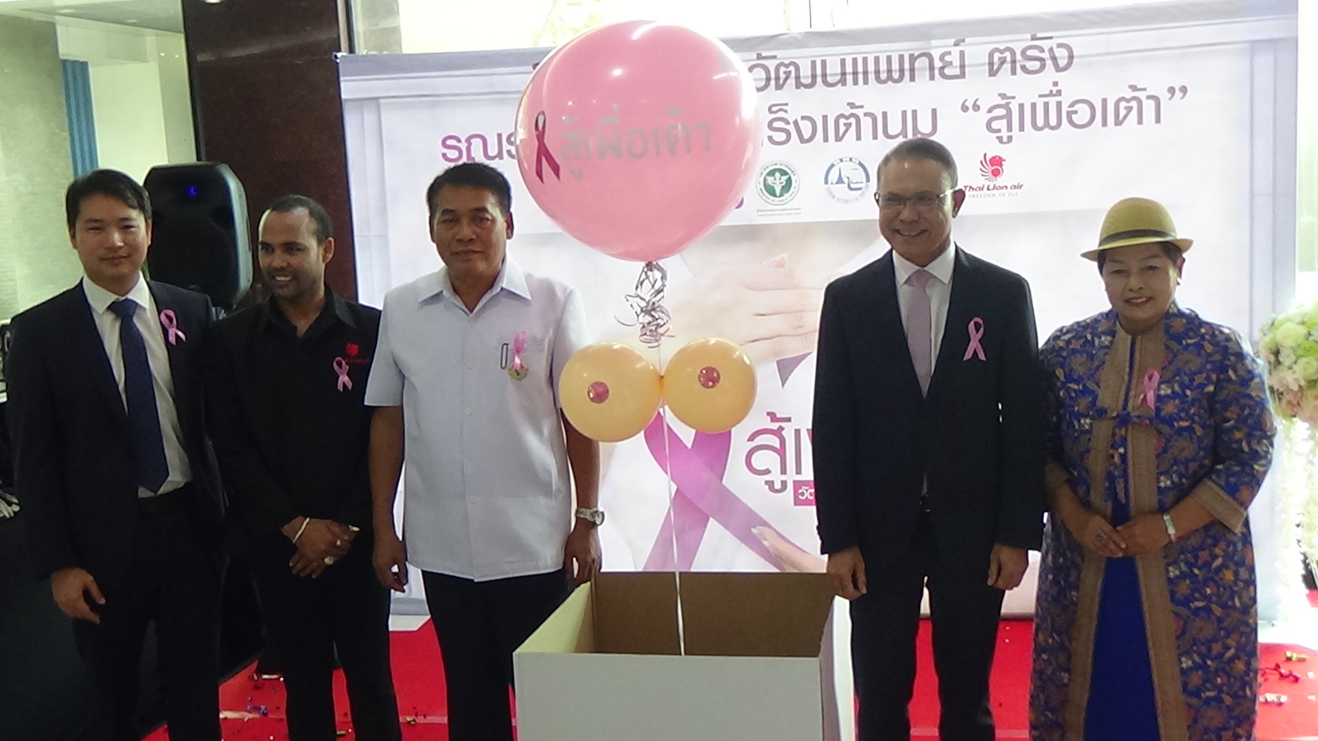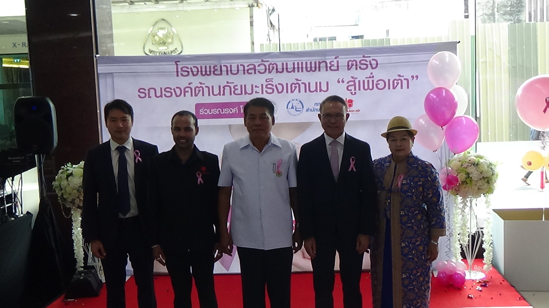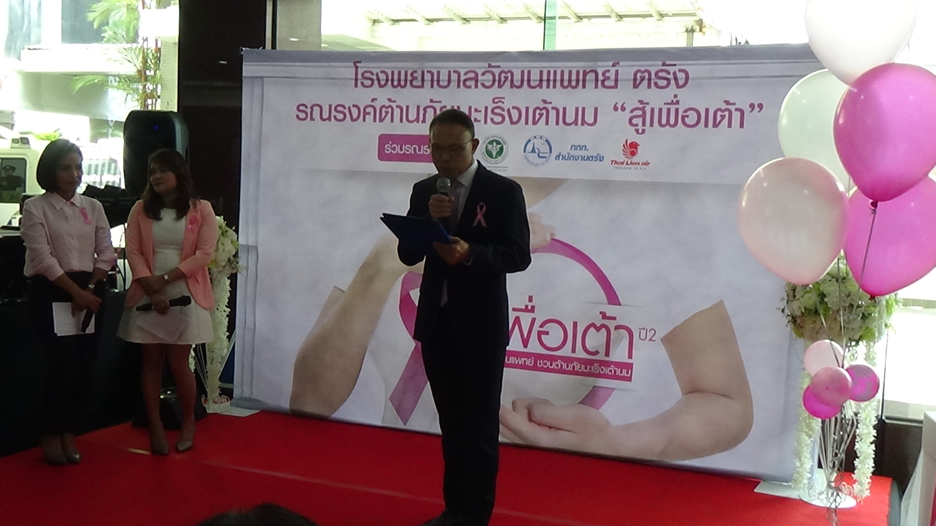 ที่โรงพยาบาลวัฒนแพทย์ ตรัง นายแพทย์บรรเจิด สุขพิพัฒปานนท? นายแพทย์สาธารณสุขจังหวัดตรัง เป็นประธาน แถลงข่าวเปิดโครงการ รณรงค์ต้านภัยมะเร็งเต้านม สู้เพื่อเต้า ทั้งนี้นายแพทย์สมชาย จันทร์สว่าง ประธานเจ้าหน้าที่บริหาร โรงพยาบาลวัฒนแพทย์ ตรัง เปิดเผยว่า ปัจจุบันมะเร็งเต้านมยังคงเป็นโรคมะเร็งที่พบมากเป็นอันดับหนึ่งในผู้หญิง โดยมีอัตราผู้ป่วยรายใหม่ จากโรคมะเร็งเต้านม ประมาณ 30 รายต่อวัน และมีผู้เสียชีวิตโดยเฉลี่ยสูงถึง 10 คนต่อวัน เนื่องจากส่วนใหญ่จะพบผู้ ป่วยเป็นโรคมะเร็งเต้านมระยะที่ 2 ถึงระยะที่ 4 ซึ่งถือเป็นระยะลุกลาม และแพร่กระจายของโรคแล้ว ทั้งนี้ผู้หญิงไทยที่เข้าสู่วัยเจริญพันธุ์ช่วงอายุมีความเสี่ยงที่จะเป็นโรคมะเร็งเต้านมได้ทุกคน แต่จะพบมากในช่วงอายุมากกว่า 40 ปีขึ้นไปขณะที่ผู้ชายก็มีโอกาสเป็นมะเร็งเต้านมได้ แต่พบน้อยกว่าผู้หญิงและส่วนใหญ่จะพบในผู้ชายสูงอายุจากแนวโน้มการเพิ่มขึ้นของผู้ป่วยมะเร็งเต้านมในประเทศไทยทำให้โรงพยาบาลวัฒนแพทย์ เล็งเห็นถึงความสำคัญ ในการส่งเสริมสุขภาพของผู้หญิงในพื้นที่จังหวัดตรังและจังหวัดใกล้เคียง ให้ห่างไกลจากโรคมะเร็งเต้านม