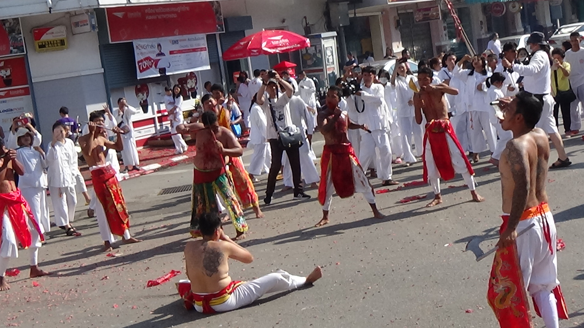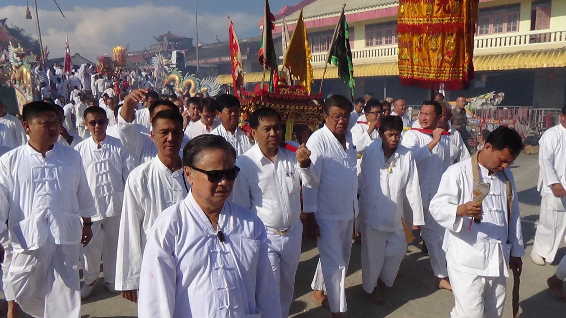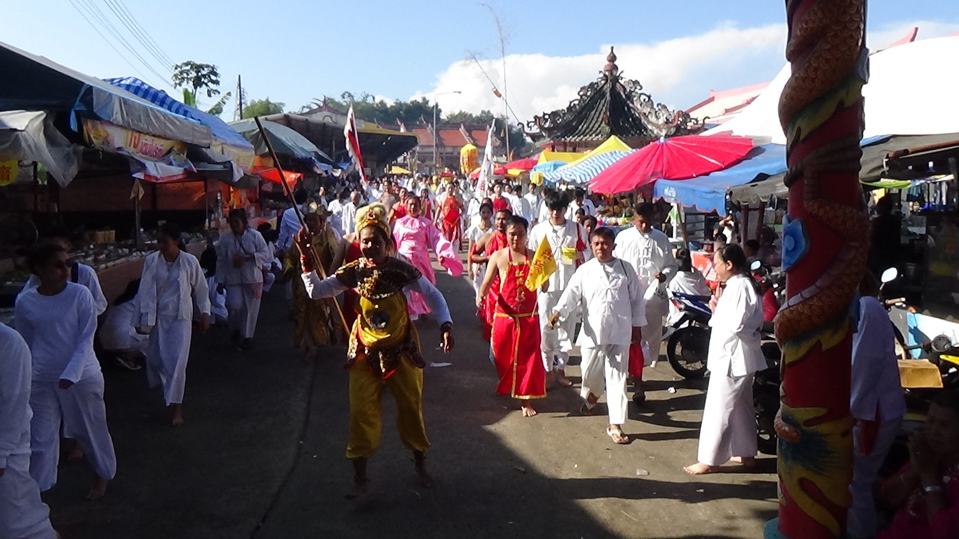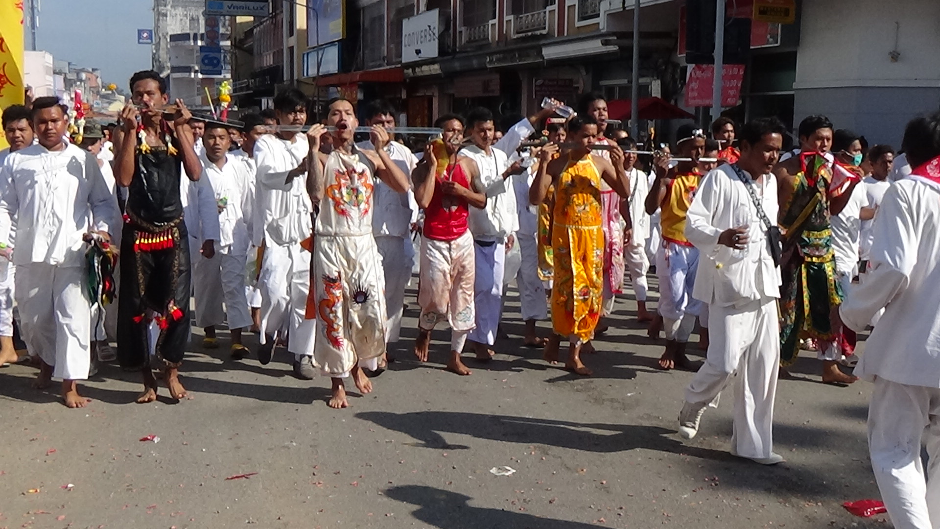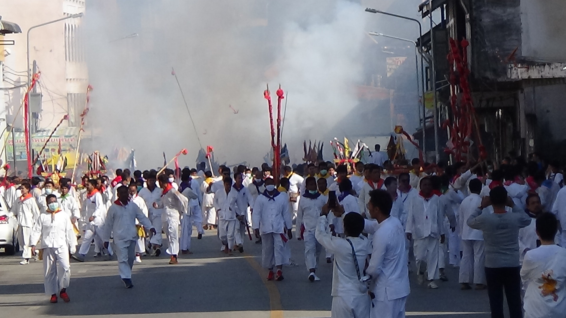 ศาลเจ้ากิวอ่องเอี๋ย ทำพิธีจุดประทัดสายแรก เพื่ออัญเชิญองค์กิงอ๋องไต่เต่ และองค์เทพเจ้าออกโปรดสาธุชนที่ร่วมประเพณีถือศีลกินเจ ในขณะที่ร่างทรงได้แสดงอภินิหาร ใช้เหล็กแหลมทิ่มแทงตามร่างกาย สร้างความตื่นตาตื่นใจและความหวาดเสียวให้กับประชาชนและนักท่องเที่ยวที่เข้าร่วมพิธีจำนวนมาก