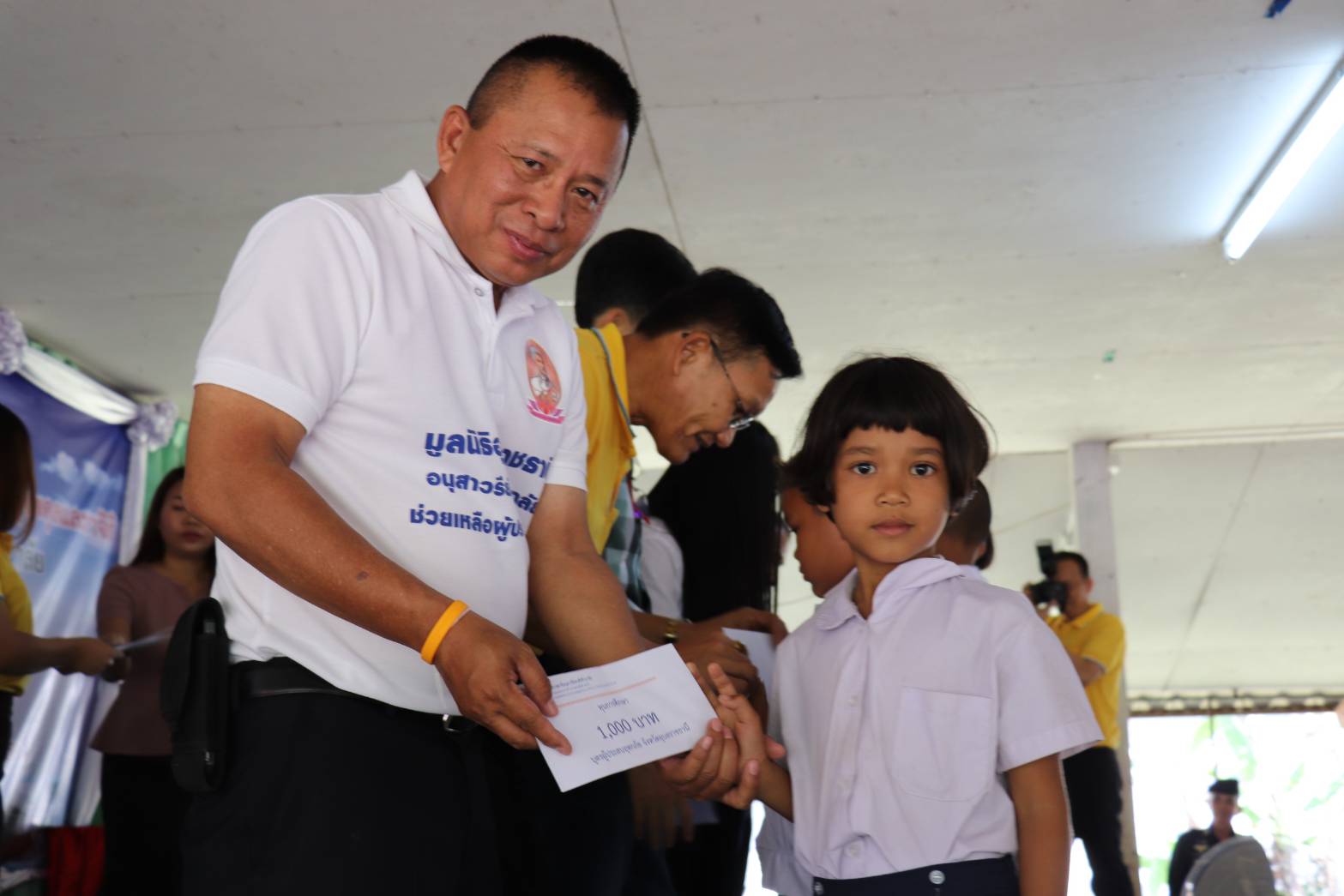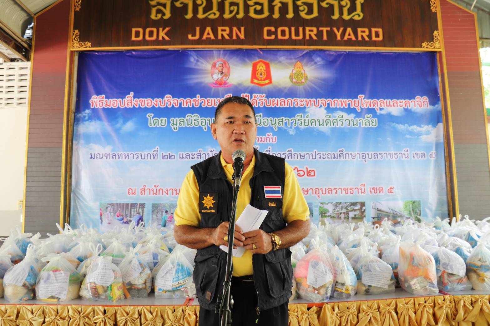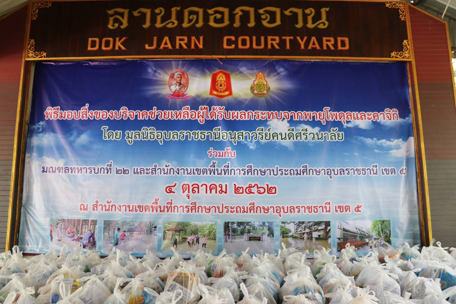 ตามที่จังหวัดอุบลราชธานี ประสบภัยจากพายุโซนร้อนโพดุล และพายุคาจิกิ ทำให้ฝนตกต่อเนื่องและเกิดน้ำท่วมในจังหวัดอุบลราชธานีในหลายพื้นที่ ทางมูลนิธิฯได้ร่วมกับ มณฑลทหารบกที่ 22 และภาคเอกชน เปิดศูนย์ช่วยเหลือผู้ประสบภัยจังหวัดอุบลราชธานี ที่บริเวณข้างศาลหลักเมือง อุบลราชธานี มีผู้นำสิ่งของ และเงินมาบริจาคช่วยเหลือผู้ประสบภัย บัดนี้สถานการณ์เริ่มคลี่คลาย จึงได้นำเงินและสิ่งของที่ได้รับจากการบริจาคมามอบเป็นทุนการศึกษา ทุนละ 1,000 บาท และมอบถุงยังชีพให้ผู้ประสบภัยจำนวนหนึ่ง เป็นเป็นการเยี่ยวยาจิตใจให้กับผู้ประสบภัย โดยวันนี้ทำพิธีมอบที่สำนักงานเขตพื้นที่การศึกษาประถมศึกษาอุบลราชธานี เขต 5 จำนวน 87 ทุน และที่โรงเรียนบ้านตบหู จำนวน 63 ทุน รวม 150 ทุนเป็นเงิน 150,000 บาท และจะมอบต่อไปในทุกเขตพื้นที่การศึกษาของ จ.อุบลราชธานี จนครบ 1 ล้านบาท