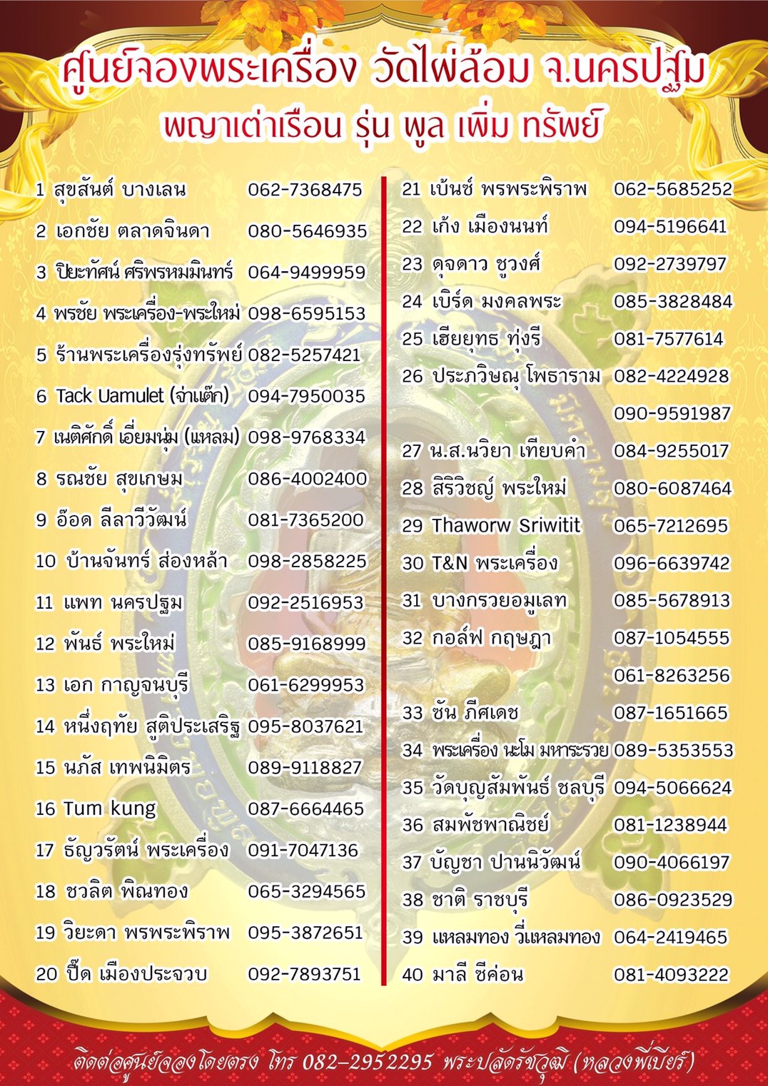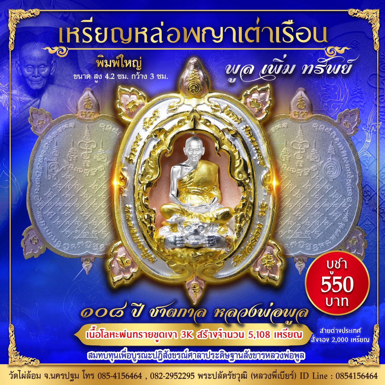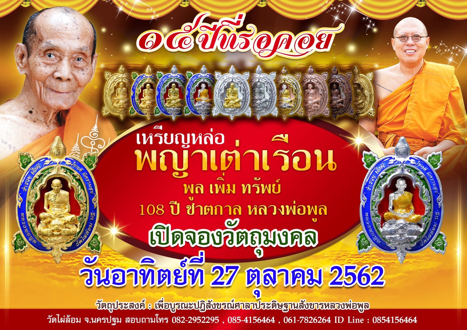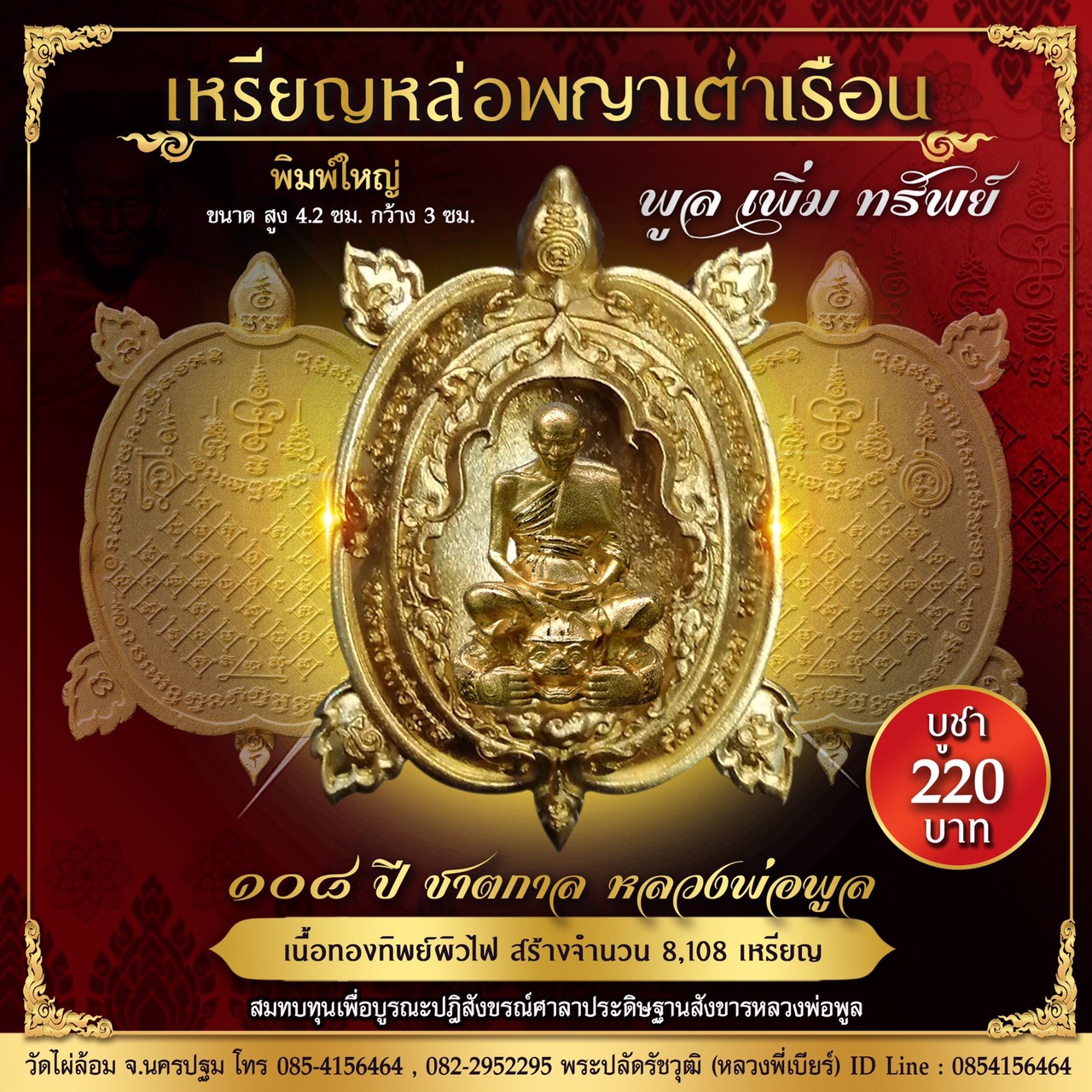 พระครูปลัดสิทธิวัฒน์ หลวงพี่น้ำฝน เจ้าอาวาสวัดไผ่ล้อม อำเภอเมือง จังหวัดนครปฐม ได้กล่าว่า 15 ปี…ที่ญาติโยม รอคอย เหรียญหล่อพญาเต่าเรือน “พูล เพิ่ม ทรัพย์” 108 ปี ชาตกาล “หลวงพ่อพูล” เป็นจริงแล้ว เปิดให้จองวัตถุมงคล เหรียญหล่อพญาเต่าเรือน “พูล เพิ่ม ทรัพย์” ในเวลา 9.00 น.วันอาทิตย์ ที่ 27 ตุลาคม 2562ที่จะถึงนี้ คาดว่าประชาชนคงล้นหลามมาแย่งกันจอง เหรียญหล่อพญาเต่าเรือน “พูล เพิ่ม ทรัพย์” กันเป็นแน่เพราะกระแสตอบรับ มีมากเหลือเกิน ติดต่อกันมาทั้งญาติโยมคนไทย และชาวต่างชาติ โดยจะมีศูนย์รับจอง พระเครื่อง วัดไผ่ล้อม จังหวัดนครปฐม รุ่น พญาเต่าเรือน “พูล เพิ่ม ทรัพย์” 108 ปี ชาตกาล “หลวงพ่อพูล” ทั้งหมดมีเพียง 40 ศูนย์ ทั่วประเทศเท่านั้น