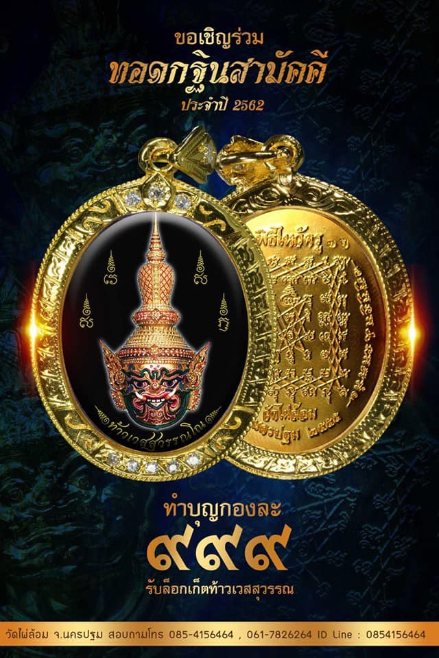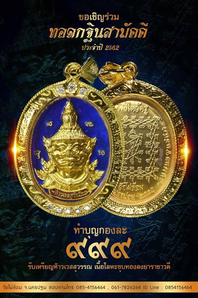 ร่วมทำบุญผ้าป่ากองละ 999 บาทในวันอาทิตย์ที่ 27 ตุลาคม 2562 เวลา 15.00 น. รับเหรียญท้าวเวสสุวรรณ เนื้อโลหะชุบทองลงยาราชาวดี หรือ โอนผ่านธนาคาร รับล็อกเก็ตท้าวเวสสุวรรณทันที