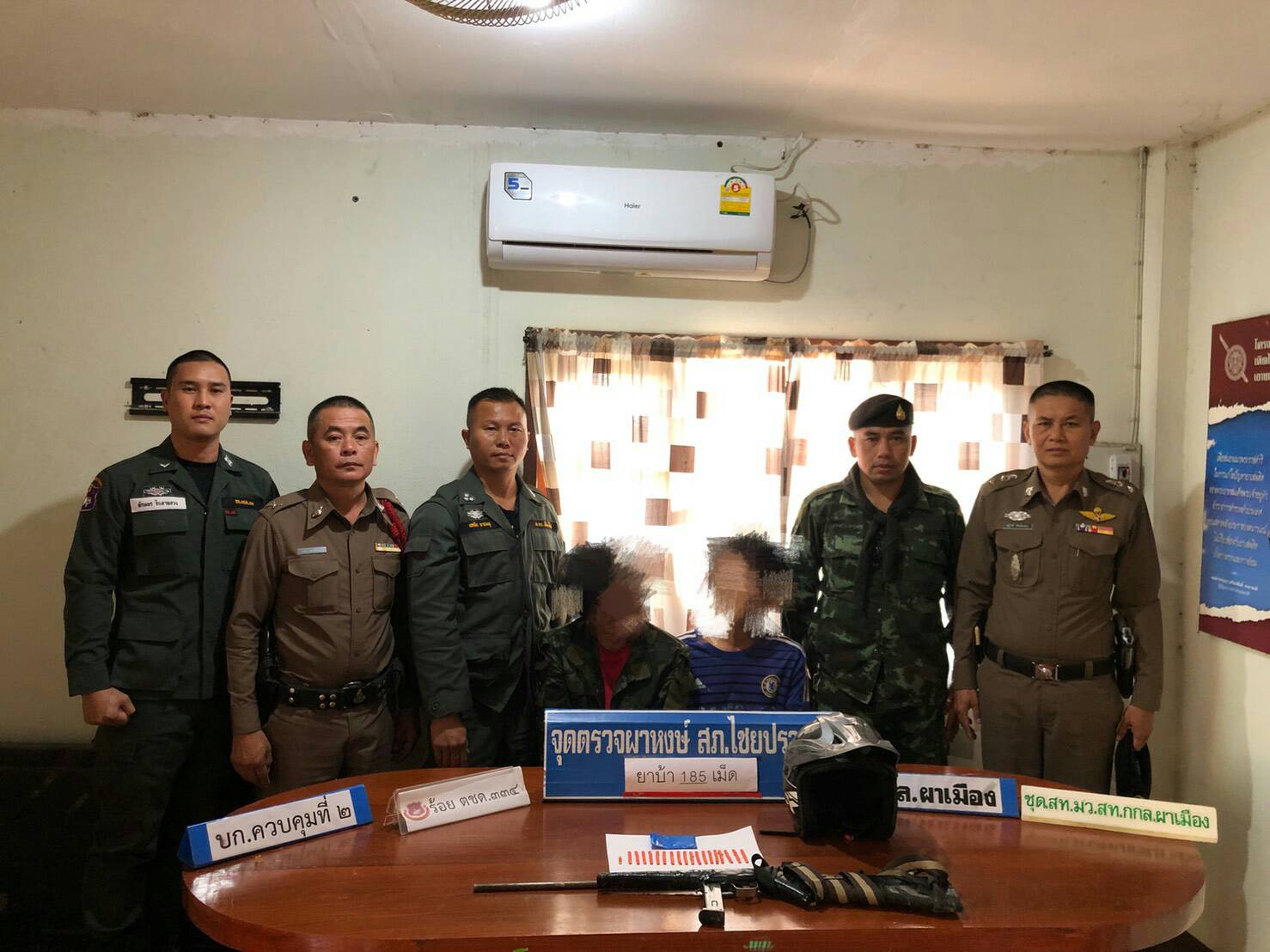 เจ้าหน้าที่ตำรวจจึงเข้าทำการควบคุมตัวทั้งสองคนไว้ ตรวจสอบ ทราบชื่อคนขับต่อมาคือ นายสุพรรณ ไอ้แสง อายุ 33 ปี บ้านเลขที่ 235/8 ต.ชะมาย อ.ทุ่งสง จ.นครศรีธรรมราช และมี นายชัยวัฒน์ แซ่หล่อ อายุ 24 ปี บ้านเลขที่ 100(83)/พ ต.หนองบัว อ.ไชยปราการ จ.เชียงใหม่อยู่หมู่บ้านเดียวกันเป็นผู้ซ้อนท้าย จึงได้ขอทำการตรวจค้น ตามรถและค้นตามร่างกายของบุคคลทั้งสอง พบยาบ้าบรรจุรวมกันในถุงพลาสติกสีฟ้าชนิดฝามีลิ้น เปิด – ปิด จำนวน 1 ถุง มียาบ้าสีส้มจำนวน 183 เม็ด สีเขียวจำนวน 2 เม็ด เมื่อแกะดูนับรวมกันได้จำนวน 185 เม็ดบรรจุซุกซ่อนอยู่ในหมวกกันน๊อคสีดำ พร้อมกับอาวุธปืนยาวไทยประดิษฐ์ขนาด .22 มม. ไม่มีหมายเลขทะเบียนจำนวน 1 กระบอก และได้จับกุมควบคุมตัวนายสุพรรณ ไอ้แสง และนายชัยวัฒน์ แซ่หล่อ พร้อมด้วยของ ส่งพนักงานสอบสวนสถานีตำรวจภูธรไชยปราการ จังหวัดเชียงใหม่เพื่อดำเนินการตามกฏหมายต่อไป