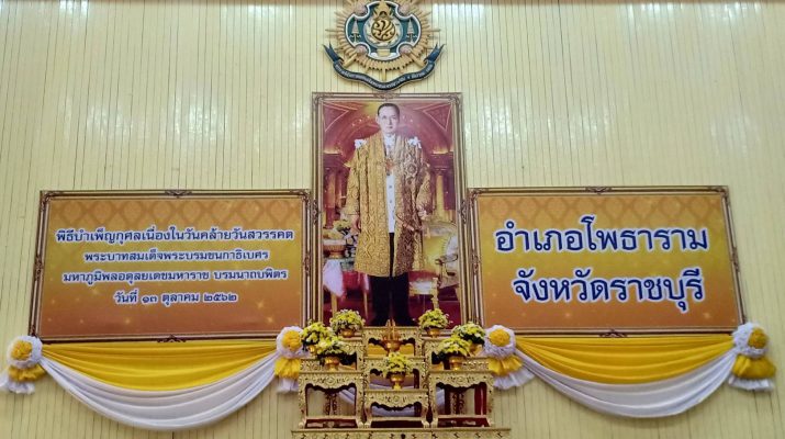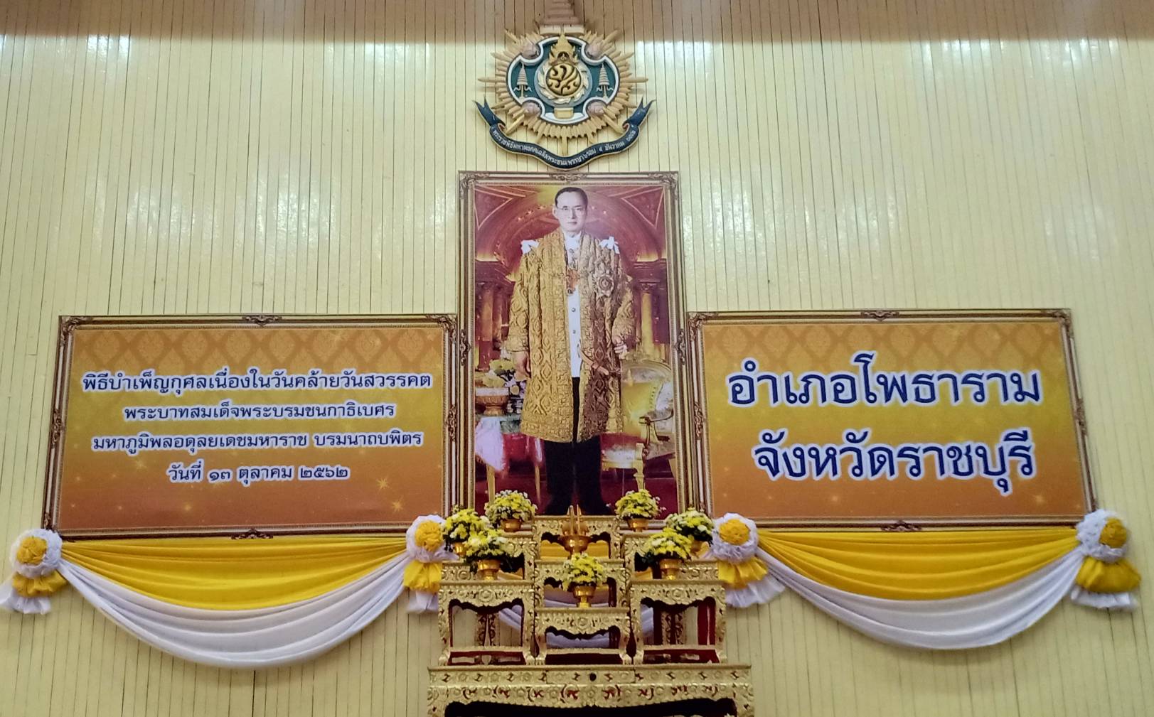 ต่อมาเวลา 08.00 น. ในวันนี้ ณ.หอประชุมเทศบาลเมืองโพธารามจังหวัด ราชบุรี นายนพรัตน์ รัตนพานิช นายอำเภอโพธาราม ได้เดินทางมาเป็น ประธานวางพวงมาลาและถวายบังคม เบื้องหน้าพระบรมฉายาลักษณ์ พระบาทสมเด็จพระ บรมชนกาธิเบศร มหาภูมิพลอดุลยเดชมหาราช บรมนาถบพิตร เนื่องในวันคล้ายวันสวรรคต13 ต.ค. 62เพื่อแสดงความจงรักภักดีและรำลึกในพระมหากรุณาธิคุณ โดยมีหัวหน้าส่วนราชการ ทหาร ตำรวจ หน่วยงานรัฐวิสาหกิจ องค์กรปกครองส่วนท้องถิ่น องค์กรเอกชน และภาคประชาชนในเขต. อำเภอโพธาราม เข้าร่วมพิธี.