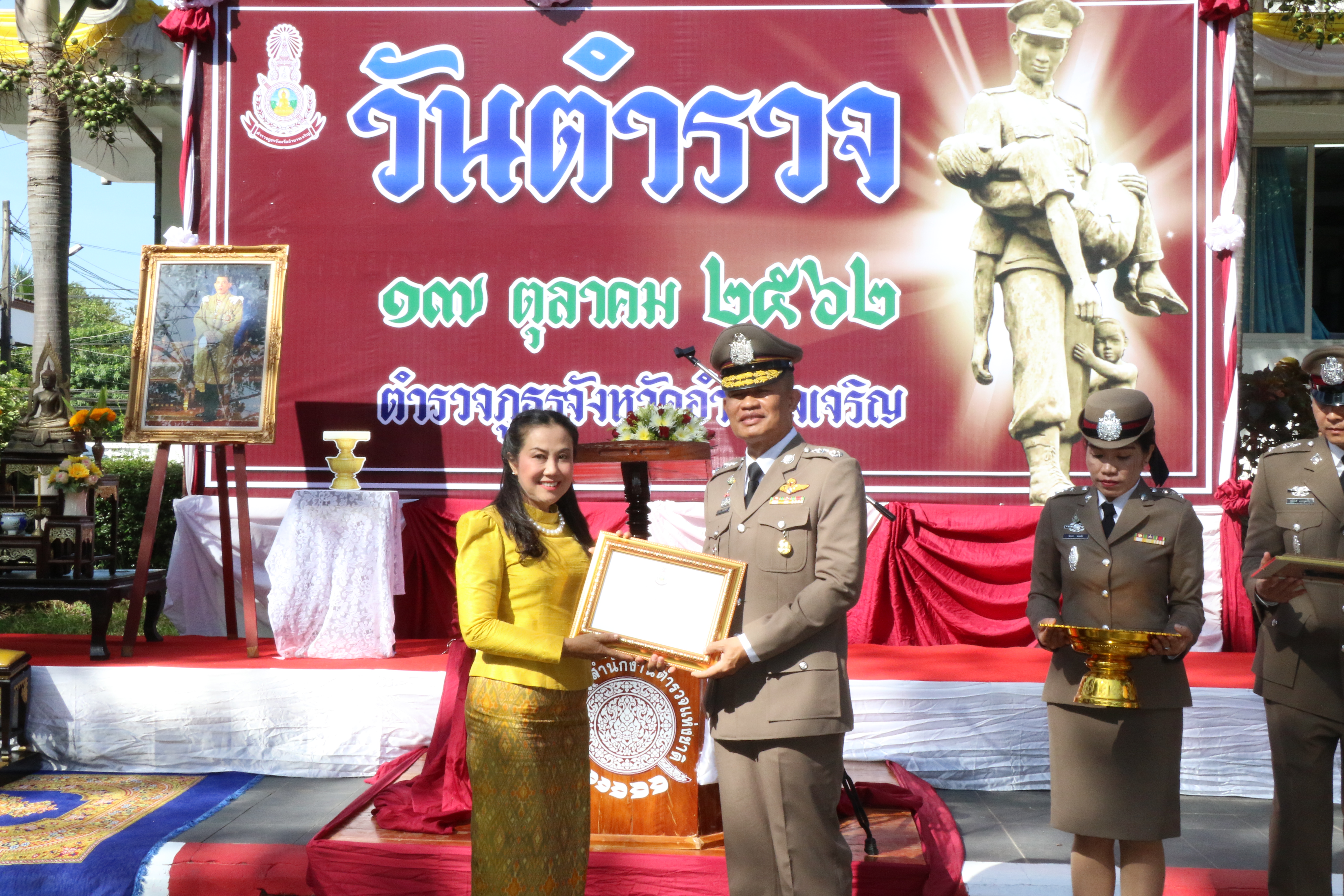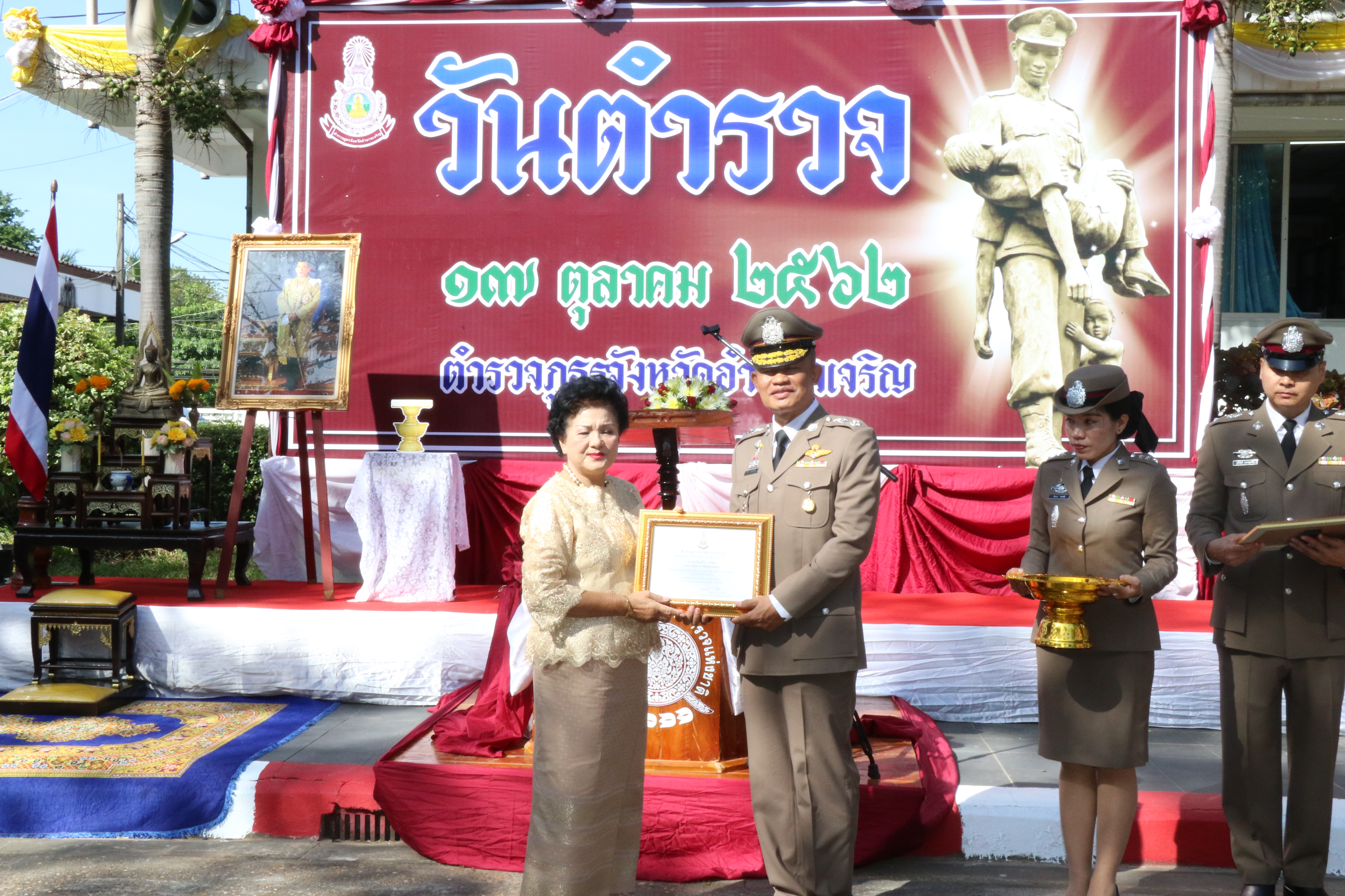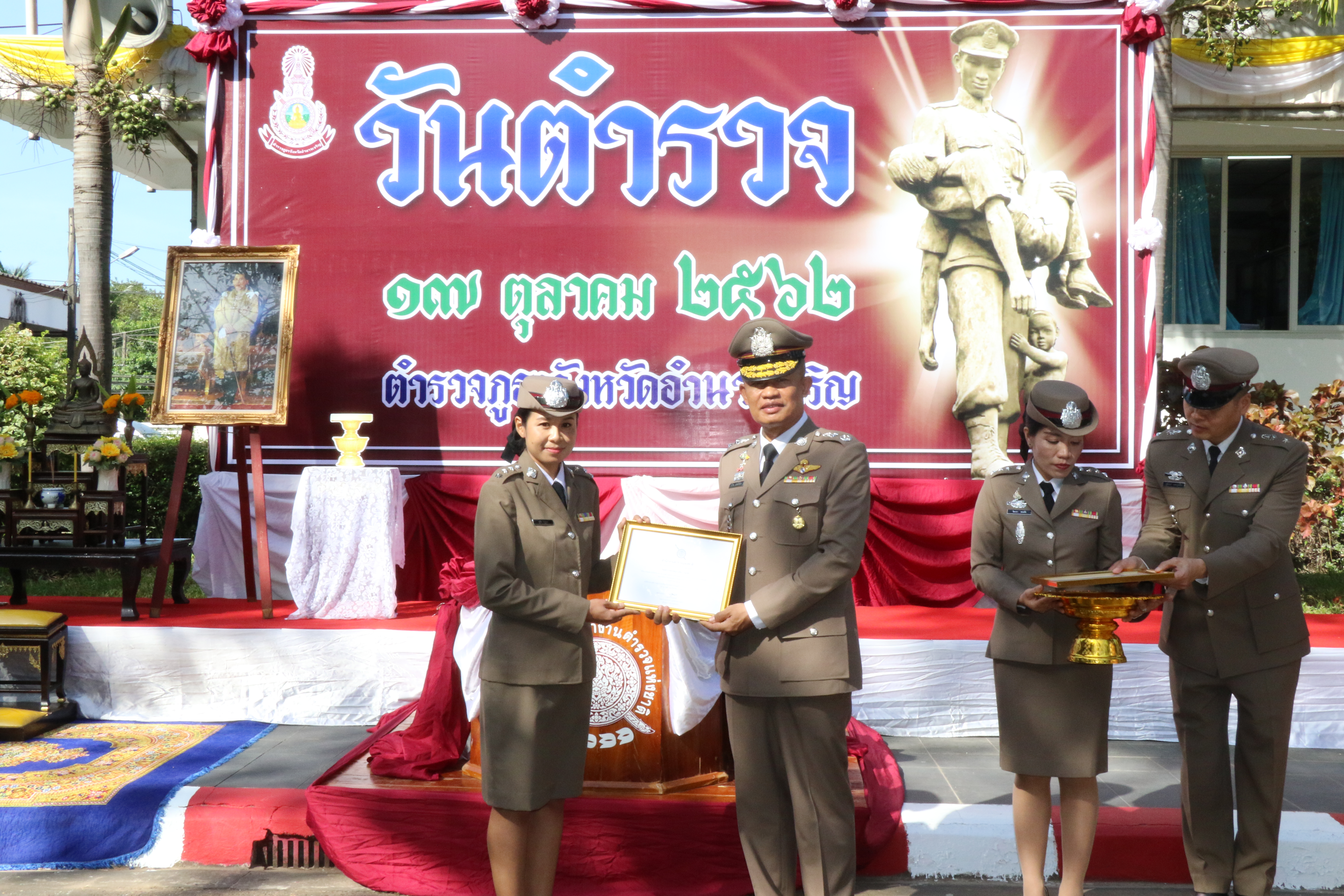 ได้มอบใบประกาศเกียรติคุณให้แก่ข้าราชการตำรวจที่มีผลการปฏิบัติงานดีเด่น จากสำนักงานตำรวจภูธรภาค 3 ในด้านประพฤติดีเยี่ยมตามประมวลจริยธรรมและจรรยาบรรณของตำรวจ ใบประกาศเกียรติคุณฝ่ายอำนวยการดีเด่น ใบประกาศเกียรติคุณด้านการป้องกันปราบปรามยาเสพติดดีเด่น และโล่ประกาศเกียรติคุณให้กับผู้ให้การสนับสนุนช่วยเหลือกิจกรรมของตำรวจภูธรจังหวัดอำนาจเจริญ จากนั้นได้กล่าวให้โอวาทแก่ข้าราชการตำรวจ เนื่องในโอกาสวันตำรวจ ประจำปี 2562 โดยขอให้ข้าราชการตำรวจทุกนาย ช่วยกันดูแลความปลอดภัืืืยให้กับประชาชน และขอให้รักษาคุณงามความดีที่มีอยู่ให้คงอยู่ตลอดไป เพื่อความสงบเรียบร้อยของบ้านเมืองสมดั่งฉายาผู้พิทักษ์สันติราษฎร์