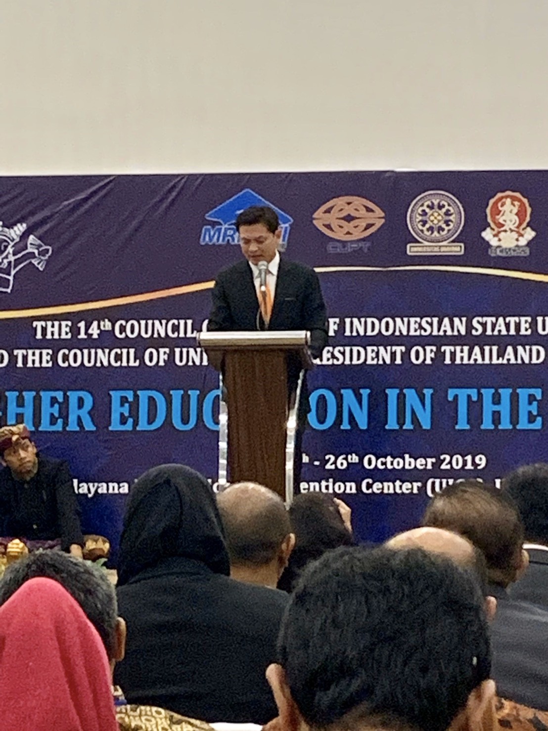 ร่วมพิธีเปิดการประชุมความร่วมมือไทย-อินโดนีเซียครั้งที่ 14 (14th CRISU-CUPT conference) ระหว่างวันที่ 24-28 ตุลาคม 2562 โดยมี ศ.ดร.สุชัชวีร์ สุวรรณสวัสดิ์ ประธานที่ประชุมอธิการบดีแห่งประเทศไทย เป็นตัวแทนประเทศไทย ในการสัมมนาประชุมวิชาการ ณ Udayana International Convention Center (UICC) Kampus Jimbaran, bali,Indonesia