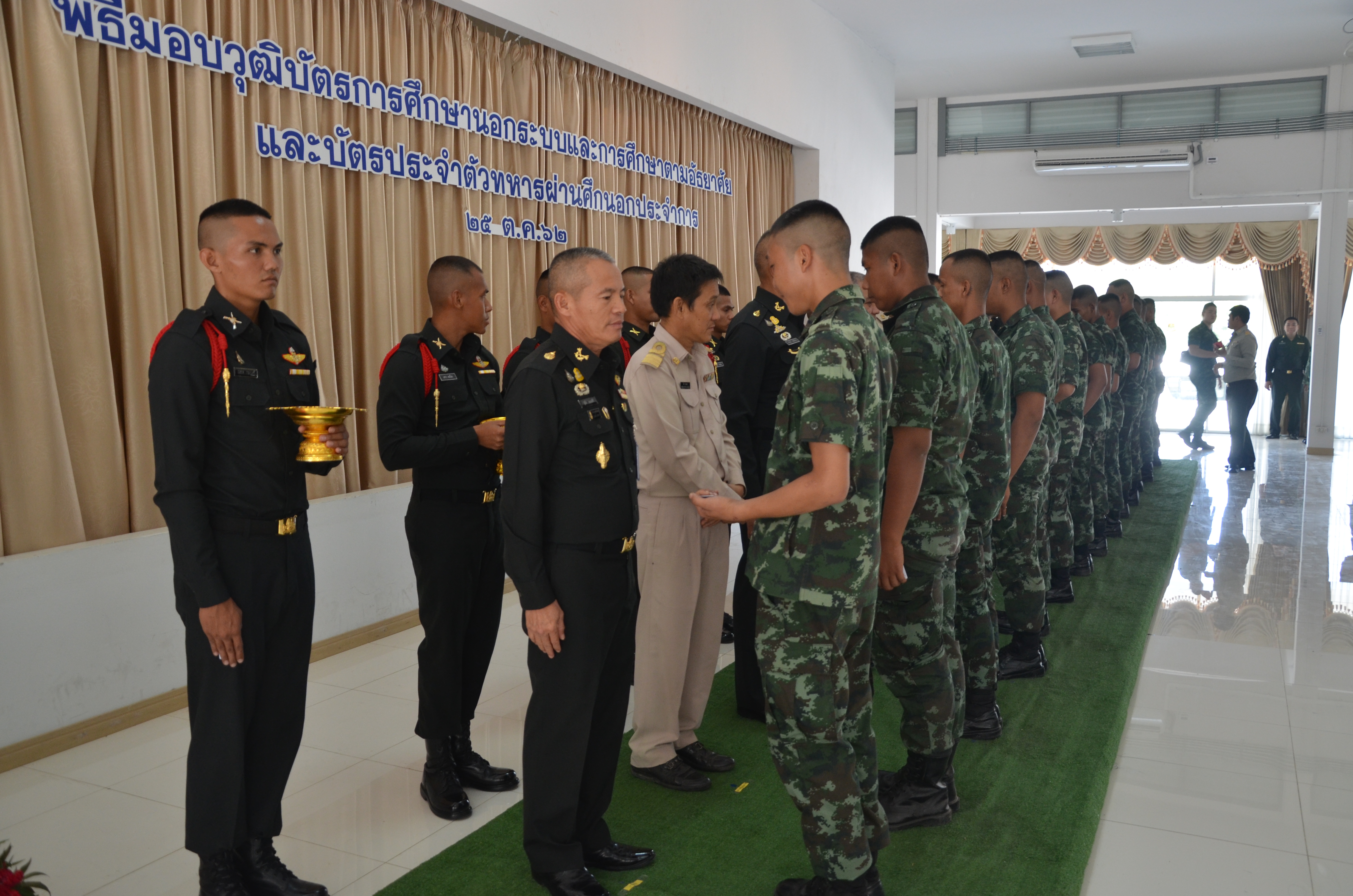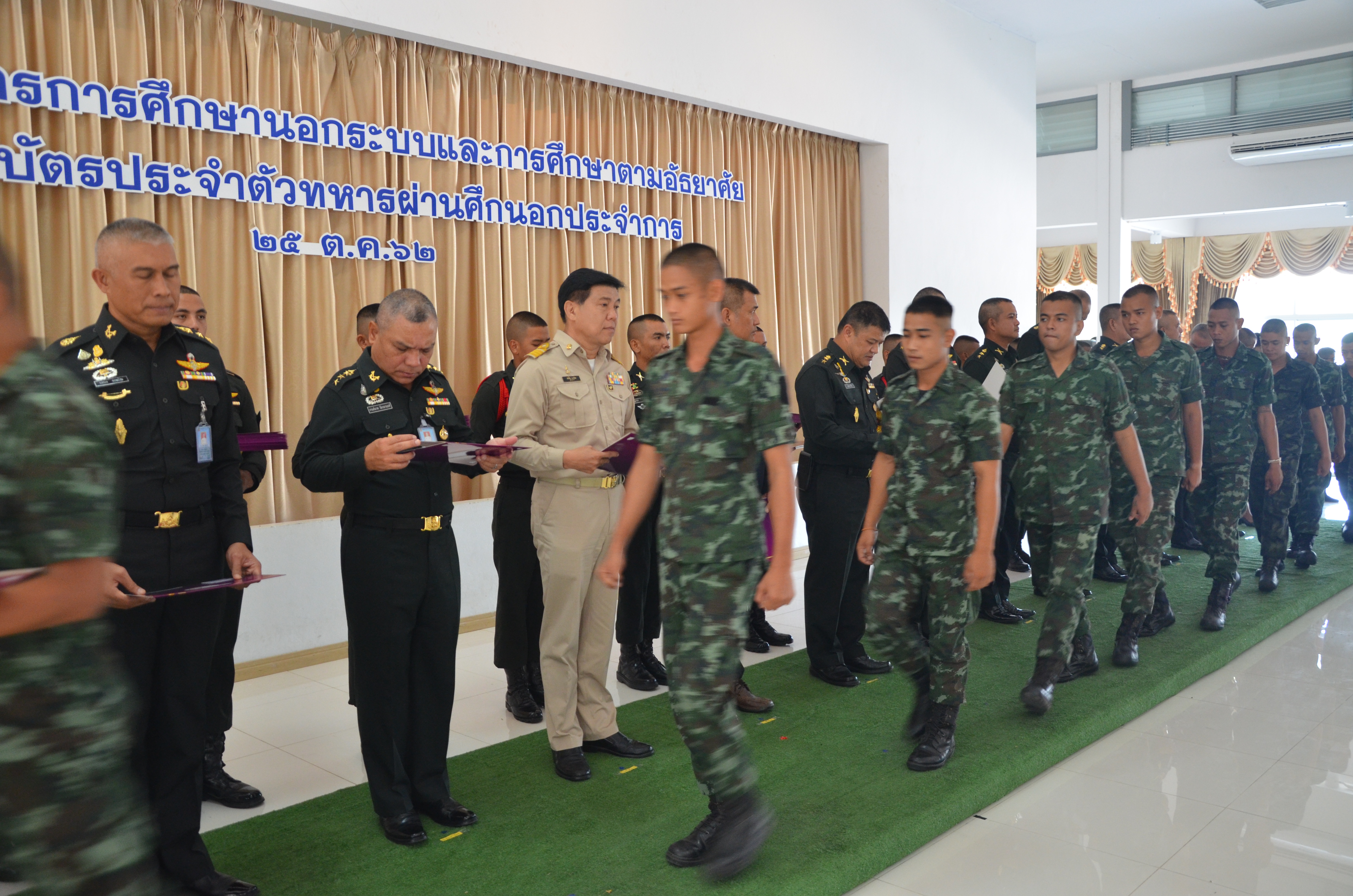 ในการนี้ได้รับความร่วมมือเป็นอย่างดี/จากศูนย์การศึกษานอกระบบ/ แลการศึกษาตามอัธยาศัยอำเภอเมืองกาญจนบุรี และศูนย์การศึกษานอกระบบและการศึกษาตามอัธยาศัยเขตดุสิต/ โดยทหารกองประจำการ (ผลัดที่ 2 รุ่นปีพุทธศักราช 2560) ที่ครบกำหนดปลดประจำการในวันที่ 1 พฤศจิกายน 2562 มียอดสำเร็จการศึกษา จำนวน 686 นายสำนักงานองค์การทหารผ่านศึกเขตสุพรรณบุรี ได้จัดทำบัตรประจำตัวทหารผ่านศึกนอกประจำการมอบให้กับทหารกองประจำการ ที่ผ่านการปฏิบัติงานราชการสนาม เพื่อเป็นขวัญละกำลังใจและก่อให้เกิดสิทฺธิ แก่กำลังพลภายหลังปลดประจำการ