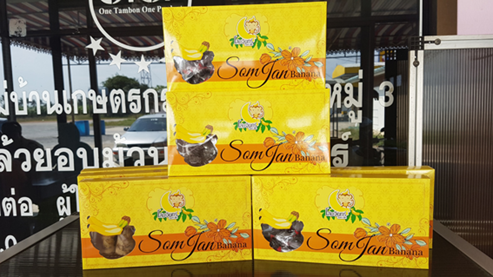 ไปกันที่กลุ่มวิสาหกิจชุมชนโสมจันทร์ ต.สระยายโสม อ.อู่ทอง จ.สุพรรณบุรี แหล่งผลิตแปรรูปกล้วยอบม้วน กล้วยกวน กล้วยแก้วรสมะขาม กล้วยแก้วรสมะม่วง กล้วยแก้วรสมะยม กล้วยแก้วรสสับปะรด กล้วยแก้วรสคลุกบ๊วย ของฝากขึ้นชื่อสินค้าโอทอประดับ 5 ดาว ของจังหวัดสุพรรณบุรี ส่งขายทั้งในประเทศและส่งออกอีกหลายประเทศ โดยผู้ใหญ่สุภัสศรณ์ พงษ์พานิช ประธานกลุ่มวิสาหกิจชุมชนโสมจันทร์ เล่าให้ฟังว่ากลุ่มแม่บ้านเกษตรกรโสมจันทร์ เกิดจากการรวมกลุ่มของสตรีแม่บ้านในชุมชน ที่ว่างจากการทำไร่ ทำนา แล้วมารวมกลุ่มกันทำผลิตภัณฑ์แปรรูปกล้วยอบม้วน กล้วยกวน โดยนำวัตถุดิบที่มีอยู่ในท้องถิ่น คือ กล้วยน้ำว้า “พันธุ์สุพรรณบุรีกาบขาว” นำมาแปรรูป ซึ่งเป็นการถนอมอาหารแบบไทยๆ โดยนำเทคโนโลยีเครื่องมืออุปกรณ์ที่ทันสมัยเข้ามาทดแทน เพื่อผลิตให้ทันต่อความต้องการของตลาด โดยคัดสรรวัตถุดิบชั้นดี ทำให้ทุกผลิตภัณฑ์มีรสชาติหอม อร่อย สะอาด ปราศจากการแต่งสี แต่งกลิ่นและวัตถุกันเสีย