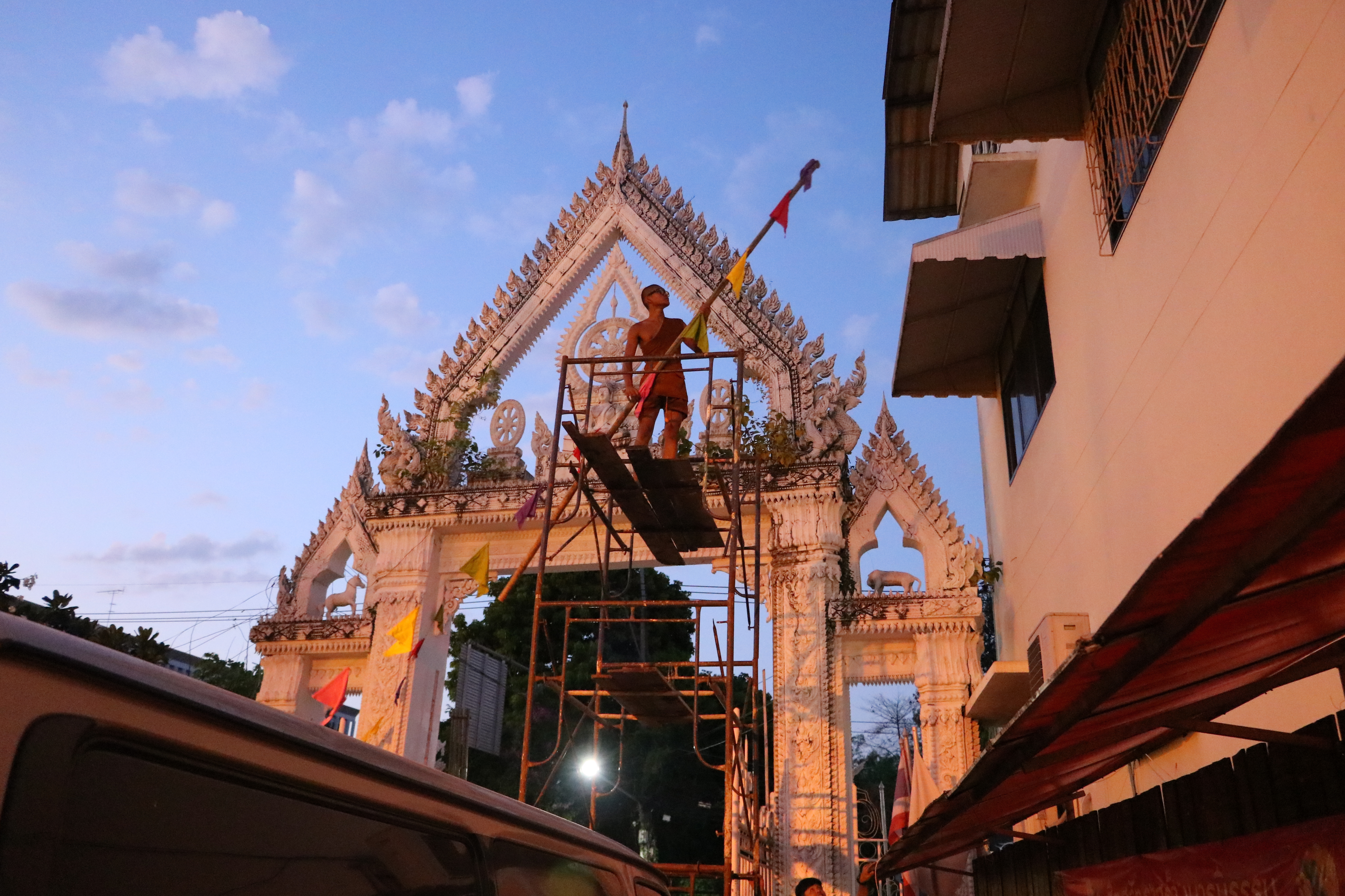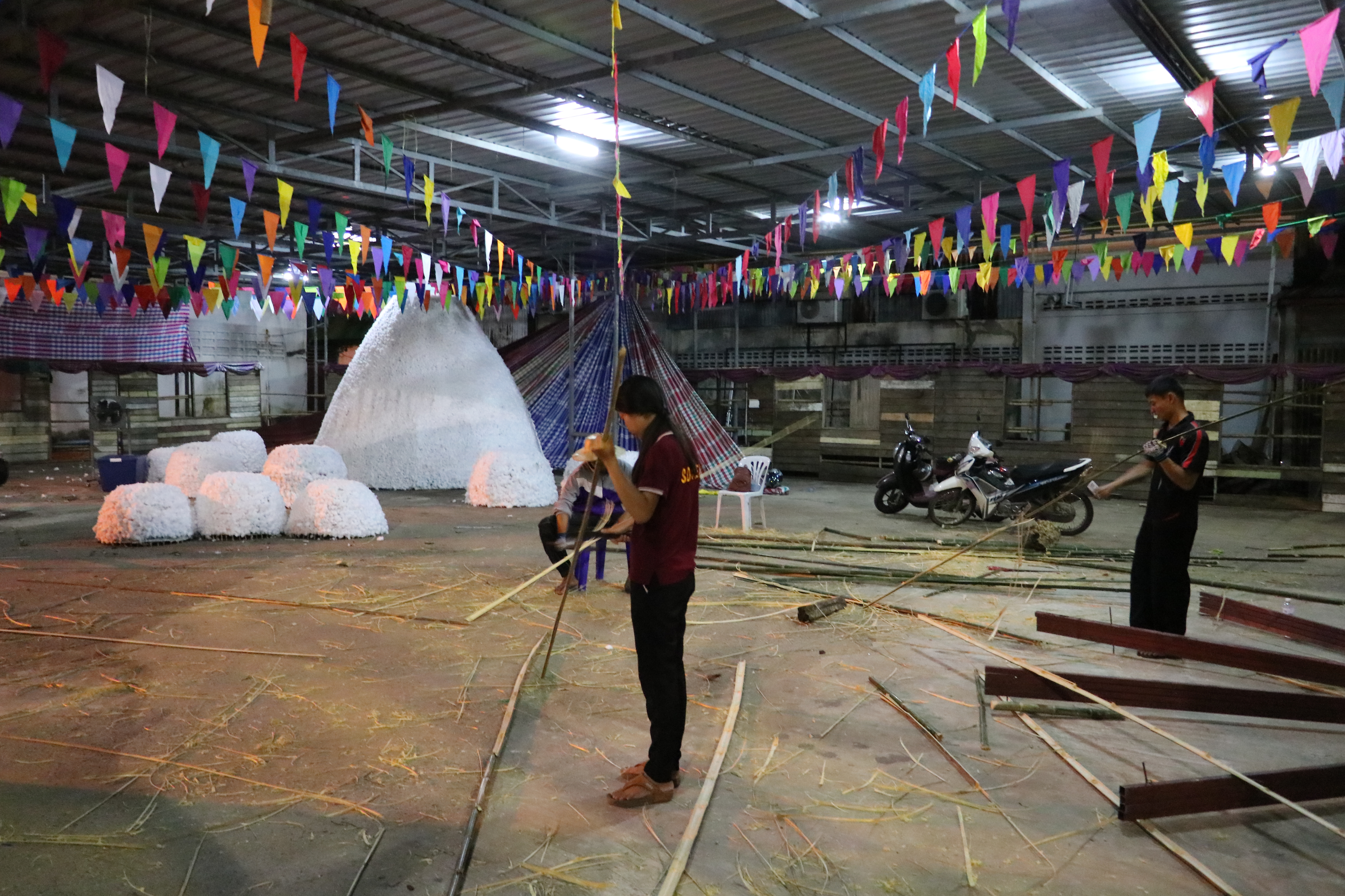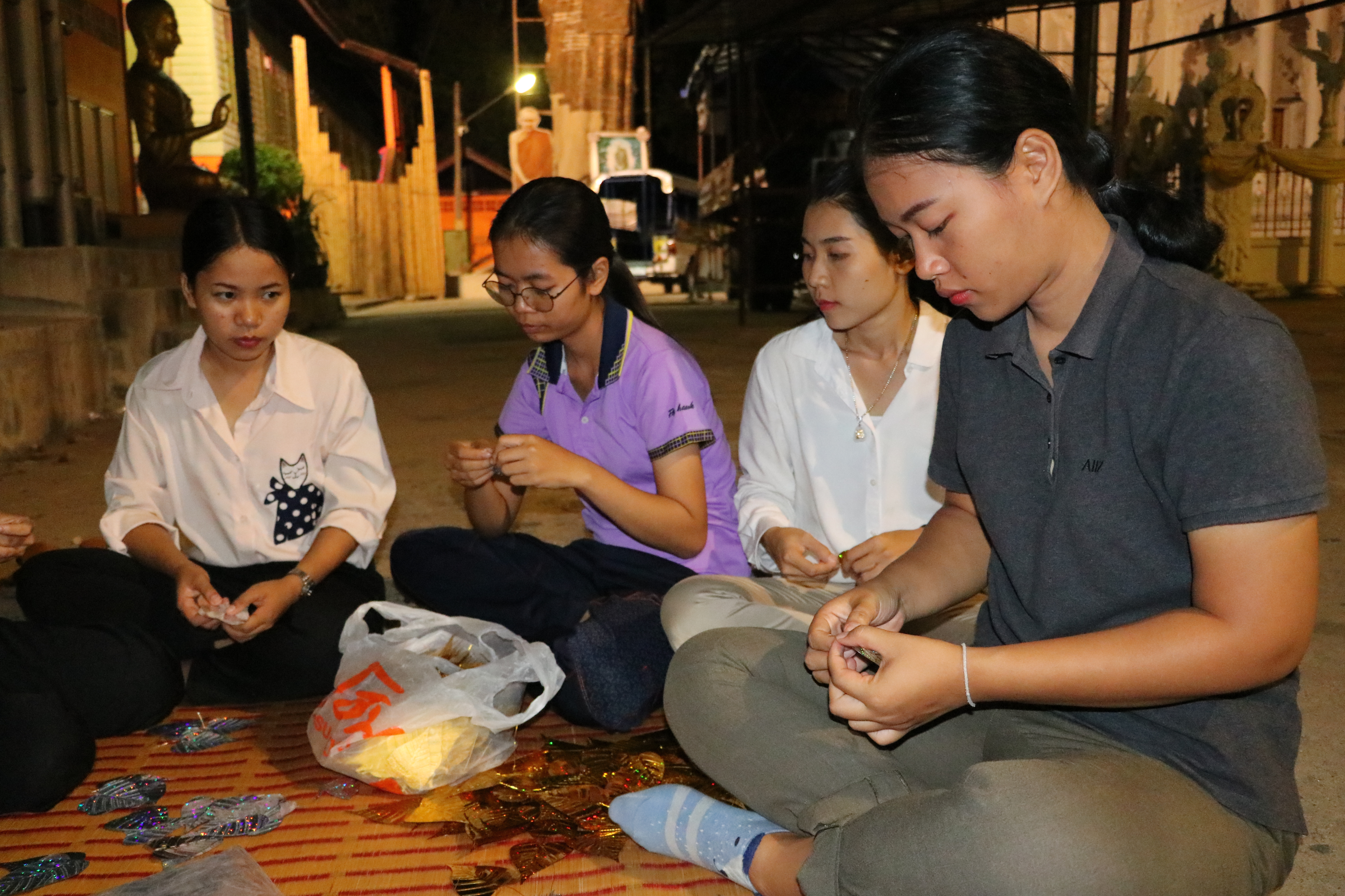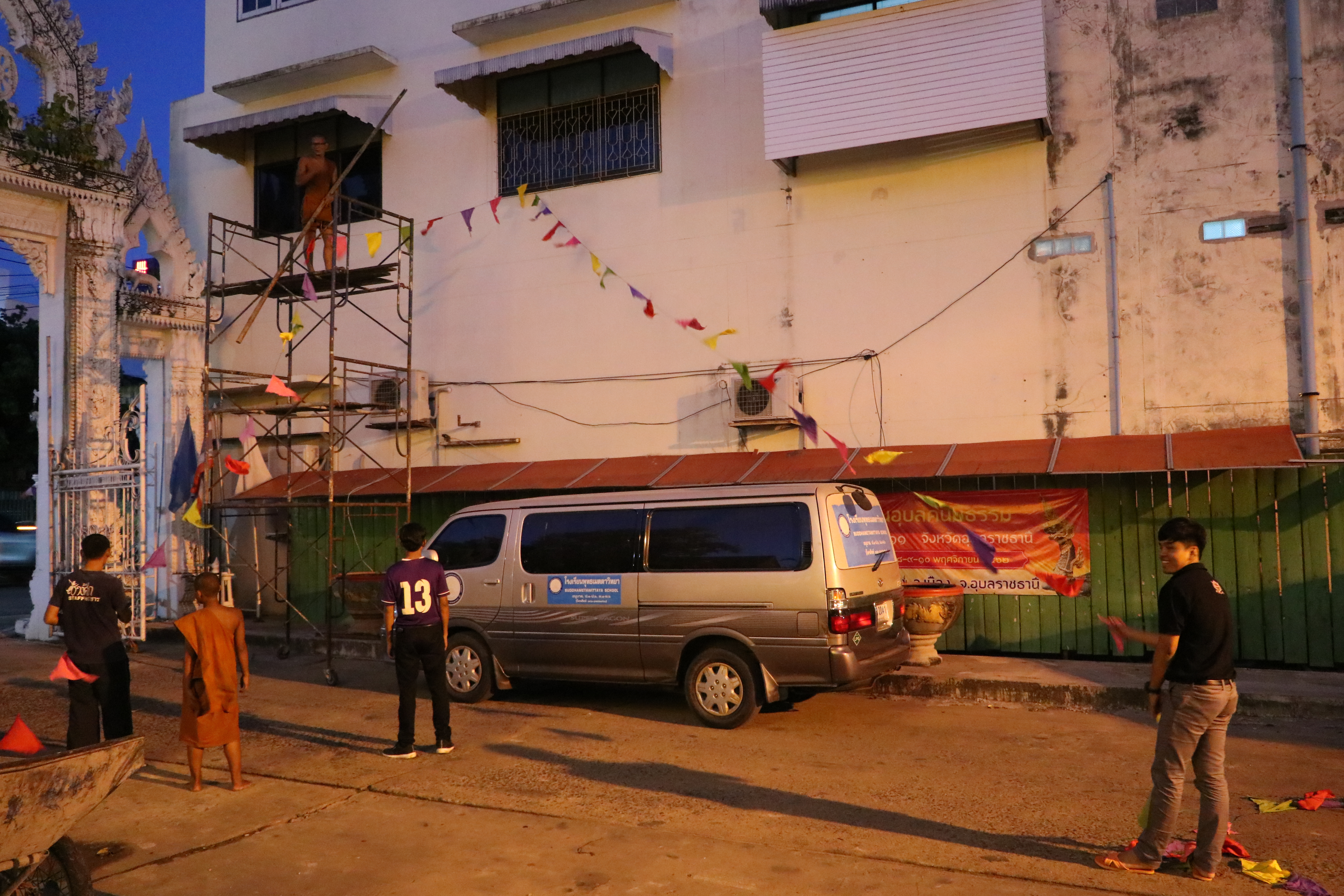 ที่ วัดไชยมงคล ต.ในเมือง อ.เมือง จ.อุบลราชธานี บรรยากาศยามดึกดื่นค่ำคืน พระครูจิตวิสุทธิญาณคุณ เจ้าอาวาสวัดไชยมงคล พร้อมด้วย คณะครูโรงเรียนพุทธเมตตาวิทยา พระภิกษุ สามเณรได้หลอมรวมใจกัน จัดเตรียม ตกแต่ง ซุ้ม สถานที่ต่างๆ ภายในวัด อย่างตั้งอกตั้งใจ โดยไม่รู้จักเหน็ดเหนื่อย เพื่อเตรียมงานทอฝ้ายเป็นสายบุญ จุลกฐิน ถิ่นอุบลคนมีธรรม ครั้งที่ 11 จังหวัดอุบลราชธานี ที่จะมีขึ้นในช่วงต้นเดือนพฤศจิกายน 2562