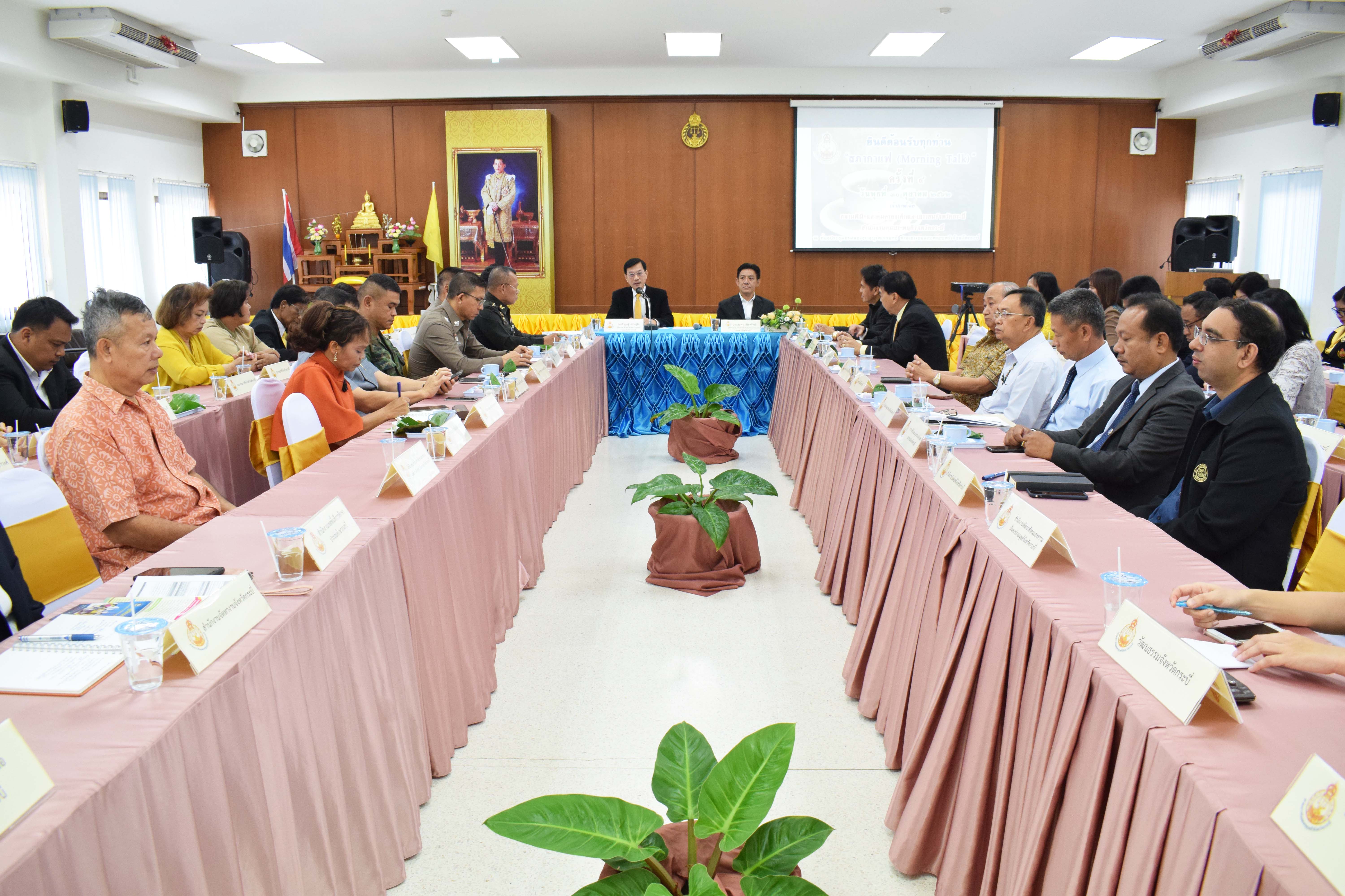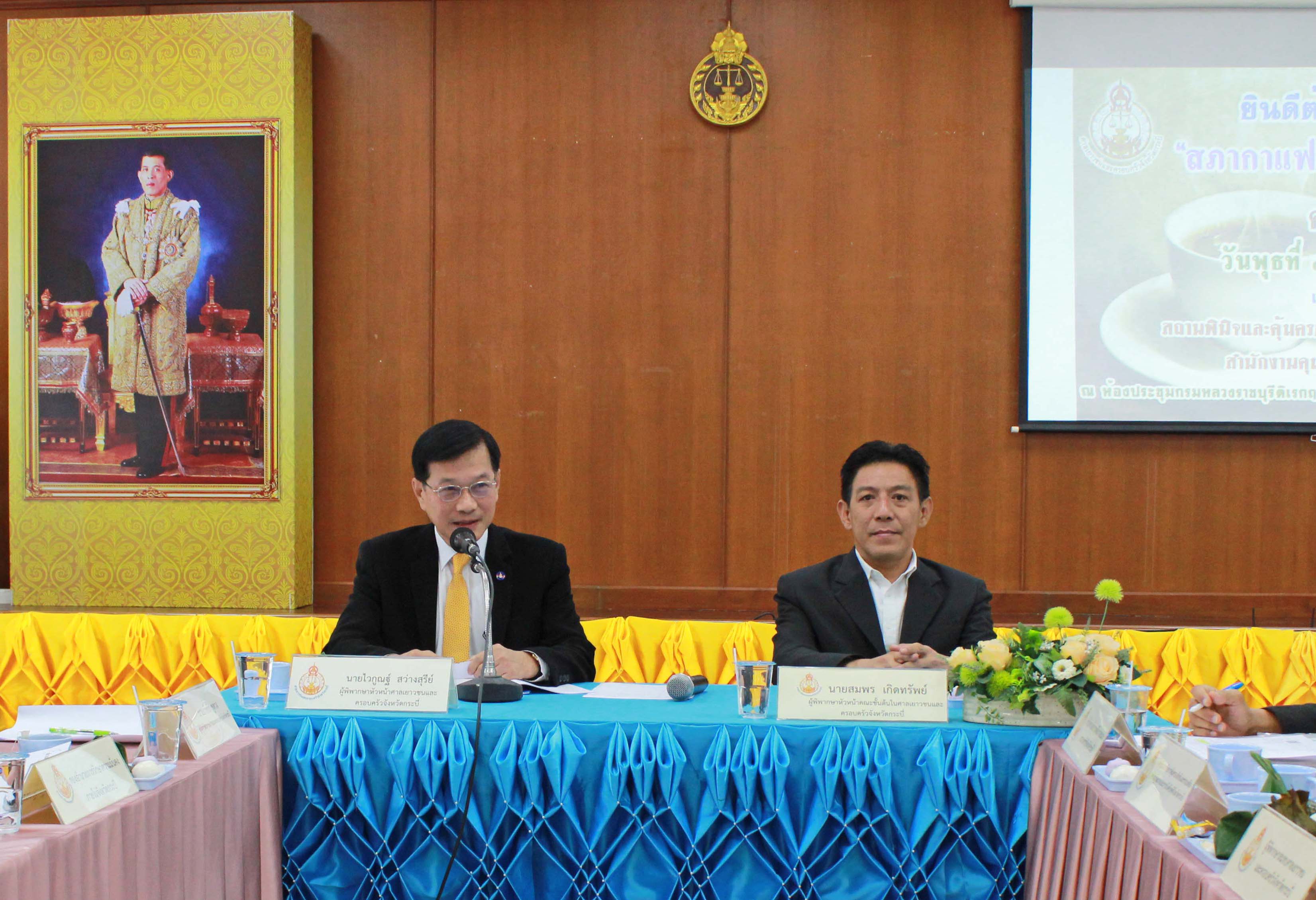 ศาลเยาวชนและครอบครัวจังหวัดกระบี่จัดโครงการ “สภากาแฟ” ครั้งที่ 4 เมื่อวันที่ 30 ตุลาคม 2562 เวลา 07.30 นาฬิกา นายไวกูณฐ์ สว่างสุรีย์ ผู้พิพากษาหัวหน้าศาลเยาวชนและครอบครัวจังหวัดกระบี่ เป็นประธานในการพูดคุยปรึกษาหารือ แลกเปลี่ยนความคิดเห็น ตลอดจนรับฟังปัญหาต่าง ๆ ในรูปแบบของสภากาแฟตามโครงการ “สภากาแฟ (Morning Talk)” ครั้งที่ 4 เพื่อให้ทุกภาคส่วนได้ร่วมกันเสนอแนวทางแก้ไขปัญหาเกี่ยวกับเด็กและเยาวชน ตลอดจนปัญหาอื่น ๆ ที่เกิดขึ้นในจังหวัดกระบี่ อันเป็นการสร้างความสัมพันธ์อันดีและส่งเสริมความร่วมมือให้การปฏิบัติงานร่วมกันเป็นระบบสอดคล้องและมีประสิทธิภาพยิ่งขึ้น ในการนี้มีคณะผู้พิพากษา ผู้พิพากษาสมทบ หน่วยงานในกระบวนการยุติธรรม หน่วยงานราชการต่าง ๆ ที่ต้องทำงานเกี่ยวพันกับศาลเยาวชนและครอบครัวจังหวัดกระบี่