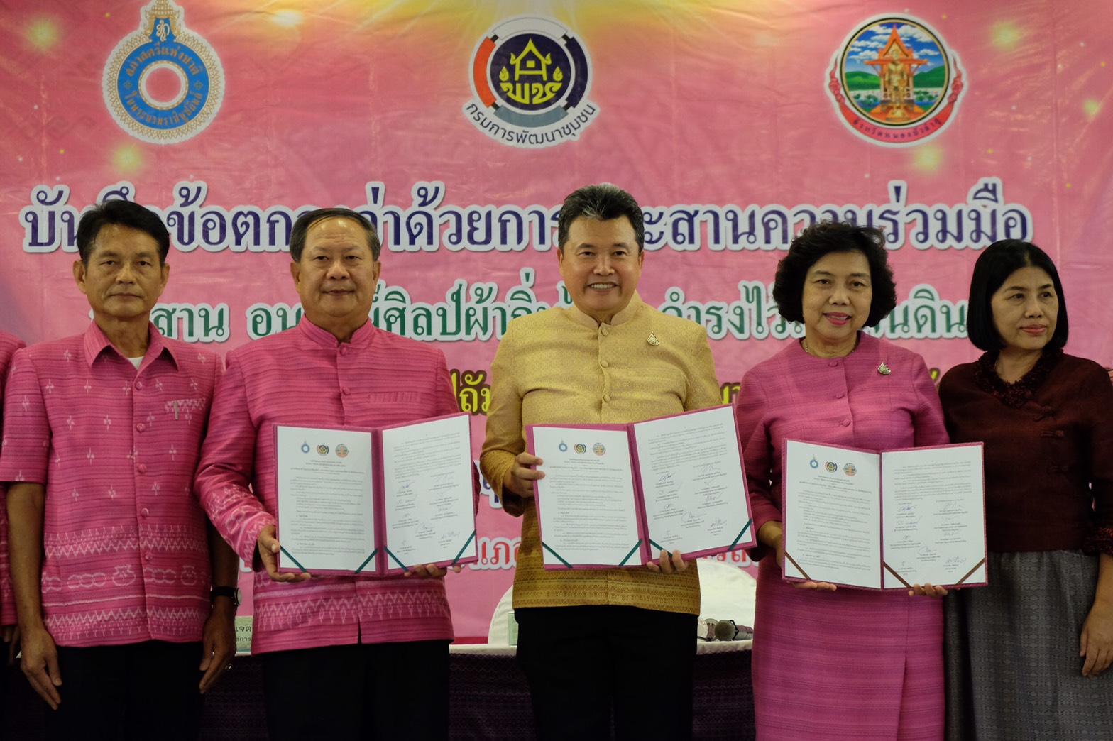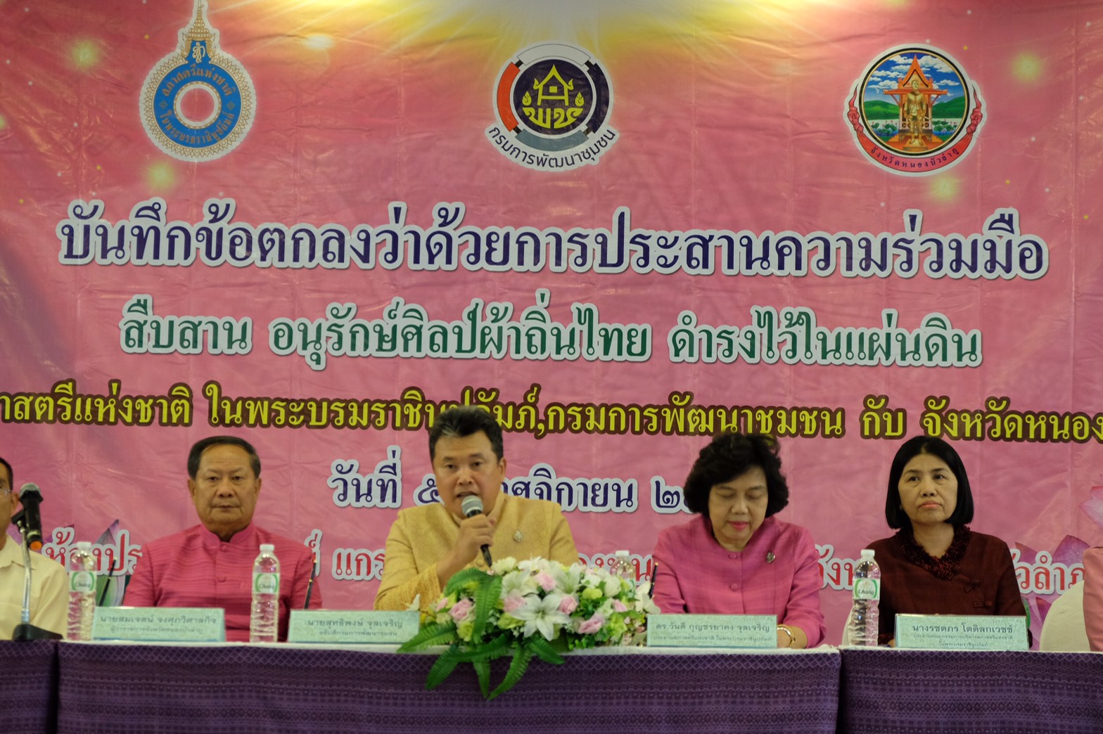 นายสมเจตน์ จงศุภวิศาลกิจ ผู้ว่าราชการจังหวัดหนองบัวลำภู นายจารุวัฒน์ ศรีชุย ประธานคณะกรรมการบริษัทประชารัฐรักสามัคคี นางศรัณยา สุวรรณพรหม ประธานสภาวัฒนธรรมจังหวัดหนองบัวลำภู และ นางพรรณี จันทะศรี ประธานคณะกรรมการพัฒนาสตรีจังหวัดหนองบัวลำภู ร่วมกันลงนามบันทึกข้อตกลงว่าด้วยการประสานความร่วมมือ โครงการ สืบสาน อนุรักษ์ศิลป์ผ้าถิ่นไทย ดำรงไว้ในแผ่นดิน โดยมีวัตถุประสงค์ ในการสืบสานพระราชปณิธานสมเด็จพระนางเจ้าสิริกิติ์ พระบรมราชินีนาถ พระบรมราชชนนี พันปีหลวง โดยการอนุรักษ์ ส่งเสริมและเผยแพร่ผ้าไทย อันเป็นศิลปะ และภูมิปัญญาอันล้ำค่า ในดำรงอยู่คู่ชาติไทยและให้เป็นความชื่นชมของชาวโลก อีกทั้งเพื่อเผยแพร่และรณรงค์ให้ ประชาชนทุกเพศ ทุกวัยใส่ผ้าไทย ทุกวัน