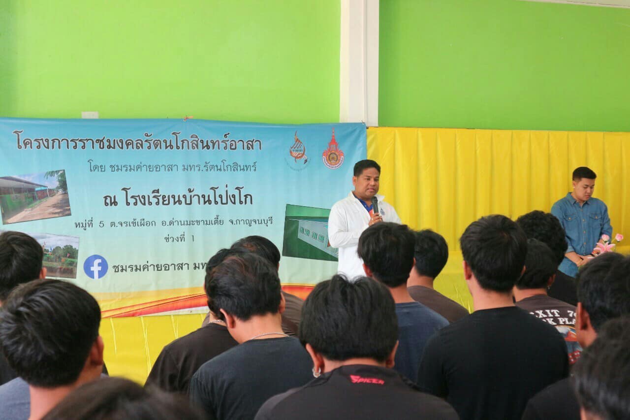 ในวันพุธที่ 6 พฤศจิกายน 2562 มหาวิทยาลัยเทคโนโลยีราชมงคลรัตนโกสินทร์ โดยผู้ช่วยศาสตราจารย์ศิวะ วสุนธราภิวัฒก์ อธิการบดี มอบหมายให้อาจารย์อภิเสฏฐ์ สุวรรณสะอาด ผู้อำนวยการกองพัฒนานักศึกษา เป็นประธานเปิดโครงการราชมงคลรัตนโกสินทร์อาสา ประจำปีการศึกษา 2562 พร้อมด้วยนางสาวพิมรักษ์ บุญกล่ำ ผู้อำนวยการกองกลาง บุคลากรกองพัฒนานักศึกษา ระหว่างวันที่ 4 – 10 พฤศจิกายน 2562 ณ โรงเรียนบ้านโป่งโก ตำบลจรเข้น้อย อำเภอด่านมะขามเตี้ย จังหวัดกาญจนบุรี