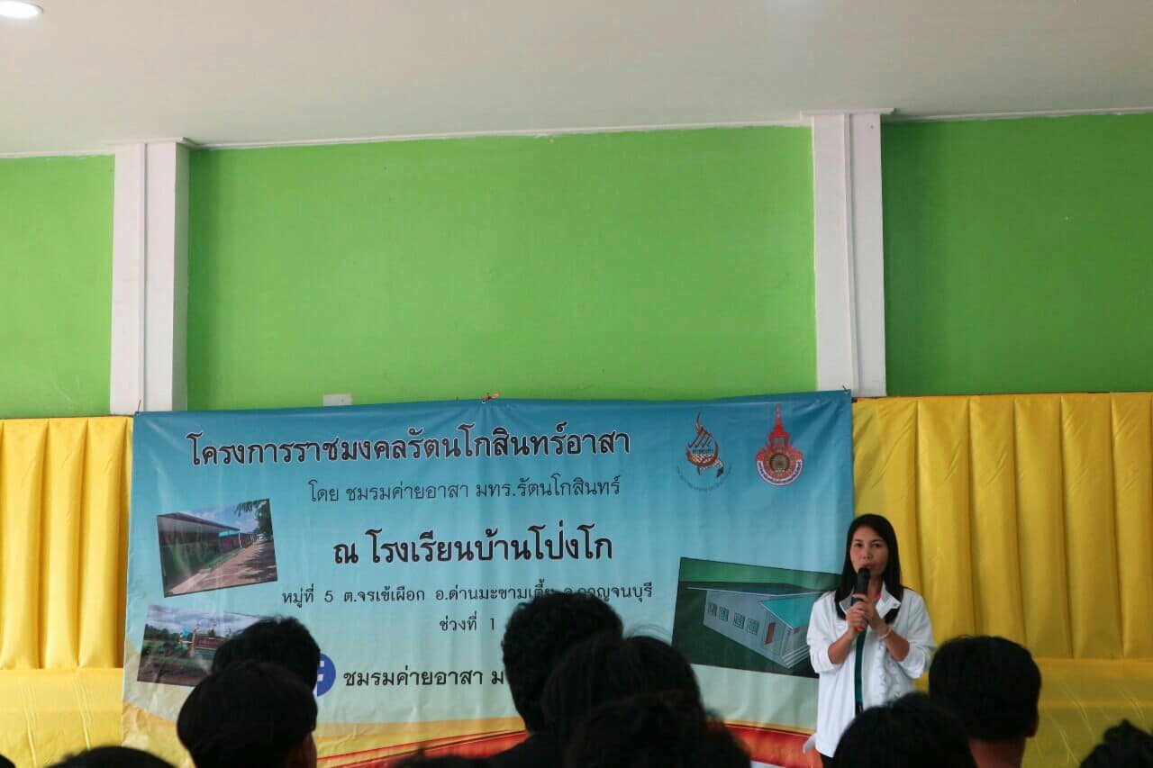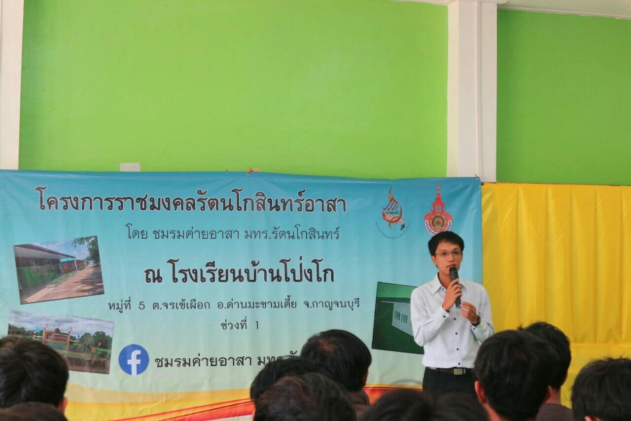 โดย นายเศรษฐ์ฐวัฒน์ ปิ่นเปี้ย ผู้อำนวยการโรงเรียนบ้านโป่งโก กล่าวต้อนรับ ทั้งนี้วัตถุประสงค์ของโครงการราชมงคลรัตนโกสินทร์อาสา เพื่อจัดสร้างอาคารอเนกประสงค์ ขนาด 10 × 12 เมตร เพื่ออำนวยความสะดวกในเรื่องการเรียนการสอนน้องๆ โรงเรียนบ้านโป่งโก ซึ่งเป็นโรงเรียนที่ห่างไกลจากความเจริญ ดำเนินโครงการโดยนักศึกษา “ชมรมค่ายอาสา มทร.รัตนโกสินทร์”