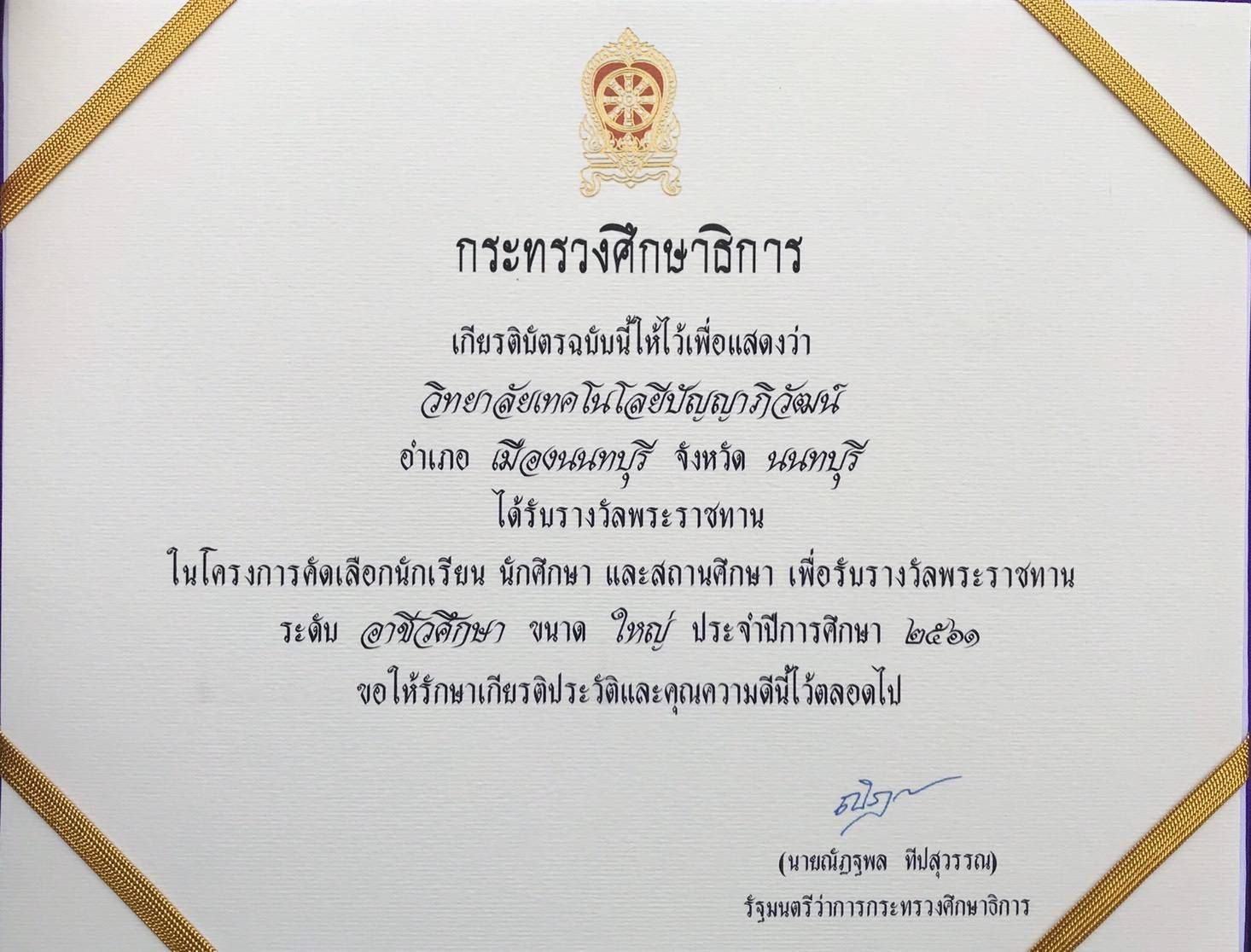 ที่กระทรวงศึกษาธิการ ได้จัดพิธีแสดงความยินดีในผลงานและความดี สมศักดิ์ศรีรางวัลพระราชทาน ประจำปีการศึกษา2561 โดยนำนักเรียน นักศึกษา และผู้แทนสถานศึกษาที่ได้รับรางวัลพระราชทานร่วในพิธี โอกาสนี้นายวิเชียร เนียมน้อม ผู้อำนวยการวิทยาลัยเทคโนโลยีปัญญาภิวัฒน์ได้รับเกียรติบัตรรางวัลพระราชทานซึ่งกระทรวงศึกษาธิการมอบให้วิทยาลัยเทคโนโลยีปัญญาภิวัฒน์ อ.เมืองนนทบุรี จ.นนทบุรี ได้รับรางวัลพระราชทานในโครงการคัดเลือกนักเรียน นักศึกษา และสถานศึกษาเพื่อรับรางวัลพระราชทานระดับอาชีวศึกษาขนาดใหญ่ ประจำปีการศึกษา2561