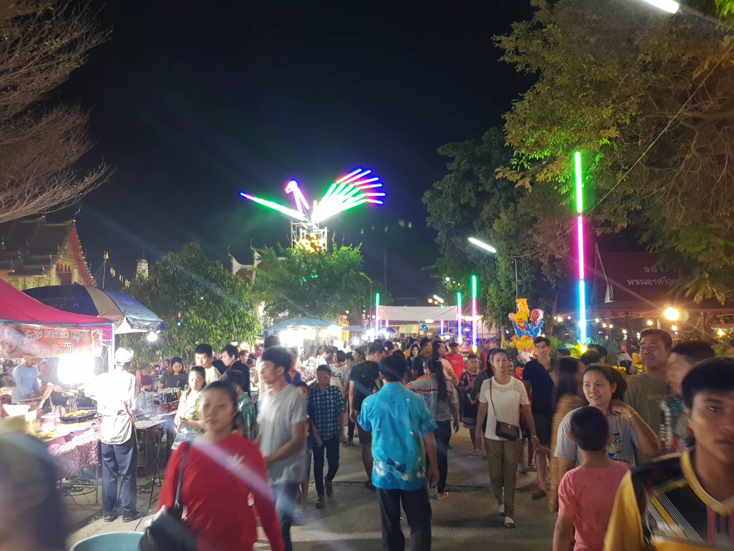 ขณะที่ช่วงกลางคืน ที่บริเวนลำคลองหน้าวัดบ้านสร้าง ช่วงกลางคืน ทางวัดได้จัดไห้มีการลอยกระทงกัน ลำคลองบ้านสร้าง หน้าวัด มีประชาชนนับพันคนหลั่งไหลเข้ามา เที่ยวลอยกระทง กันเป็นจำนวนมาก ร้านขายกระทงวางขายกันเป็นจำมาก ก็ขายดี ส่วนแม่ค้าขายอาหาร ขายดีเป็นพิเศษ ประชาชนทั่วศาลทิด เดินทางมาที่วัดบ้านสร้าง กันเป็นจำนวนมากนอกจากนี้ทางเทศตำบลบ้านสร้าง ยังจัดประกวดนางนพมาศ เด็กตัวน้อยๆสร้างความประทับใจ ให้แก่ผู้มาเที่ยวงานลอยกระทง เป็นอย่างมากสร้างความสนุกนาน บางคนที่มาเที่ยวก็ไปกราบไหว้ขอพรจาก พระอาจารเจ้าอาวาส พรมน้ำมันเพื่อเป็นสิริมงคลอีกด้วย(ในวันเพ็ญ