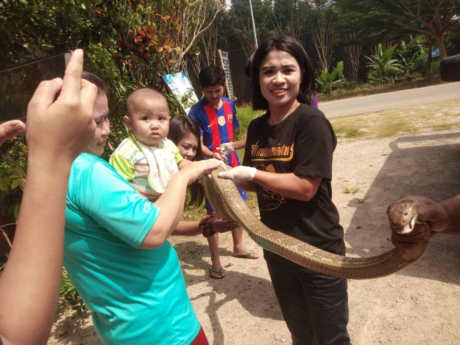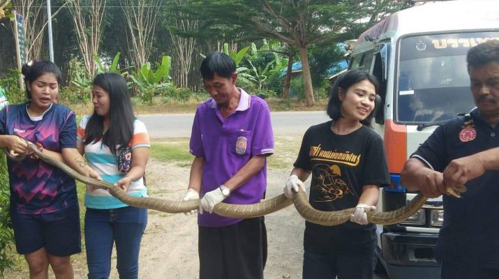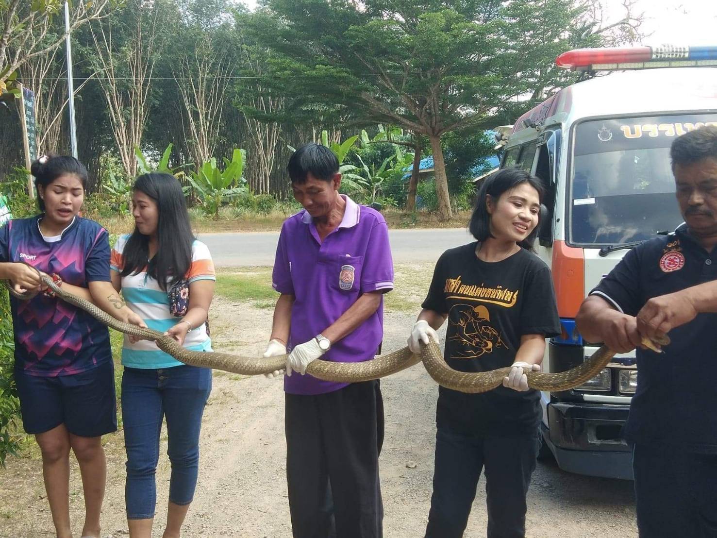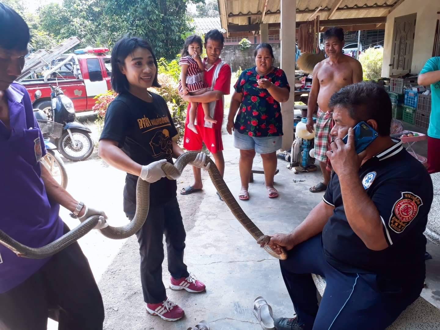 ทีมหน่วยกู้ภัยบรรเทาวังวิเศษ จังหวัดตรัง ช่วยกันจับงูจงอาง ขนาดยาวกว่า 3 เมตร โผล่กลางร้านเสริสวย ช่างเสริมสวยและลูกค้า วิ่งกันอุตลุด ชาวบ้านต่างมุงดูเลขร้านเนื่องจากใกล้วันหวยออก