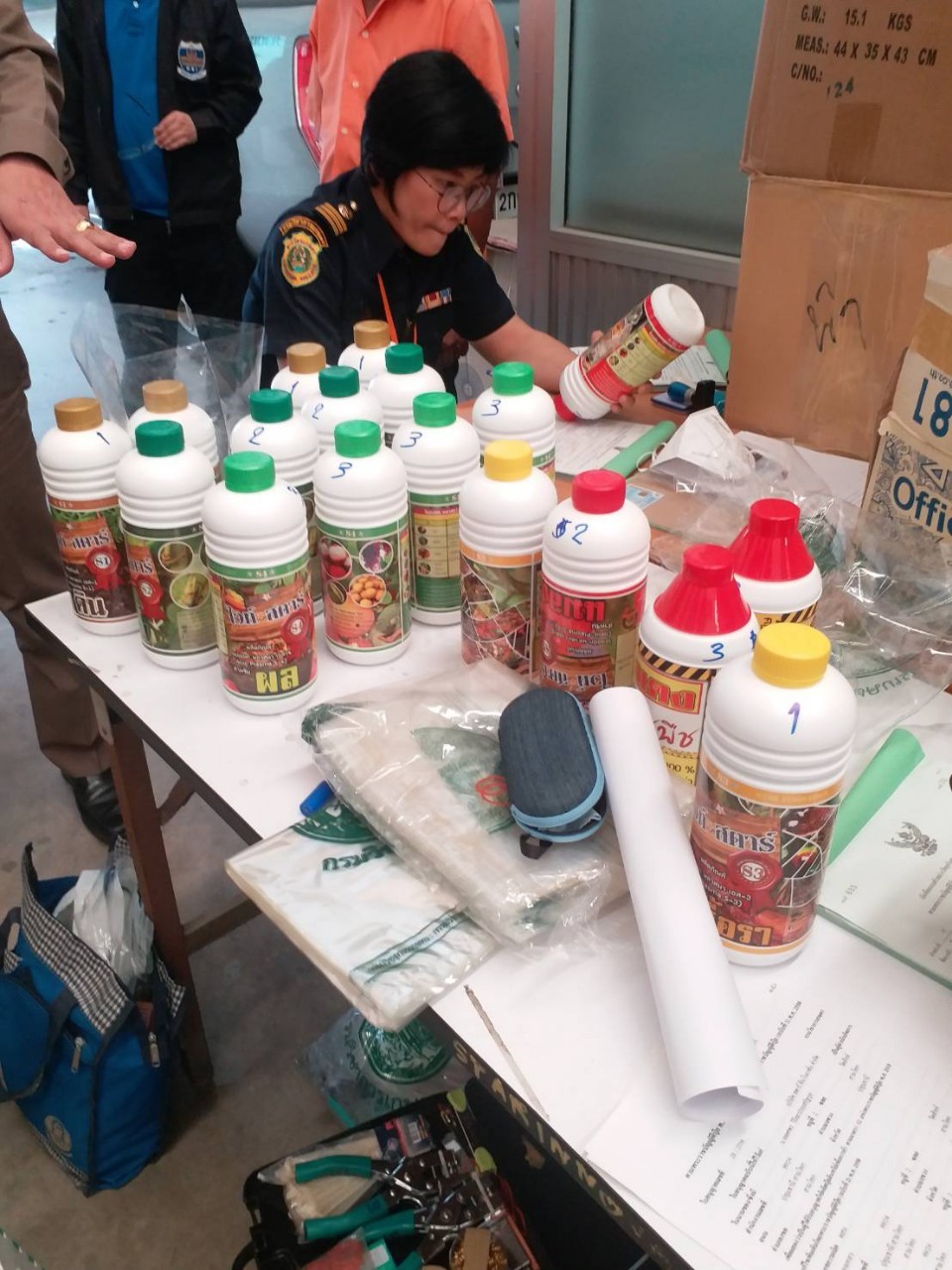 นางสาวเสริมสุข สลักเพ็ชร์ อธิบดีกรมวิชาการเกษตร เปิดเผยว่า ตามที่กรมวิชาการเกษตรได้รับเรื่องร้องเรียนจากเกษตรกรว่ามีการขายสารชีวภัณฑ์สำหรับกำจัดวัชพืช และศัตรูพืช ขายทางสื่อออนไลน์ต่างๆ เป็นจำนวนมาก จึงได้สั่งการให้เจ้าหน้าที่ทำการล่อซื้อสินค้าดังกล่าวเพื่อนำมาตรวจวิเคราะห์ เบื้องต้นพบฉลากที่ระบุเป็นสารชีวภัณฑ์กำจัดวัชพืชไม่ได้ขึ้นทะเบียนกับกรมวิชาการเกษตร และยังพบหลายยี่ห้อมีส่วนผสมของสารเคมีกำจัดวัชพืชพาราควอทและไกลโฟเซต จึงได้สั่งการให้สารวัตรเกษตร กรมวิชาการเกษตรทั้งในส่วนกลางและส่วนภูมิภาคร่วมปฏิบัติงานกับเจ้าหน้าที่กรมสอบสวนคดีพิเศษ หรือ ดีเอสไอ เข้าตรวจค้นแหล่งผลิตและจำหน่ายปุ๋ยและวัตถุอันตรายทางการเกษตรจำนวน 5 จุด ตามที่สืบทราบ โดยแบ่งกำลังเจ้าหน้าที่ออกตรวจค้นกระจายไปตามจุดต่างๆ ได้แก่ อ.สามโคก จ.ปทุมธานี อ.จอหอ จ.นครราชสีมา อ.พิมาย จ.นครราชสีมา และ อ.บางบัวทอง จ.นนทบุรี จำนวน 2 จุด จากการตรวจค้นพบของกลางที่กระทำผิดกฎหมายพบเป็นวัตถุอันตรายจำนวน 18 รายการ และปุ๋ยจำนวน 36 รายการ ปริมาณรวมทั้งสิ้น 58.5 ตัน คิดเป็นมูลค่าความเสียหายในครั้งนี้จำนวนกว่า 25 ล้านบาท