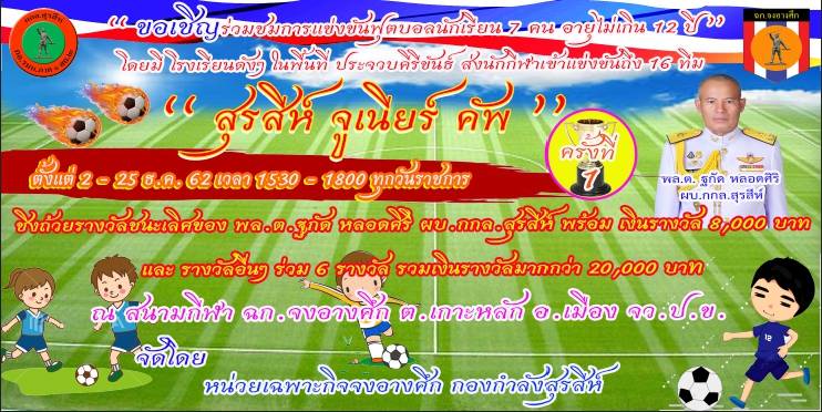 ฉก.จงอางศึก เตรียมจัดฟุตบอล เยาวชน 7 คน อายุไม่กิน 12 ปี “สุรสีห์ จูเนียร์ คัพ ครั้งที่ 1 ชิงถ้วย ผบ.กกล.สุรสีห์ พร้อมเงินรางวัลกว่า 20,000 บาท