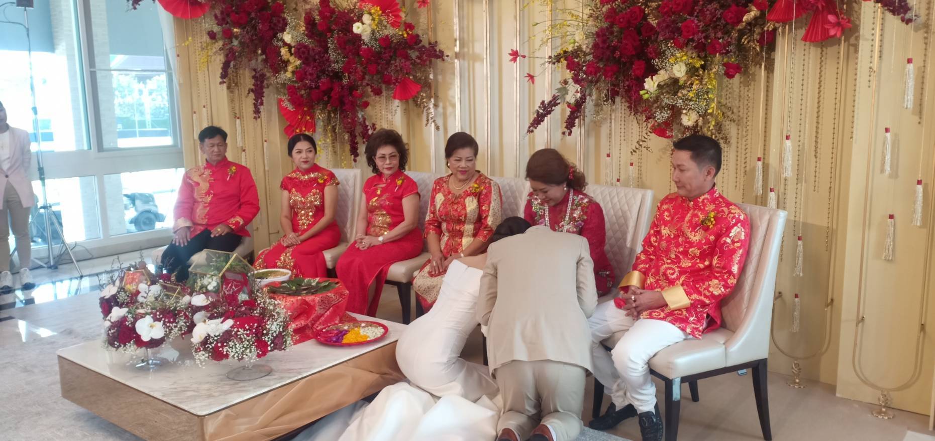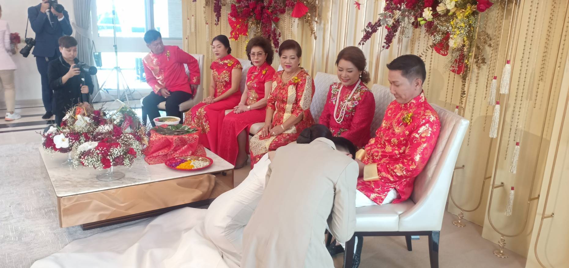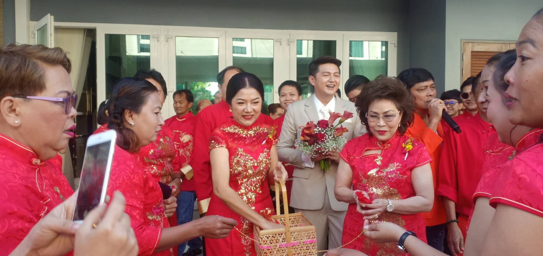 ที่มีสีหน้าที่เงียบขรึม ทำให้ผู้ที่เข้ามาร่วมงานทั้งสองฝ่ายหันมองหน้ากันด้วยความเงียบสงบ อยู่สักสักพักหนึ่งเจ้าสัวจึงเรียกคู่บาวสาวทั้งสอง เข้ามาหา และนั่งมองหน้าคนทั้งสอง และ กล่าวขึ้นว่าป๊าตกลง ที่จะรับเป็นบุตรเขย ทำให้ญาติทั้งสองฝ่ายต่างได้แสดงความยินดีมีเสียงพูดคุยด้วยเสียงดังขึ้นมาและให้ทั้งสองเข้าสู่พิธีมั่นและยกนัำชา เป็นที่ยอมรับตามประเพณีของการมงคลสมรสในวันนี้ ส่วนการ ฉลองที่ เจ้าสัวได้จัดเตรียมเพื่อจะทำการเลี้ยงฉลอง งานมงคลสมรสในเวลา 18.00น.ของวันนี สำหรับงานช่วงเช้านี้ทาเจ้าภาพ ทั้งสองฝ่ายไดรับเกียรติ จากบรรดาญาติเพื่อยฝูงมาร่วมงาน ที้งสองฝ่าย รวมกันหลายร้อยคนในช่วงนำขันมากมาเข้าพิธีสู่ขอก็ผ่านไปด้วยความเรียบร้อย ที่เจ้าสัวห้างทองเฮ็งเส็งเยาวราชโพธาราม เป็น ผู้ออกค่าใช้จ่ายในงาน มงคลของลูกสาว และรับบุตรเขย มาเป็นคนในครอบครัวเดียวกัน โดยเชิญสักขีพยานรับรู้ มาร่วมงาน ฉลองในคำคืนนี้โดยไม่ขอรับของขวัญและซองช่วยงานแต่อย่างใด.