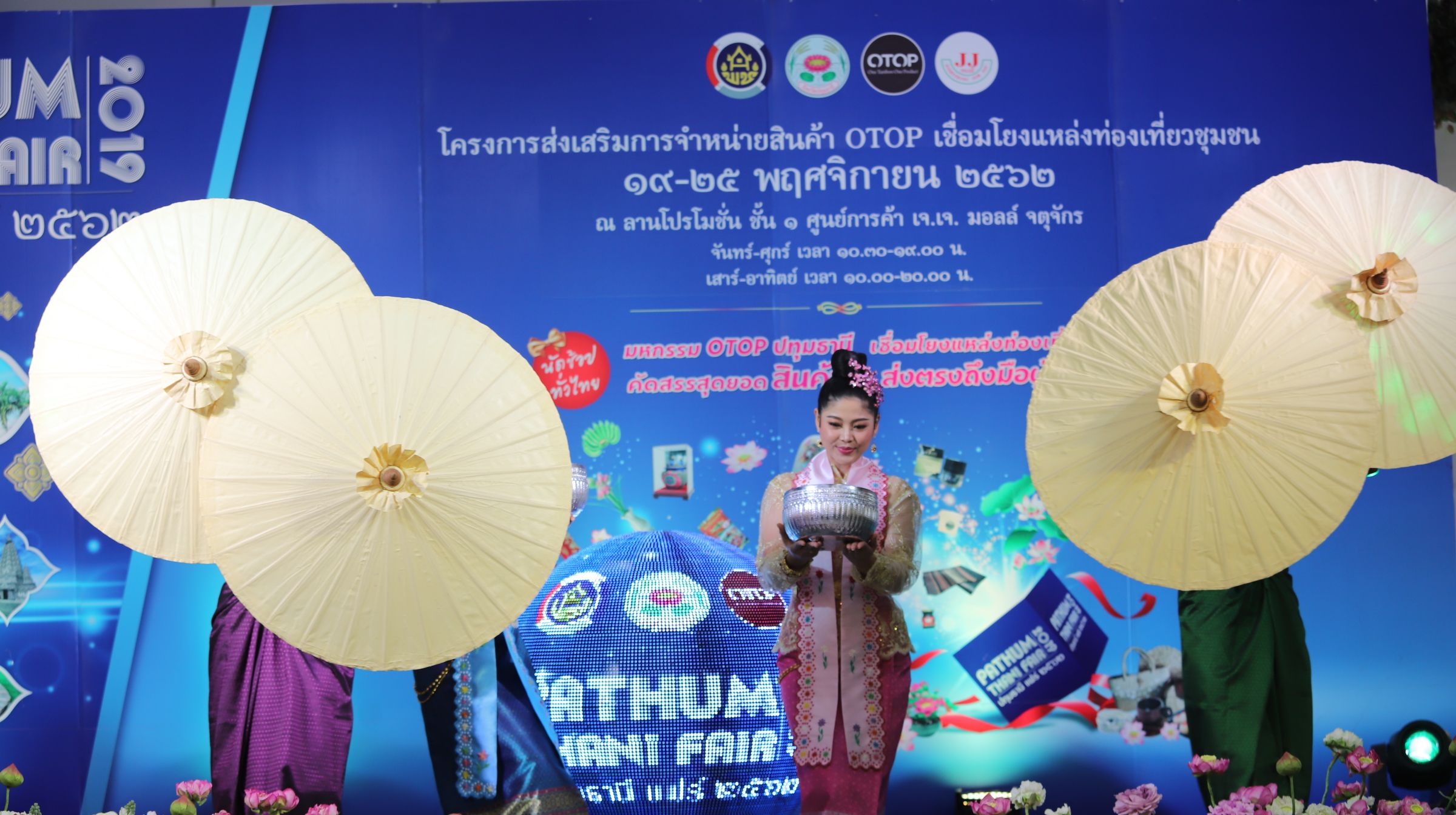 เมื่อเวลา 14.30 น.วันที่20 พฤศจิกายน 2562 ดร.พินิจ บุญเลิศ ผู้ว่าราชการจังหวัดปทุมธานี มอบหมายนายผล ดำธรรม เป็นประธานในพิธีเปิดงาน “PATHUM THANI FAIR 2019” ครั้งที่ 3 โดยมีนายพงษ์เทพ รุ่งเรือง พัฒนาการจังหวัดปทุมธานี นางสาวฐิต์ณัฐ สมบัติศิริ วัฒนธรรมจังหวัดปทุมธานี หัวหน้าส่วนราชการ และผู้ประกอบการสินค้า OTOP/SMEs ซึ่งภายในงานมีสินค้าดีและผลิตภัณฑ์เด่นที่เป็นอัตลักษณ์ของจังหวัดปทุมธานี เข้าร่วมจัดแสดงและจำหน่ายรวม 84 บูธ