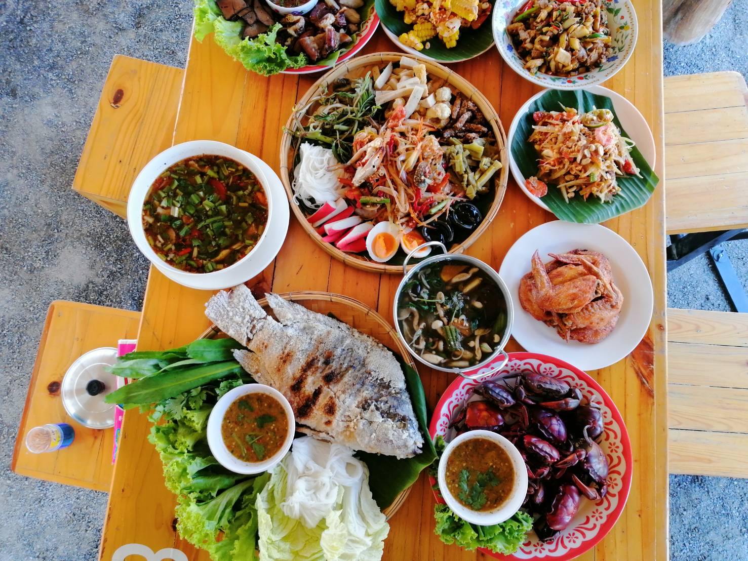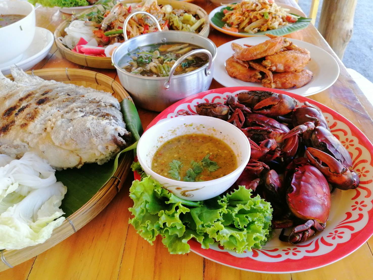 ส่วนเมนูอาหารที่ลูกค้าส่วนใหญ่สั่งมากที่สุด คือปูนาต้มน้ำจิ้มรสเด็ด ปลาเผา สดเนื้อหวาน ส้มตำยกกระโด้งมหาชัย หรือตำทะเล ส้มตำประเภทต่าง ๆ มากมาย รสแซบ สด จี๊ดถึงใจ ไส้อ่อนย่าง ตับย่าง คอหมูย่าง (รวมย่าง) ทานกับน้ำจิ้มแจ่วรสเด็ด แกงป่าไก่บ้าน ต้มยำไก่บ้าน ต้มแซบ และเมนูอื่น ๆ อีกกว่า 100 เมนู บริการพร้อมผักสดฟรี บริการตัวเองหยิบได้เลยไม่อั้นและก๋วยเตี๋ยว น้ำซุปหอมอร่อย ฝีมือคุณแม่เจ้าของร้านที่ขายก๋วยเตี๋ยวมาตั้งแต่อายุ 11 ขวบ สำหรับเมนูปูนาต้มจิ้มซีฟู้ด ทางร้านจะรับซื้อปูนาตัวโตๆจากชาวบ้านที่จับมาขายพื้นที่อำเภออู่ทอง บางส่วนยังทำนาปลูกข้าวไร้สารเคมี จึงมีปูนาเหลืออยู่ในทุ่งนาตามธรรมชาติ ซึ่งปูนาช่วงปลายฝนต้นหนาว จะมีรสชาติหอม หวาน มัน (หากินยาก) แต่เมนูปูนาต้มจะมีเฉพาะบางวันนะครับ ขึ้นยู่กับชาวบ้านหามาขายให้ก็มี บางวันก็อาจจะไม่มี ลูกค้าบางรายกลัวหมดก็ต้องโทรสั่งจองเมนูปูนาเอาไว้ล่วงหน้า ส่วนปลานิลเผาเกลือ ก็จะเป็นปลาจากธรรมชาติจากทุ่งนาเราเอง ปลาจึงสด หวาน ไม่มีกลิ่นโคลน