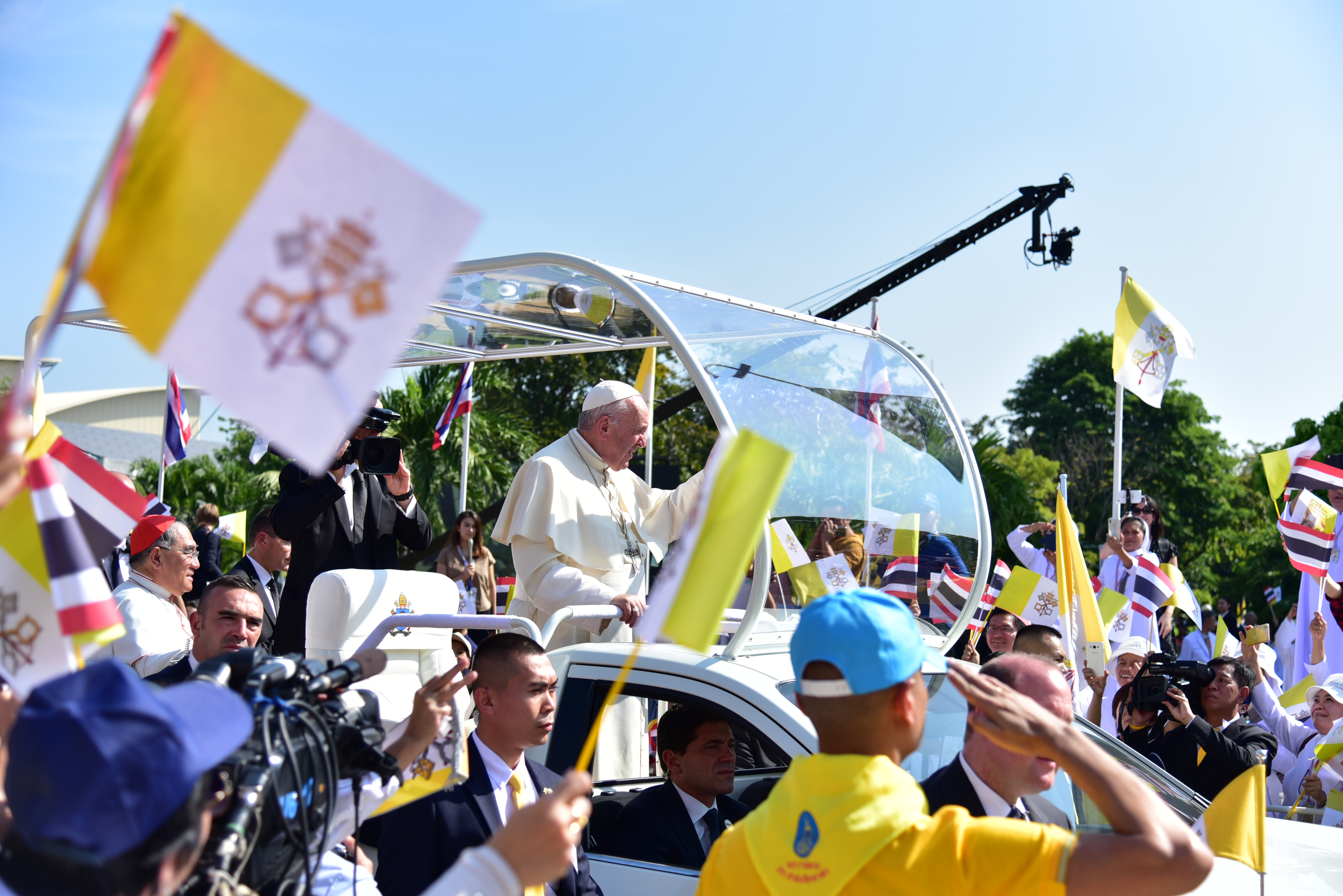 จากนั้นทรงประทับรถพระประเทียบเปิดประทุน เพื่อประทานพระวโรกาสให้คริสตชนที่มาเข้าเฝ้าบริเวณโดยรอบของวัดนักบุญเปโตรได้เข้าเฝ้าอย่างใกล้ชิด เมื่อเสด็จโดยรถพระประเทียบเปิดประทุนโดยรอบบริเวณแล้ว เสด็จเข้าสู่ภายในโบสถ์นักบุญเปโตร ผู้แทนบาทหลวง นักบวชหญิง สามเณร และครูคำสอน ถวายมาลัยข้อพระกรแด่สมเด็จพระสันตะปาปา แล้วเสด็จไปทรงวางช่อดอกไม้คารวะพระรูปนักบุญเปโตร อัครสาวก ผู้เป็นพระสันตะปาปาองค์แรก และเป็นองค์อุปถัมภ์ของวัด ต่อด้วยการร่วมกันขับร้องเพลง “หนทางแห่งรัก” หลังจากนั้น สมเด็จพระสันตะปาปาฟรานซิส ประทานพระโอวาทแก่บรรดาบาทหลวง นักพรต สามเณร ผู้ฝึกหัด ครูคำสอน เมื่อจบพระโอวาทแล้ว ทุกคนพร้อมใจกันภาวนาเพื่อกระแสเรียก เพื่อขอพระเจ้าได้โปรดประทานผู้สนใจถวายชีวิตเป็นบาทหลวง นักบวช นักพรตให้มากยิ่งขึ้นเพื่อการงานแพร่พระคริสตธรรมจะดำเนินไปด้วยดี และร่วมขับร้องเพลง “หนทางพระคริสต์”
