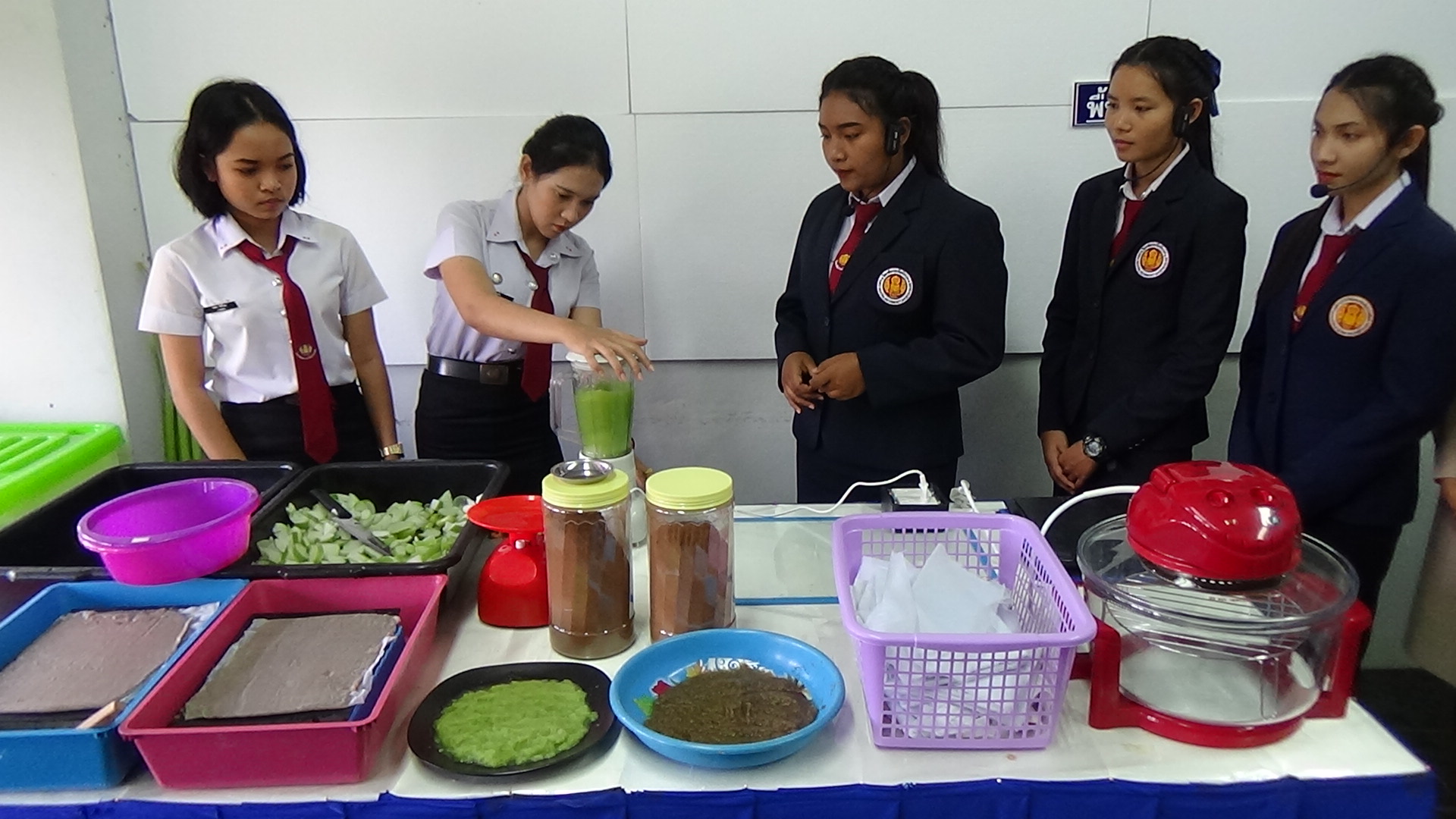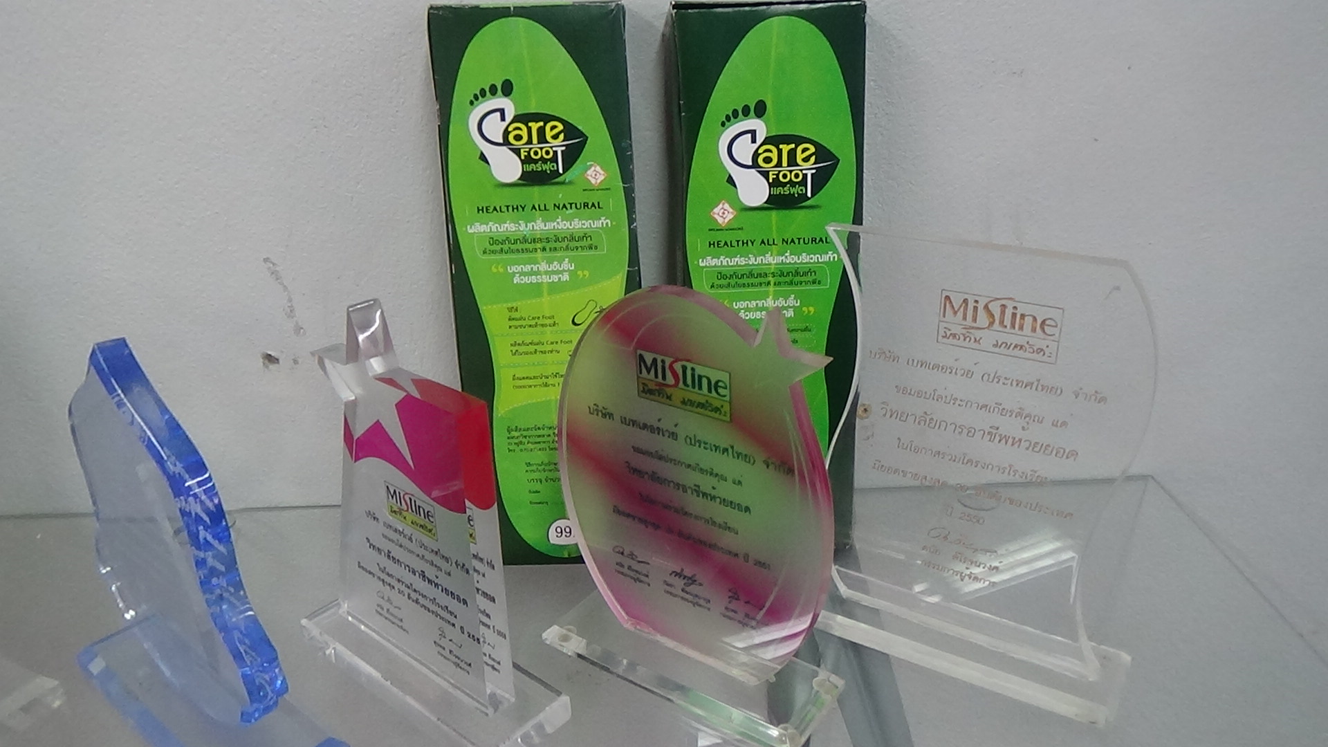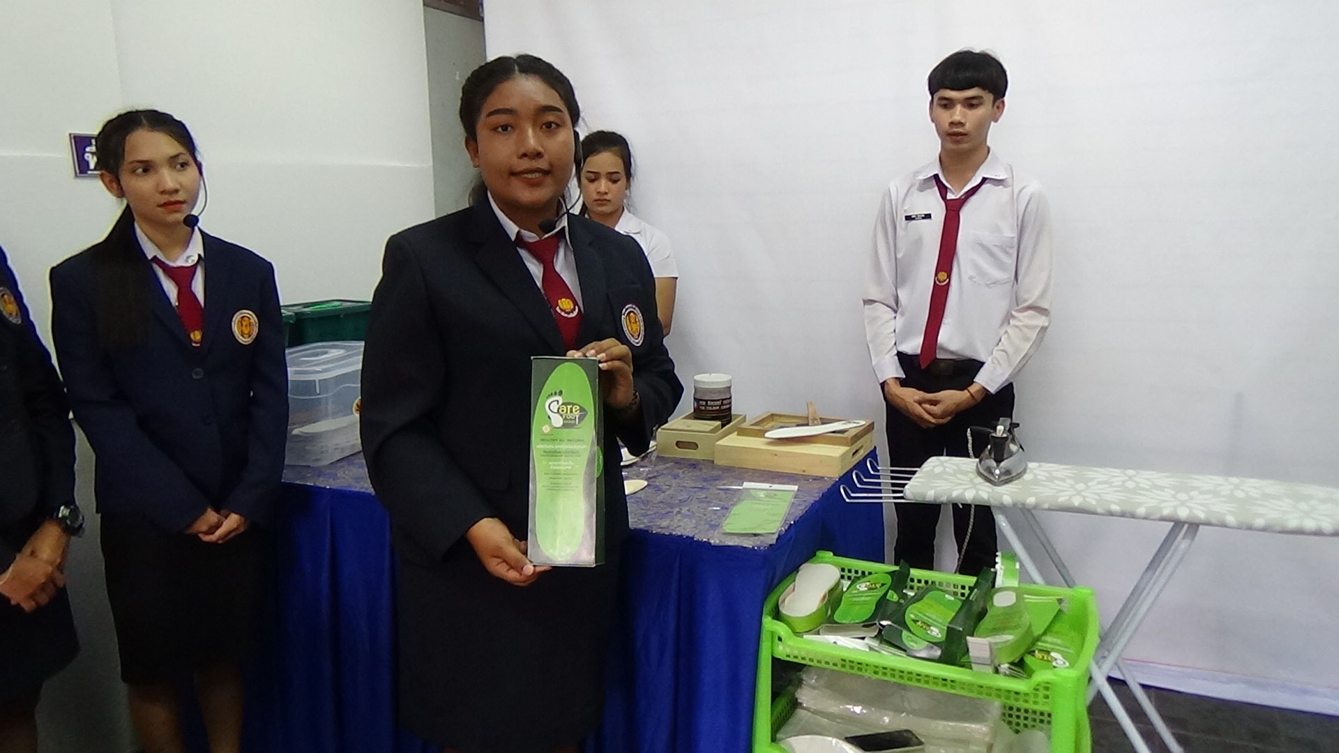นายกษิดิฎฐ์ คำศรี ผู้อำนวยการวิทยาลัยการอาชีพห้วยยอด นายทวีศักดิ์ ศิลวิศาล รองผู้อำวยการฯฝ่านบริหาร นางสาวทรรศิรัษฎ์ ทองตาล่วง ครูที่ปรึกษาธุรกิจแคร์ฟุต นางสาวสุคนทิพย์ คล้ายกุล หัวหน้าแผนกวิชาการตลาด นางกันยารัตน์ อั้นเต้ง หัวหน้างานส่งเสริมผลผลิตและการค้า นำผู้สื่อข่าวเยี่ยมชมการทำแผ่นระงับเหงื่อบริเวณเท้า โดยมีน.ส.จันจิรา เกสรบัว นักศึกษาชั้นปวส.1สาขาวิชาการตลาด วิทยาลัยการอาชีพห้วยยอด พร้อมเพื่อนักศึกษา ได้สาธิตการทำแผ่นระงับเหงื่อบริเวณเท้าโดยใช้วัสดุจากธรรมชาติ ซึ่งนำพืชอ้อดิบหรือคูณ ซึ่งเป็นพืชท้องถิ่นที่หาได้ทั่วไป และมีมากที่สุดในเขตภาคใต้ ส่วนใหญ่คนนิยมนำมาทำเป็นอาหารพื้นบ้าน เช่น แกงส้มพบว่าลำต้นของอ้อดิบ มีสรรพคุณทางยา แก้พิษไข้ พิษร้อน ลำต้นใต้ดิน รักษาแผล กัดฝ้า กัดหนอง และลำต้นที่ตากแห้ง ช่วยดูดซับความชื้นได้เป็นอย่างดี ทั้งนี้นำอ้อดิบมาหั่นแล้วนำมาปั่น จากนั้นนำมาผสมกับผงไม้เทพธาโร ซึ่งไม้เทพธาโรเป็นไม้หอมที่มีคุณค่าทางเศรษฐกิจเป็นสกุลไม้เดียวกับต้นอบเชย พบมากที่สุดทางภาคใต้ มีสรรพคุณทางยาช่วยรักษาโรคผิวหนังที่เกิดจากเชื้อรา และแบคทีเรีย ในอ.ห้วยยอด จ.ตรัง ได้นำไม้เทพทาโรมาแกะสลักเป็นผลิตภัณฑ์ OTOP จึงนำมาเป็นส่วนประกอบในการผลิต “แผ่นระงับกลิ่นเหงื่อบริเวณเท้า” จากนั้นนำมาเทลงในบล็อกแล้วนำมาอบให้แห้ง จากนั้นนำมาตัดตามไซด์ของรองเท้าที่มีจำหน่ายทั่วไป โดยจำหน่ายในราคาขายคู่ละ 29 บาท ใช้ได้นาน 1 ปี หลังจากเปิดใช้งาน หรือแพ็คละ 99 บาท มี 4 คู่