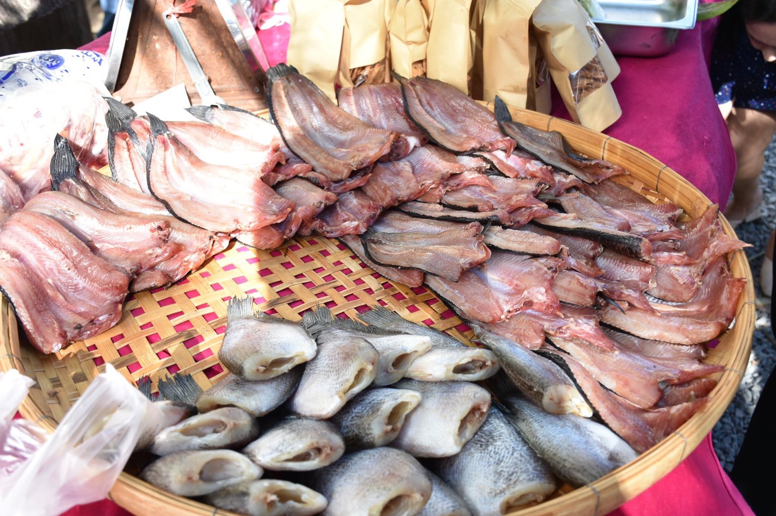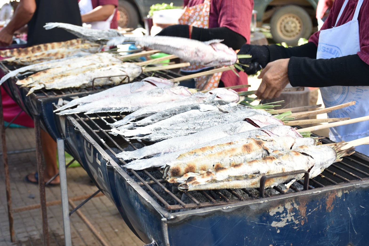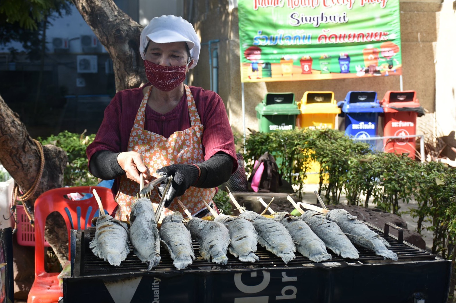 เกษตรกรกลุ่มวิสาหกิจชุมชนแม่บ้านพัฒนา บ้านแม่ลา จำหน่ายปลาช่อนเผาแม่ลาของแท้ ณ ศาลากลาง จ.สิงห์บุรี