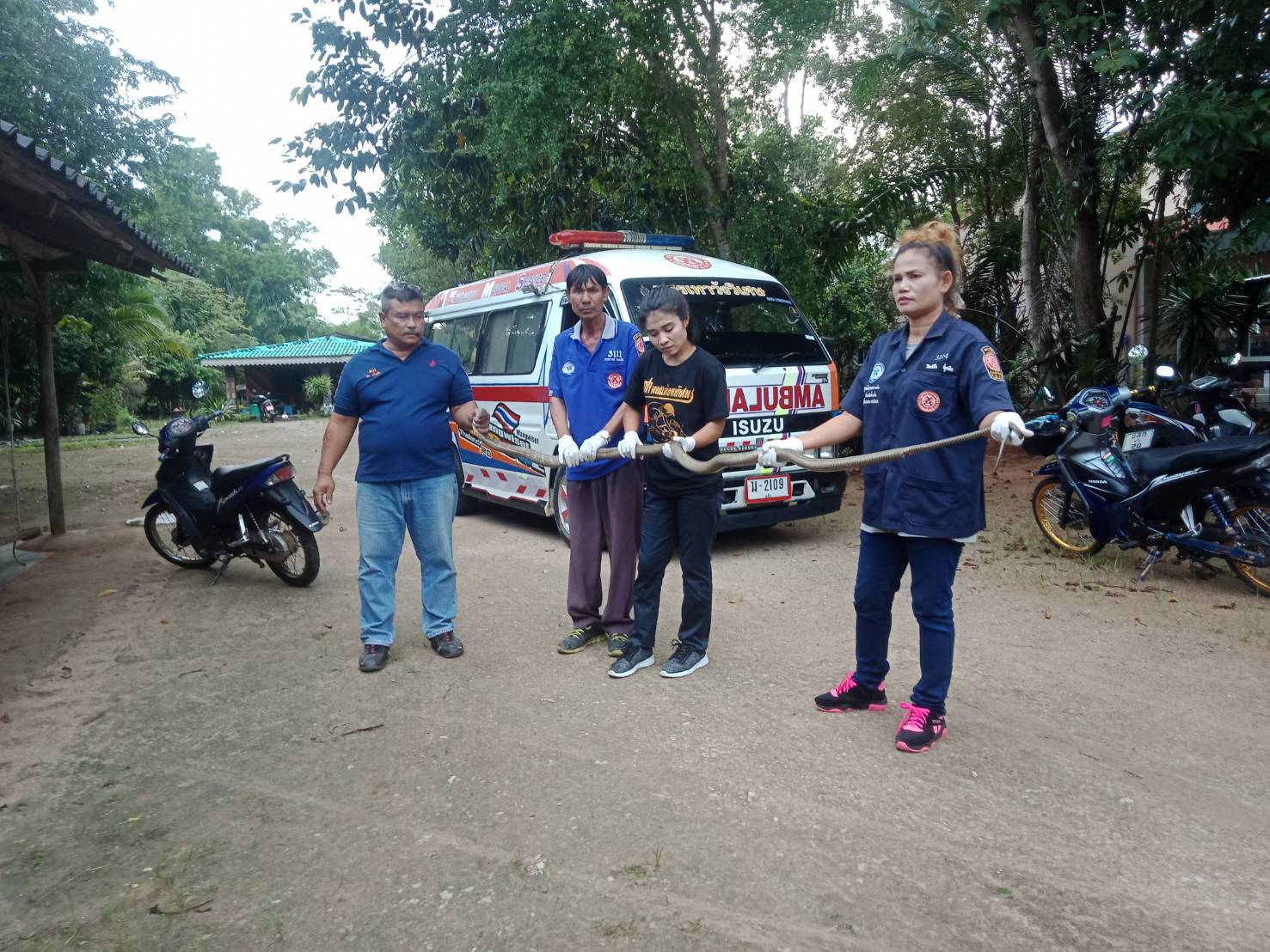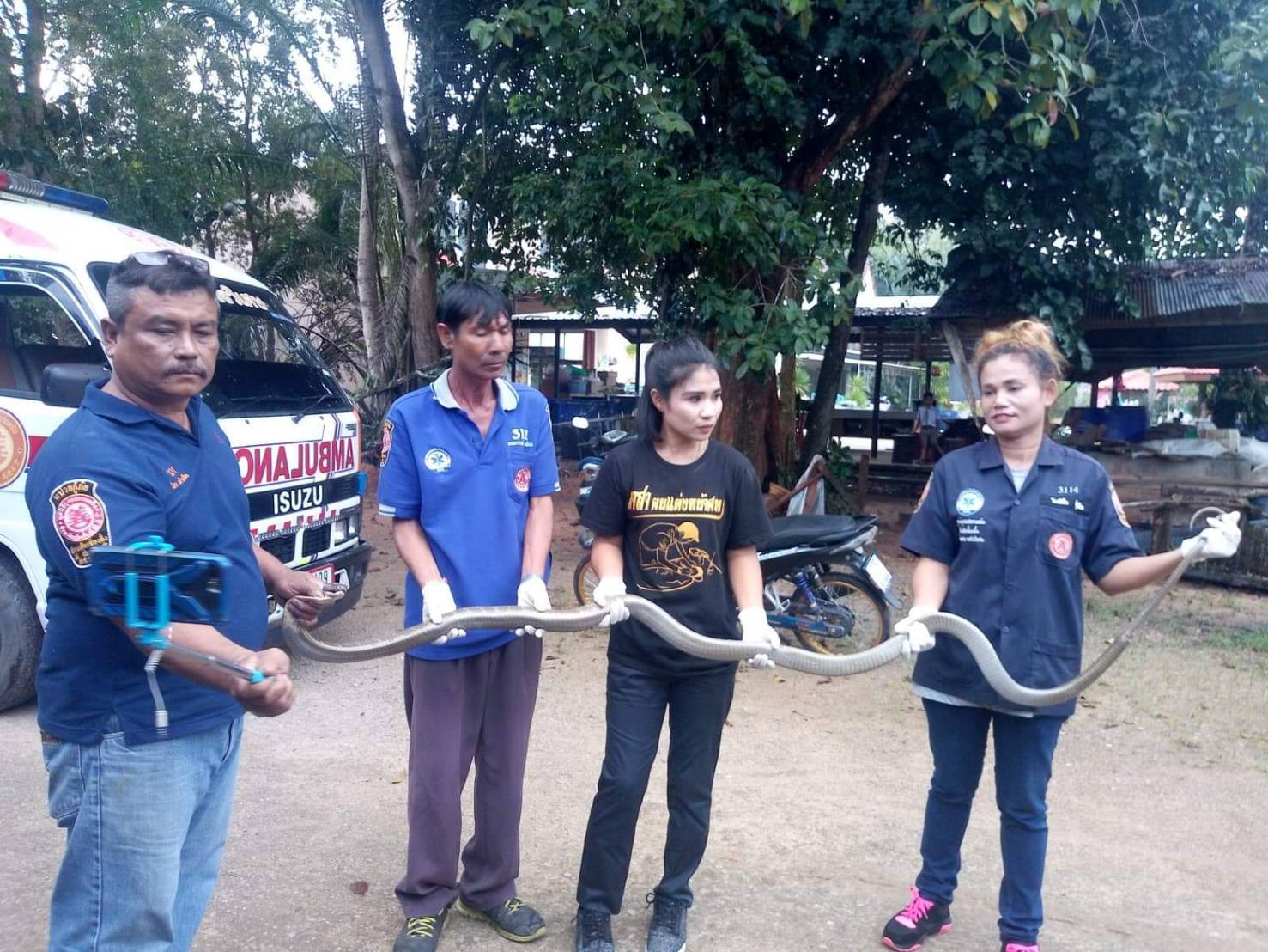 หน่วยกู้ภัยบรรเทาวังวิเศษ (มูลนิธิกุศลสถานตรัง บ๊วนเต็กเซี่ยงตึ๊ง) นำโดยนายไสว แก้วเจือ หัวหน้าหน่วยกู้ภัยบรรเทาวังวิเศษ ได้รับแจ้งจากชาวบ้านในตำบลอ่าวตง อำเภอวังวิเศษ จังหวัดตรัง ว่ามีงูจงอางขนาดใหญ่ เลื้อยเข้าบ้านสร้างความหวาดกลัวให้กับเจ้าของบ้านและชาวบ้านเป็นอย่างมาก ทางเจ้าหน้าที่หน่วยกู้ภัยวังวิเศษ จึงได้รีบเดินทางไปจับกุมงูจงอาง เมื่อเดินทางไปถึงพบคุณยาย แหวว รอดดำอายุ 75 ปี อยู่บ้านเลขที่ 26 ม.12 ต.อ่าวตง อ.วังวิเศษ จ.ตรัง ซึ่งเป็นเจ้าของบ้านที่งูจงอางเลื้อยเข้าไปในบ้าน ซึ่งคุณยาย ได้เล่าให้กู้ภัยฟังว่าตนเองอยู่ในบ้านดังกล่าวคนเดียว และกำลังจะปรุงอาหารมื้อเย็นอยู่ในครัว จู่ๆก็มีจงอางตัวใหญ่เลื้อยเข้ามาทางประตูครัวหลังบ้าน คุณยายตนเองแทบช็อคทำอะใรไม่ถูกเลย ค่อยๆเดินหนีออกมาทางหน้าบ้าน เจ้างูจงอาง ก็เลื้อยตามตนเองมาอีก และมาซุกอยู่ที่ข้างเตียงนอนของตนเอง คุณยายตกใจ