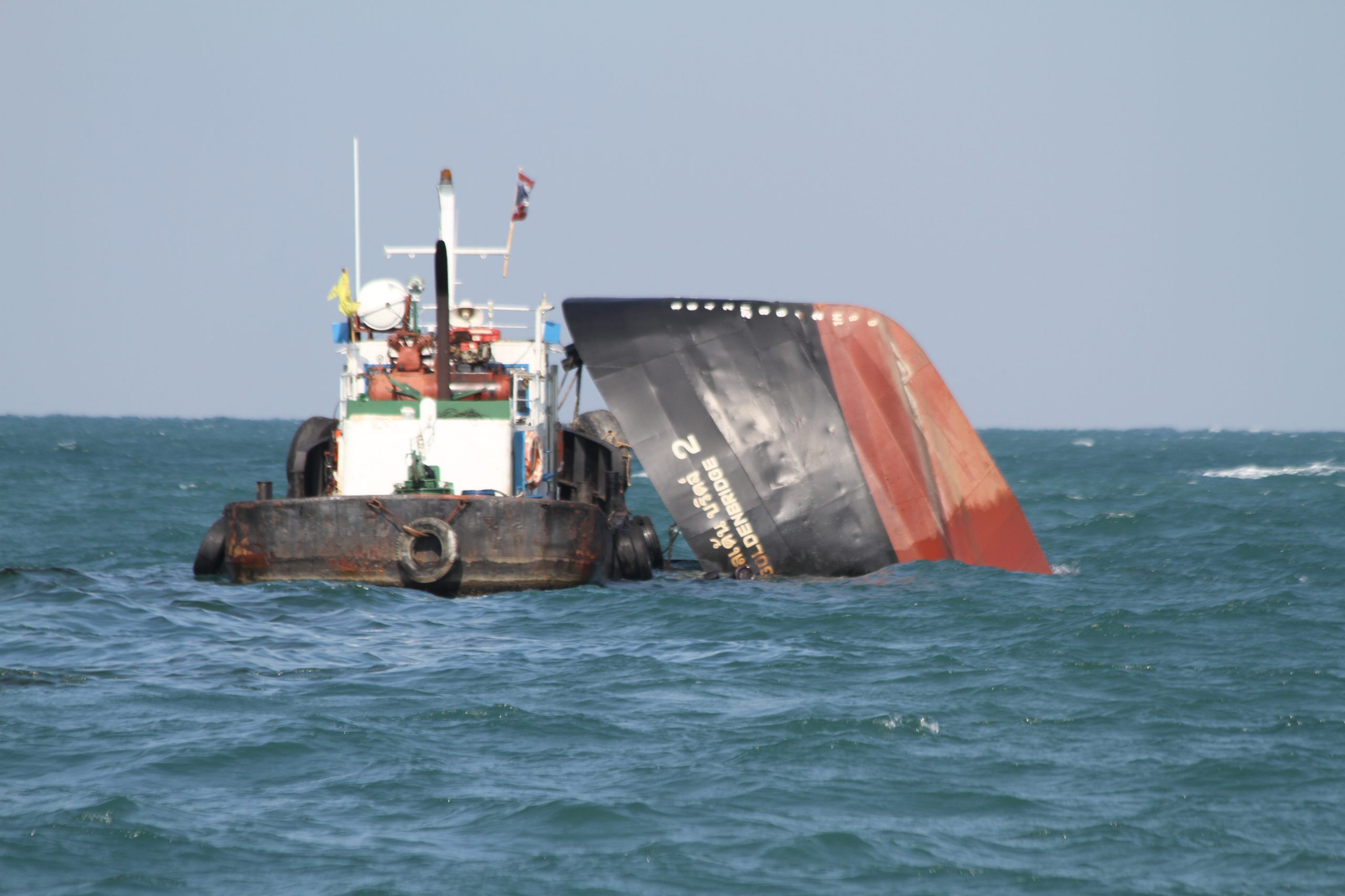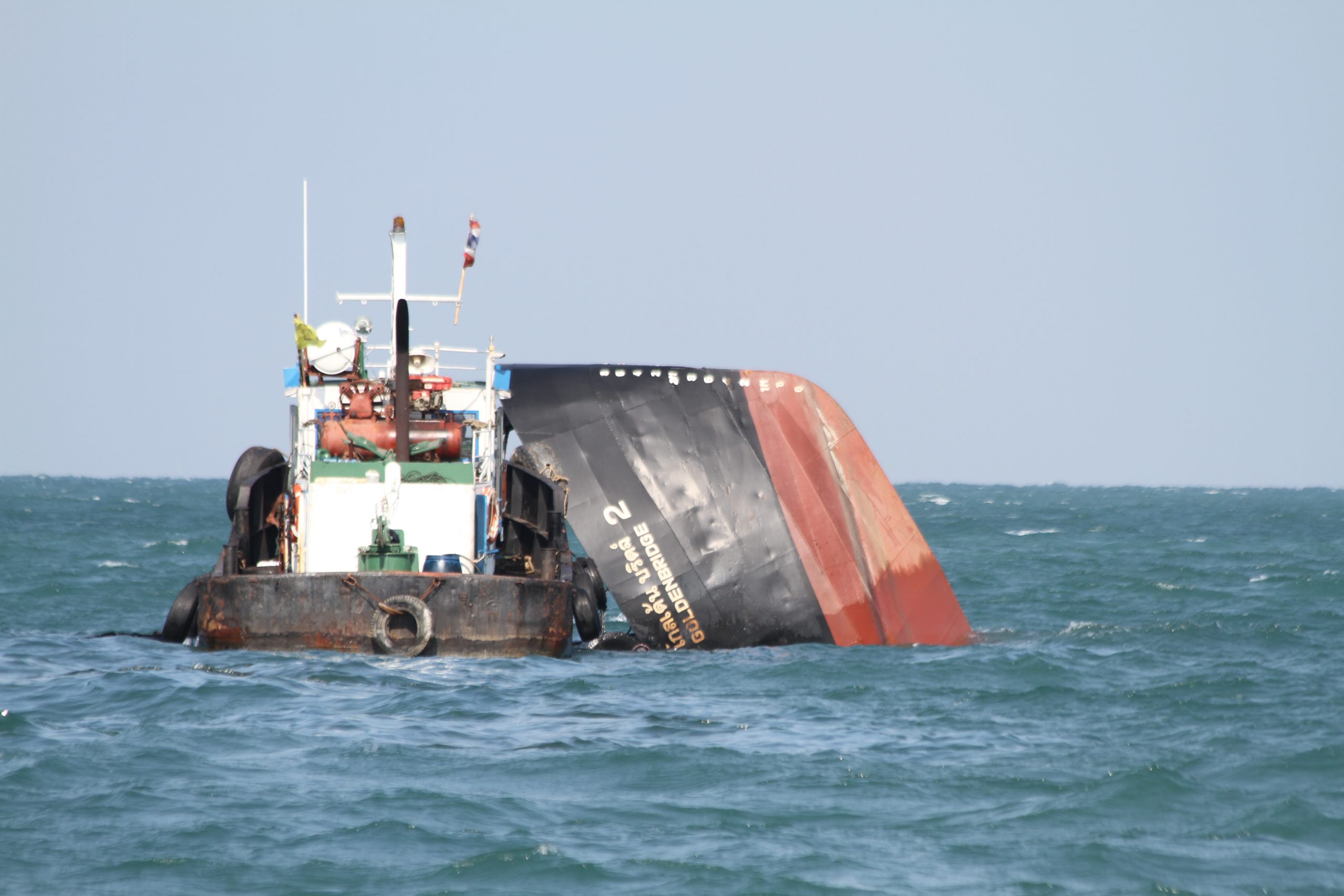 ***** เมื่อเวลา 13.30 น.วันที่ 4 ธันวาคม 2562 นายอำนาจ สอนหมวก ผู้อำนวยการสำนักงานเจ้าท่าภูมิภาคสาขาสมุทรปราการ พร้อมด้วยข้าราชการทหารจากองทัพเรือ ได้ร่วมกันนำเรือตรวจการณ์ของสำนักงานเจ้าท่าภูมิภาคสาขาสมุทรปราการ ออกตรวจดูการกำจัดคราบน้ำมันในทะเลบริเวณที่เรือโกลเด้น บริดล์ 2 ( Golden Bridge 2 ) ซึ่งเป็นเรือรับกำจัดและบรรทุกของเสียปนเปื้อนน้ำมันเตาประมาณ 100,000 ลิตรจมอยู่บริเวณทะเลปากอ่าวห่างจากฝั่งด้านจังหวัดสมุทรปราการประมาณ 15 ไมล์ทะเล ที่จมลงเนื่องจากถูกคลื่นตีเข้าท้ายเรือ ทำให้เรือเอียงซึ่งในขณะนั้นเครื่องปั่นไฟไม่ทำงาน และเรือได้จมลงตั้งแต่เวลา 05.45 น.ของวานนี้ที่ 3 ธันวาคม ที่ผ่านมา ทำให้น้ำมันเตารั่วไหล ประมาณ 20,000 ลิตร จากการตรวจสอบคราบน้ำมันที่ลอยในทะเลเป็นน้ำมันเตาจำนวน 104,00 ลิตร