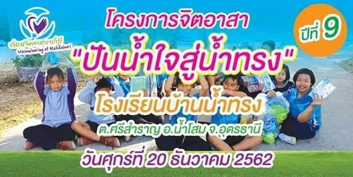 เนื่องด้วยในวันที่20ธันวาคม2562 นี้ ทางสมาชิกชมรมจิตอาสาราชบุรี นำโดยนายประทีป อยู่แช่ม ประธานชมรมจิตอาสา ได้จัดโครงการจิตอาสาปันน้ำใจให้น้องต้านภัยหนาว ที่โรงเรียนบ้านน้ำทรง อ.น้ำโสม จ.อุดรธานี โดยนำอุปกรณ์การเรียน อุปกรณ์กีฬา ของเล่น ขนม ของใช้ในครัวเรือน เสื้อผ้ากันหนาว ทุนการศึกษา พัดลมโรงงาน เครื่องปริ้นเตอร์ เสื้อวอร์ม ถุงเท้านักเรียน ไปแจกให้กับเด็กๆ ซึ่งกิจกรรมดังกล่าวทางชมรมได้จัดทำเป็นประจำทุกปี โดยสิ่งของต่างๆได้รับบริจาคจากเพื่อนสมาชิก ส่วนวัตถุประสงค์เพื่อเป็นการแบ่งปันสิ่งดีๆให้กับเด็กๆ เพื่อเด็กๆได้เติมโตมาเป็นอนาคตทีดีของชาติ และสร้างความสามัคคีกันใน หมู่คณะของชมรมจิตอาสา เพื่อจะได้ให้สมาชิกจิตอาสาได้นำสิ่งดีๆไปช่วยเหลือสังคมต่อไป