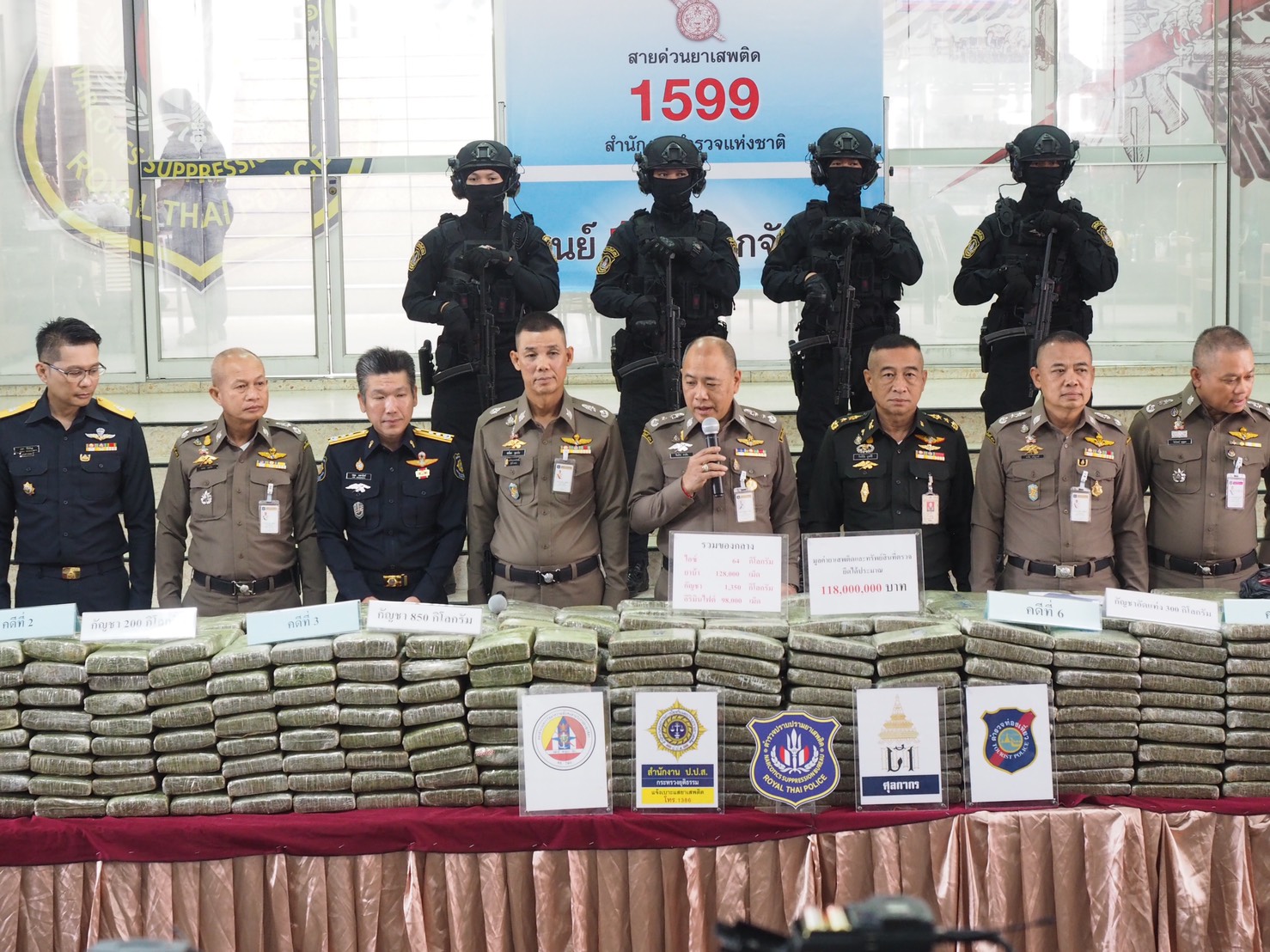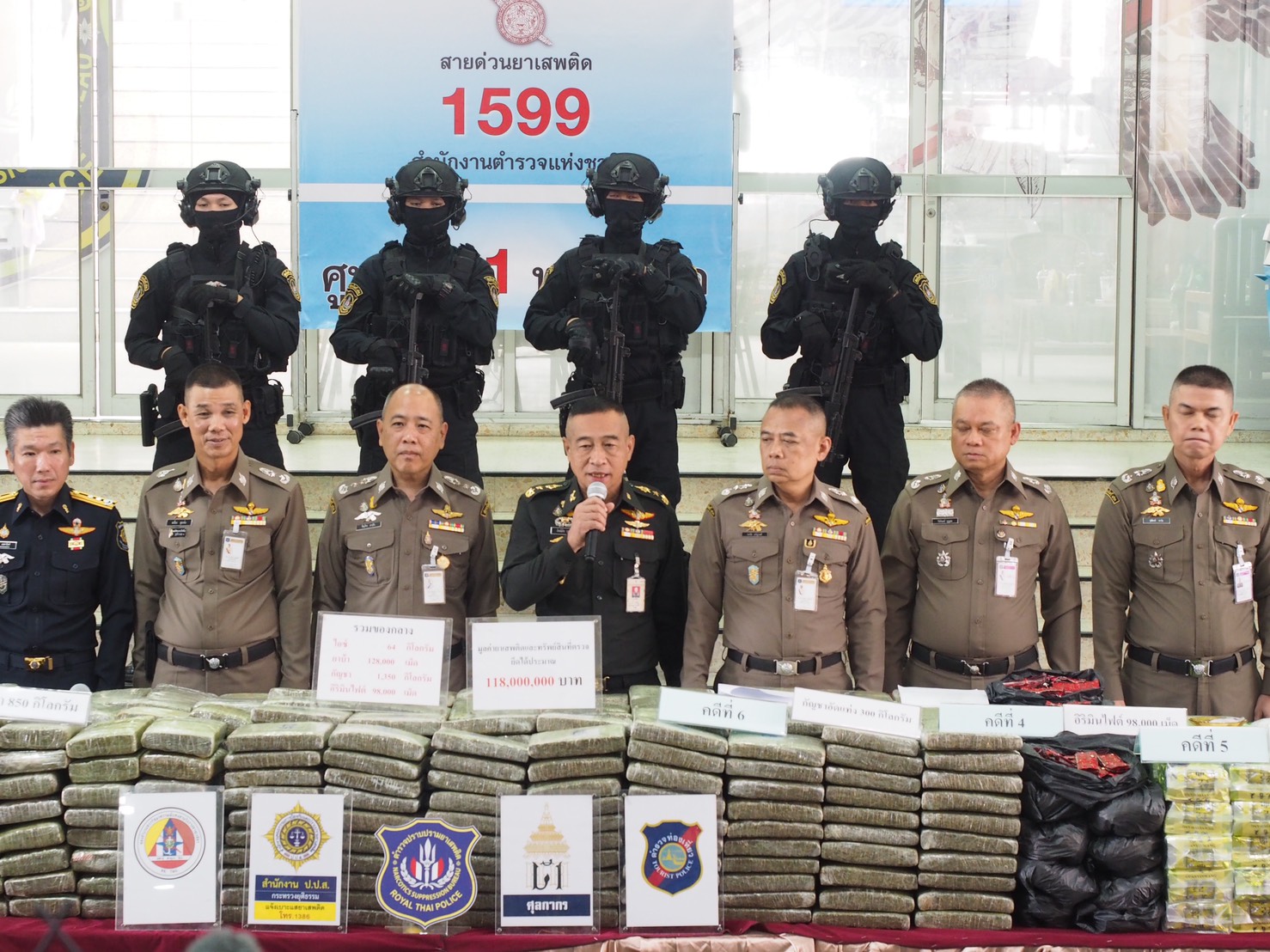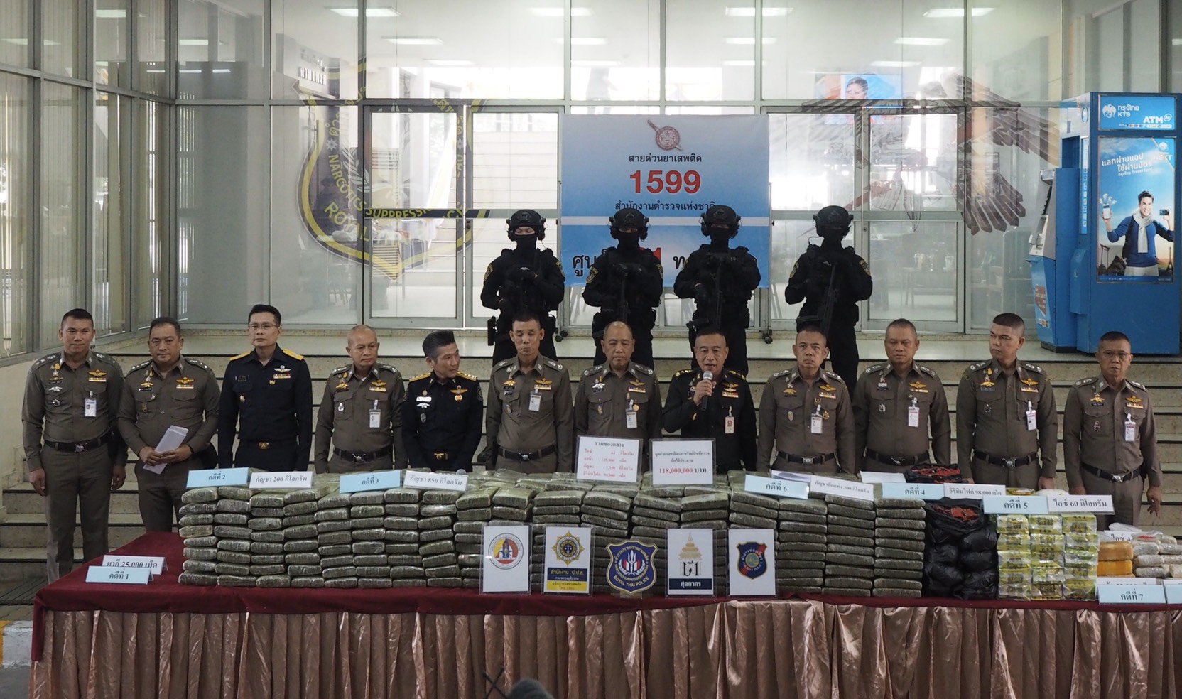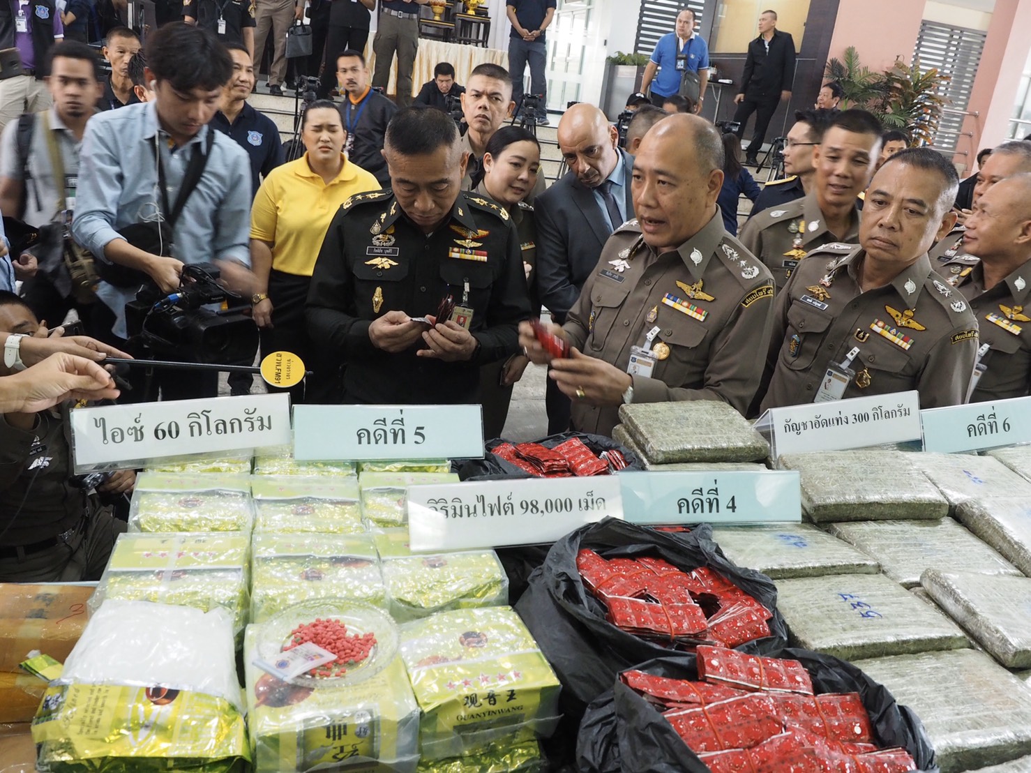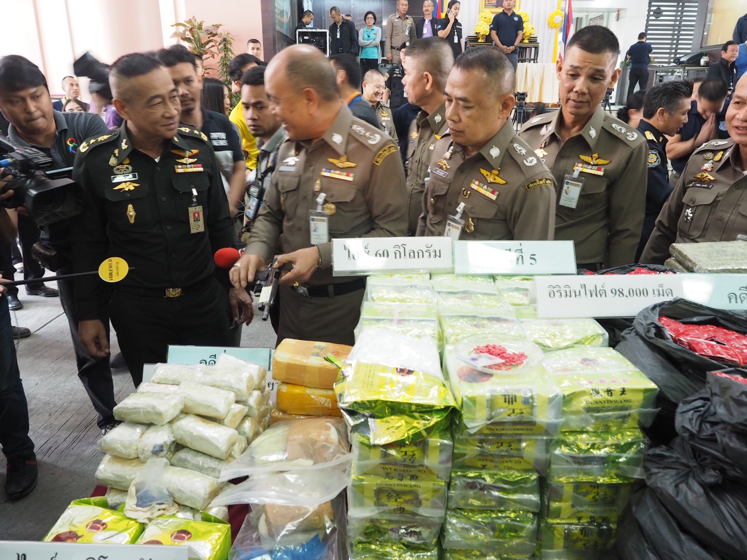 การจับกุมขบวนการค้ายาเสพติดรายสำคัญ กองอำนวยการรักษาความมั่นคงภายในราชอาณาจักร (กอ.รมน.) โดย พล.อ.ธีรวัฒน์ บุณยะวัฒน์ เลขาธิการ กอ.รมน. มอบหมาย พล.ท.กิตติธัช บุพศิริ ผู้อำนวยการศูนย์ประสานการปฏิบัติที่ 2 (ผอ.ศปป.2 กอ.รมน.) ร่วมแถลงข่าวการบูรณาการขับเคลื่อน การแก้ไขปัญหายาเสพติด ร่วมกับ พล.ต.ท.วิสนุ ปราสาททองโอสถ ผช.ผบ.ตร.,พล.ต.ท.ชินภัทร สารสิน ผบช.ปส. ตลอดจน ผู้แทนสำนักงาน ป.ป.ส. และหน่วยภาคีเครือข่าย แถลงข่าวการจับกุมขบวนการค้ายาเสพติดรายสำคัญ เมื่อวันพุธที่ 11 ธันวาคม 2562 ณ กองบัญชาการตำรวจปราบปรามยาเสพติด จำนวนทั้งสิ้น 8 คดี ห้วงเวลาการจับกุม 27 พ.ย.-10 ธ.ค.2562 สถานที่จับกุม สนามบินสุวรรณภูมิ จว.สมุทรปราการ, อ.บ้านไผ่ อ.โนนศิลา จว.ขอนแก่น ,อ.โนนสะอาด จว.อุดรธานี ,อ.รัตภูมิ จว.สงขลา,อ.หาดใหญ่ จว.สงขลา,อ.เมือง จว.เชียงราย, เขตหลักสี่ กทม.,อ.แม่สาย จว.เชียงราย ,อ.กุมภวาปี จว.อุดรธานี,อ.ลาดยาว จว.นครสวรรค์ และ อ.กาญจนดิษฐ์ จว.สุราษฎร์ธานี สามารถจับกุมตัวผู้ต้องหาทั้งหมด 19 คน ของกลาง ยาบ้า จำนวนประมาณ 128,000 เม็ด,ไอซ์ น้ำหนักประมาณ 64 กิโลกรัม ,กัญชา น้ำหนักประมาณ 1,270 กิโลกรัม ,อิริมินไฟต์ จำนวนประมาณ 98,000 เม็ด และยึดทรัพย์สินได้จำนวนมาก