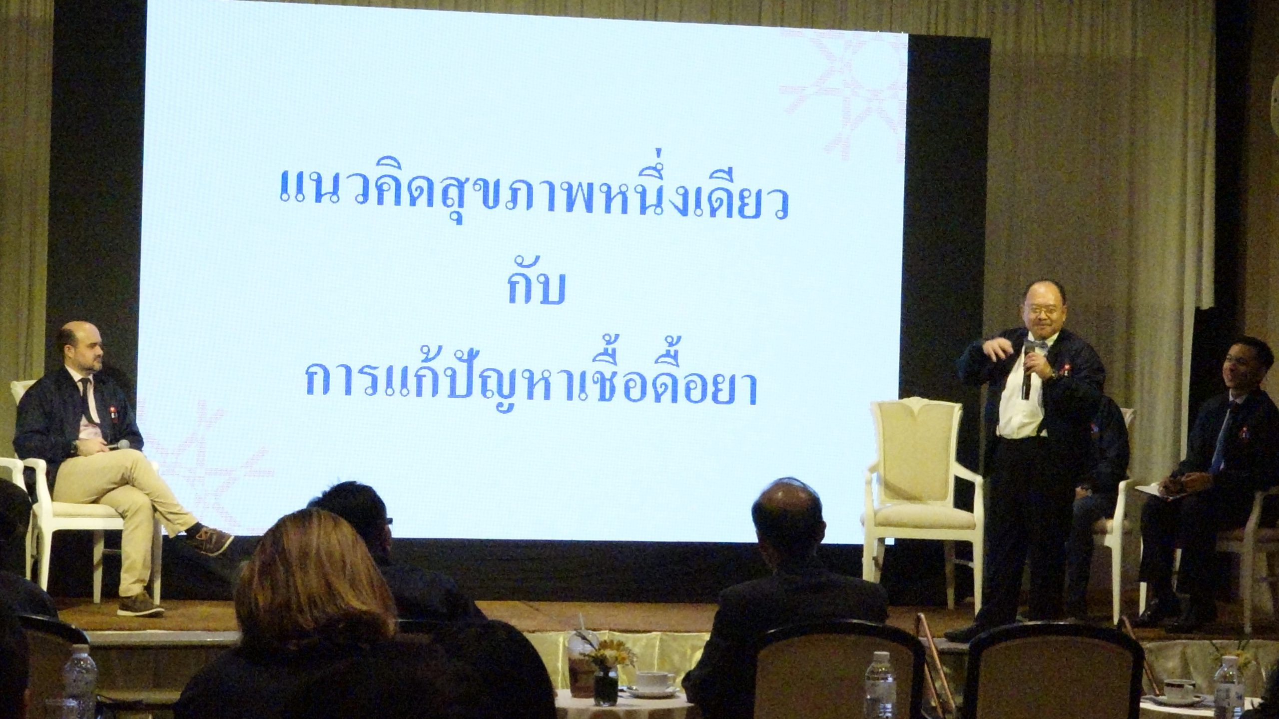 ในโอกาสนี้ รองศาสตราจารย์ นายแพทย์สรนิต ศิลธรรม ปลัดกระทรวงการอุดมศึกษา วิทยาศาสตร์ วิจัยและนวัตกรรม ได้แสดงปาฐกถา เรื่อง “กระทรวงการอุดมศึกษาฯ กับ วิกฤติเชื้อดื้อยา” พร้อมทั้ง มีผู้ทรงคุณวุฒิ ร่วมเสวนาเรื่อง “สุขภาพหนึ่งเดียว: ทางเลือก และ ทางรอด จากวิกฤติเชื้อดื้อยา” โดย โครงการวิจัย“สุขภาพหนึ่งเดียวและการดื้อยาปฏิชีวนะในประเทศไทย”เป็นความร่วมมือระหว่าง3สถาบัน คือมหาวิทยาลัยมหิดล โดย คณะสังคมศาสตร์และมนุษยศาสตร์ คณะแพทยศาสตร์ศิริราชพยาบาล คณะสัตวแพทยศาสตร์ ร่วมกับ มหาวิทยาลัยบริสตอล สหราชอาณาจักรและมหาวิทยาลัยเครือข่าย และสถาบันวิจัยจุฬาภรณ์ ภายใต้ทุนสนับสนุนจาก Medical Research Council สหราชอาณาจักร เพื่อศึกษาปัจจัยที่ก่อให้เกิดเชื้อดื้อยาปฏิชีวนะ ที่มุ่งเน้นการศึกษาขนาดปัญหา และปัจจัยที่เกี่ยวข้องกับการดื้อยาปฏิชีวนะในคน สัตว์ พืช อาหาร และสิ่งแวดล้อม ภายใต้แนวคิดสุขภาพหนึ่งเดียว (One Health approach)